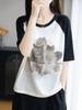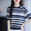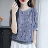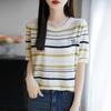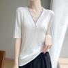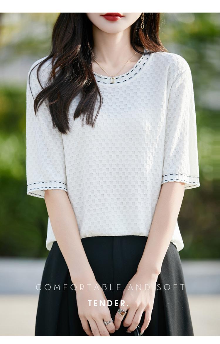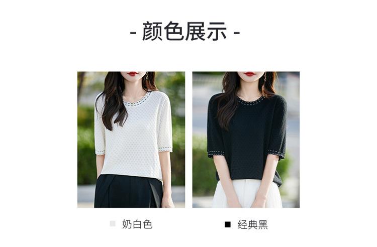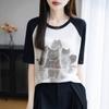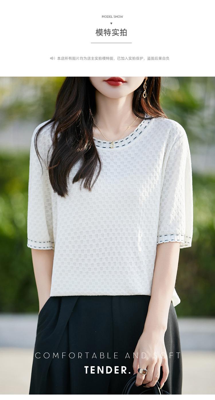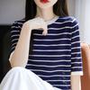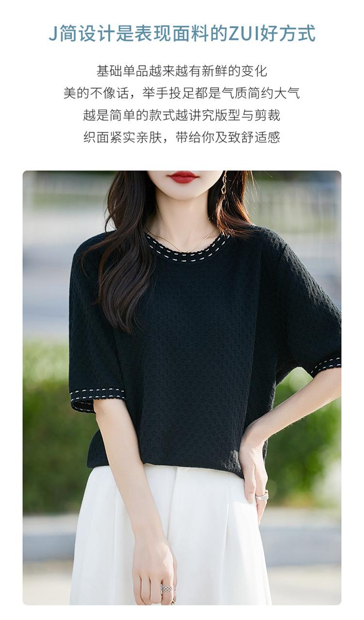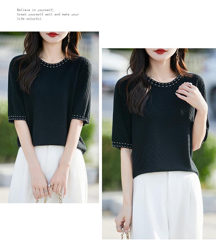 2025 Nuevo Verano Tencel Lyocell Cuello Redondo Tejido de Punto Camiseta Manga Tres Cuartos para Mujer Jersey de Color Contrastante Camiseta Básica