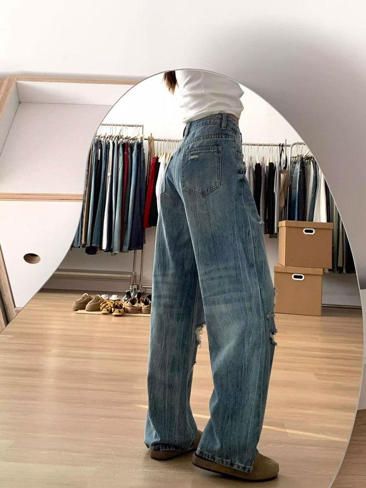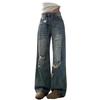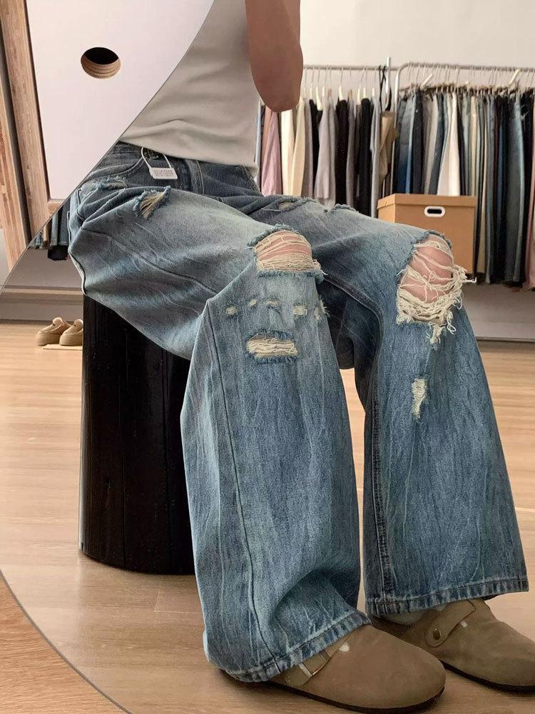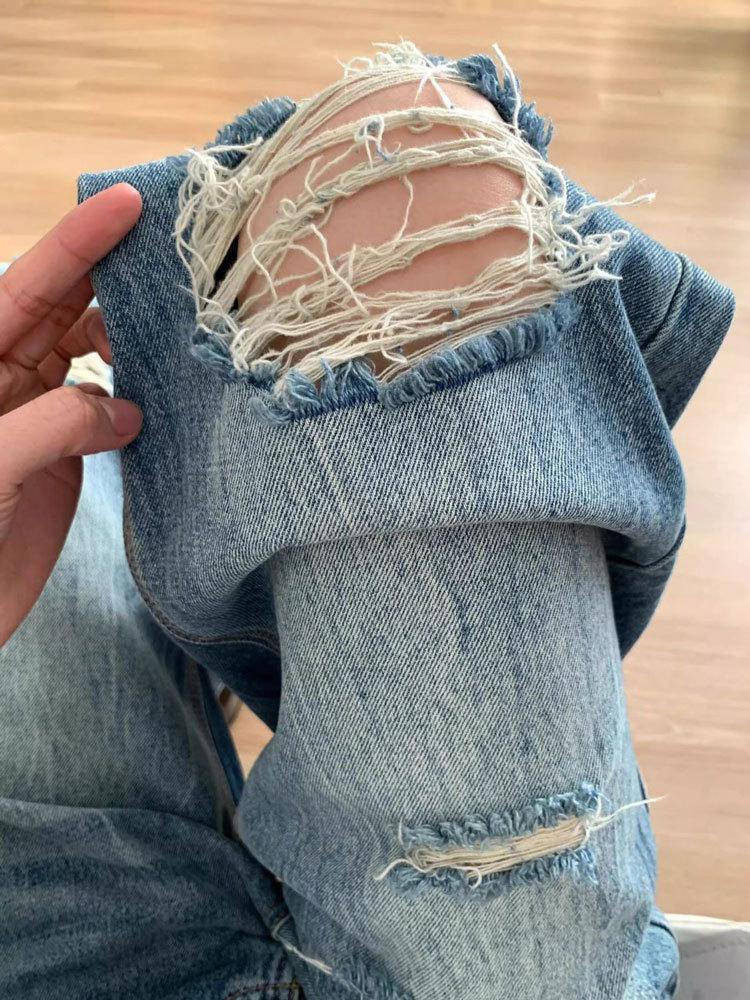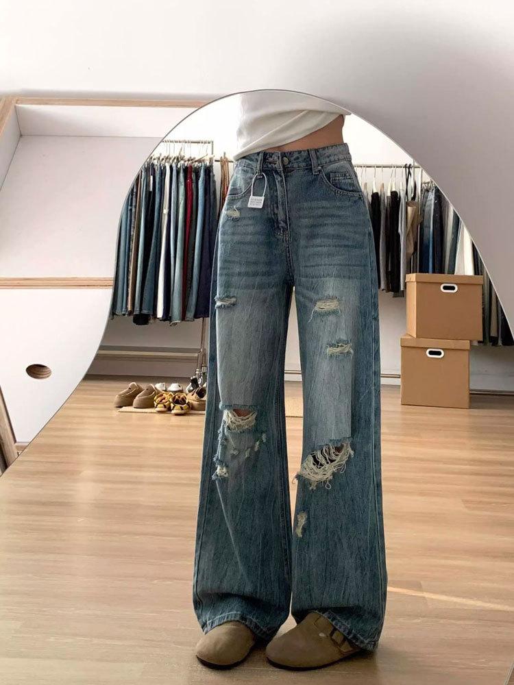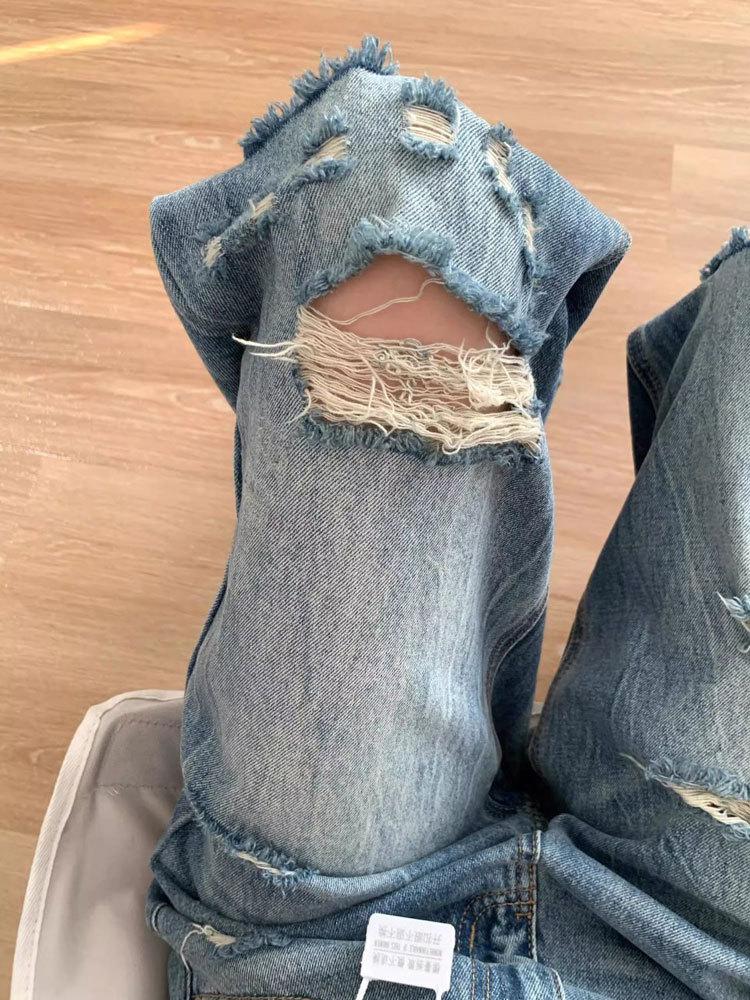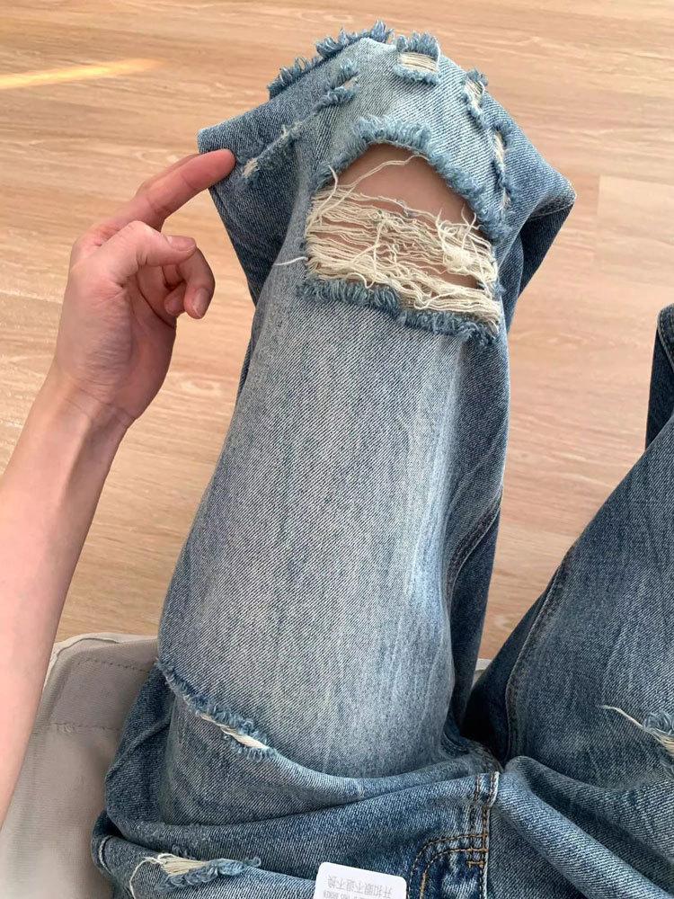 Jeans de mujer verano 2025 nuevos rotos talla grande lavados americanos adelgazantes holgados versátiles hasta el suelo de pierna ancha