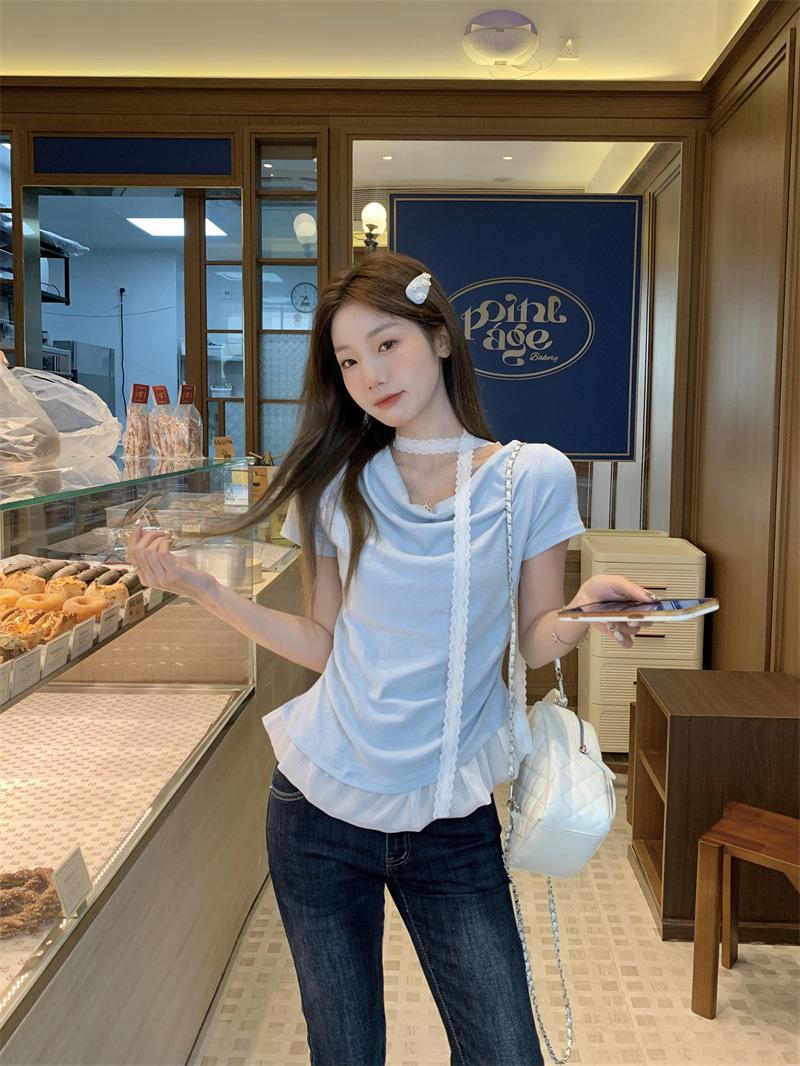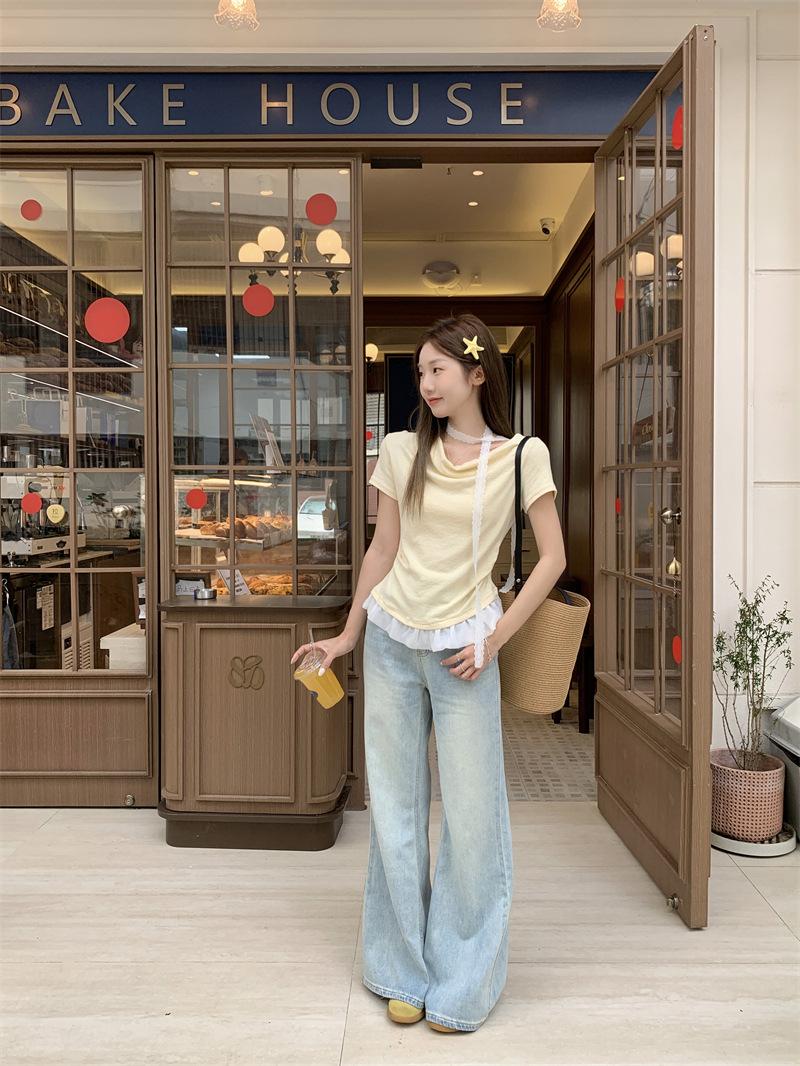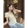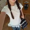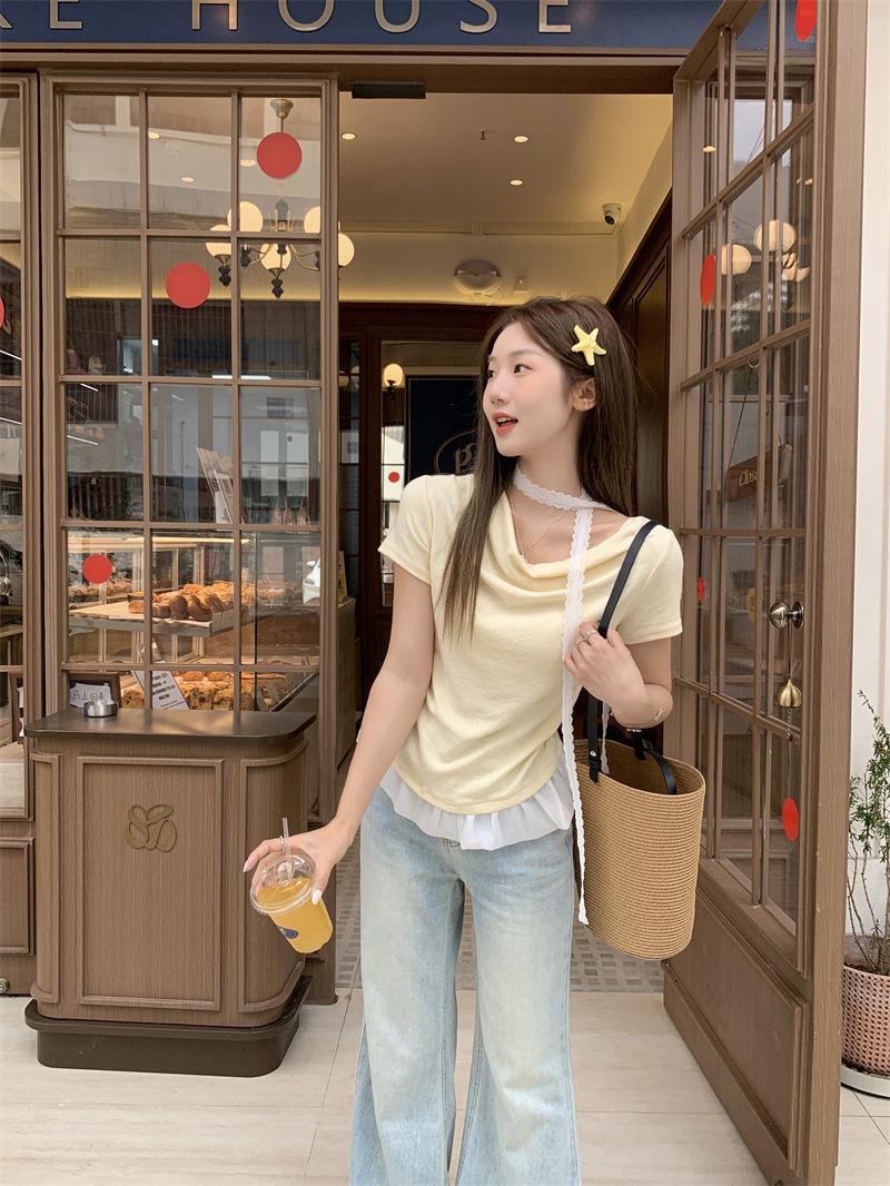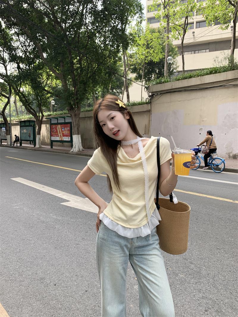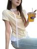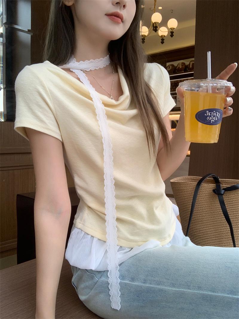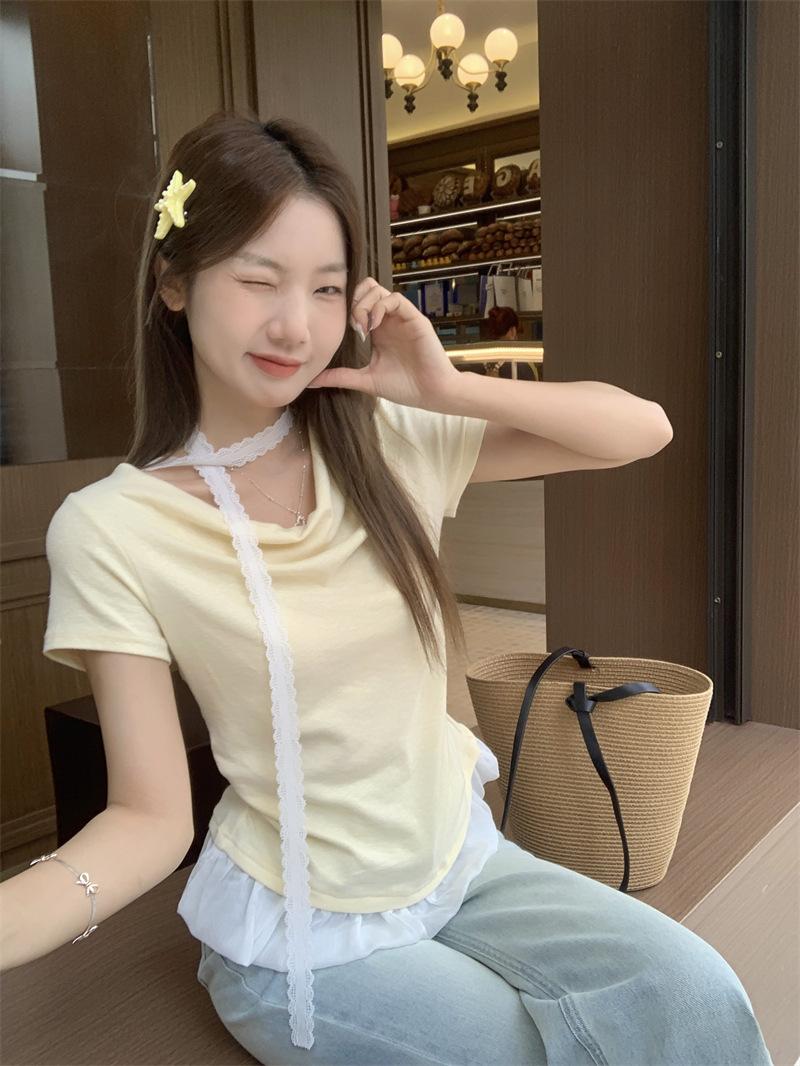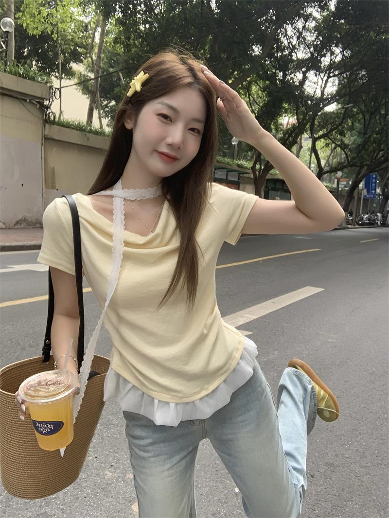 Estilo de Chica Dulce y Gentil Nueva Camiseta de Encaje con Empalme de Manga Corta Ajustada para Mujer Verano Look Adelgazante Top Amarillo Versátil