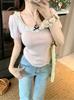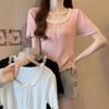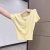 Camiseta de manga corta con cuello en U, corte entallado y hombros rectos para mujer, diseño de botones de verano, estilo corto, talla pequeña, de algodón puro con hilo.