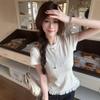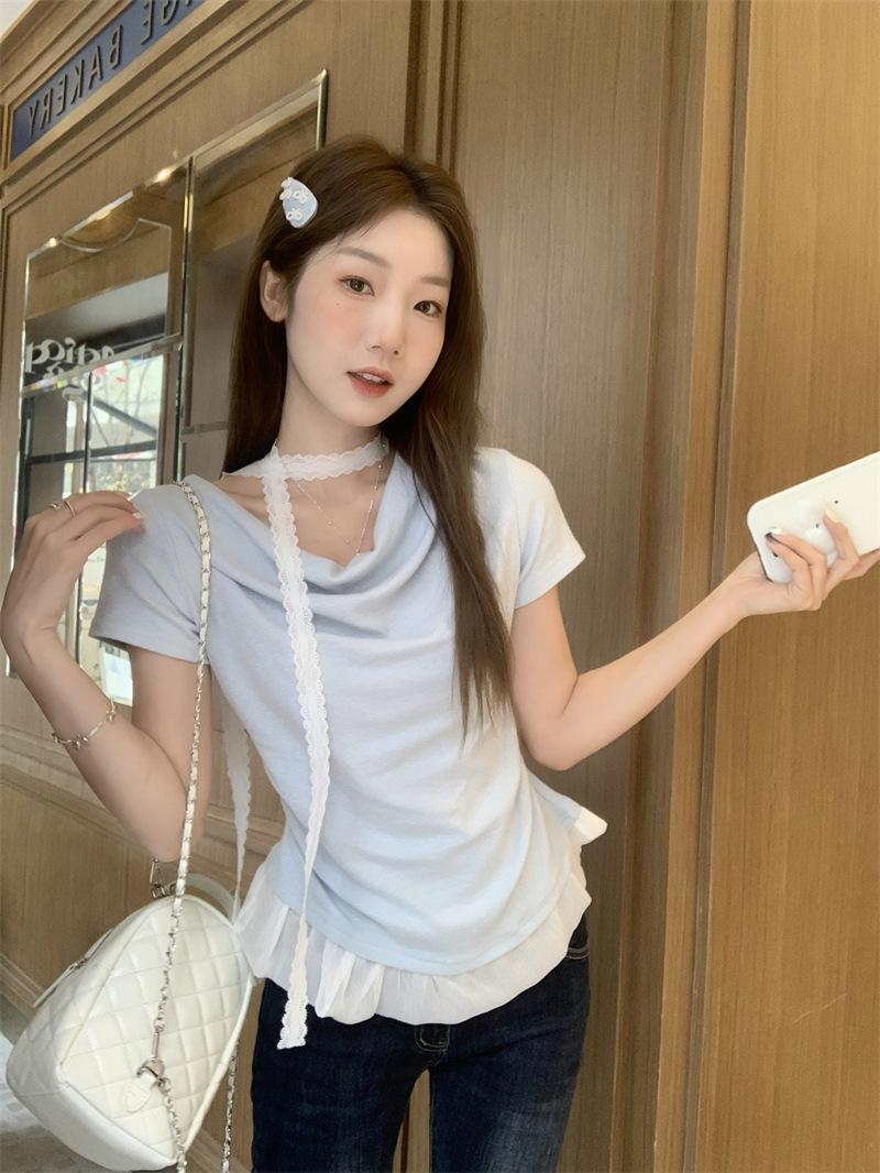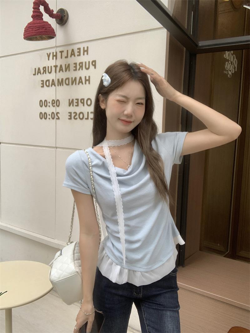 Camiseta de manga corta irregular para mujer, nuevo diseño de verano 2025, top corto de cintura alta y manga corta con diseño de nicho.