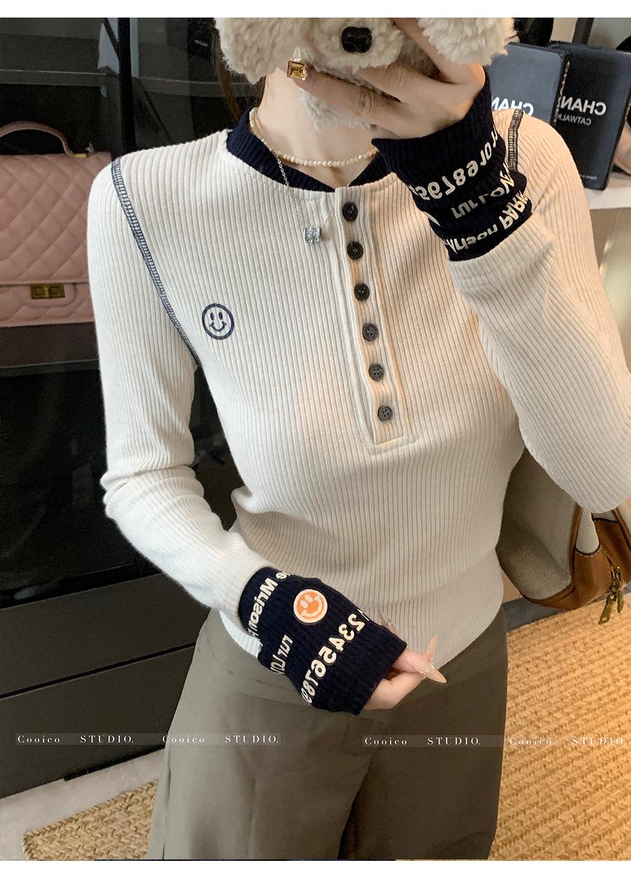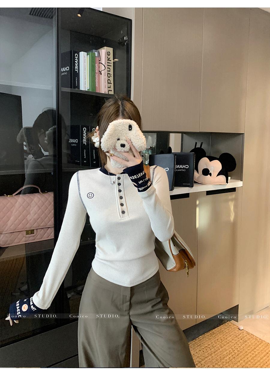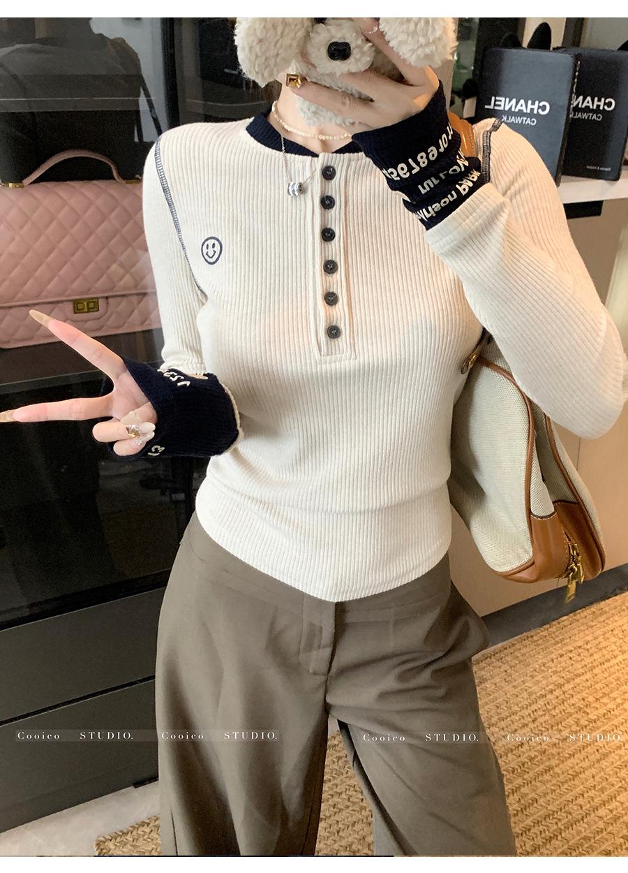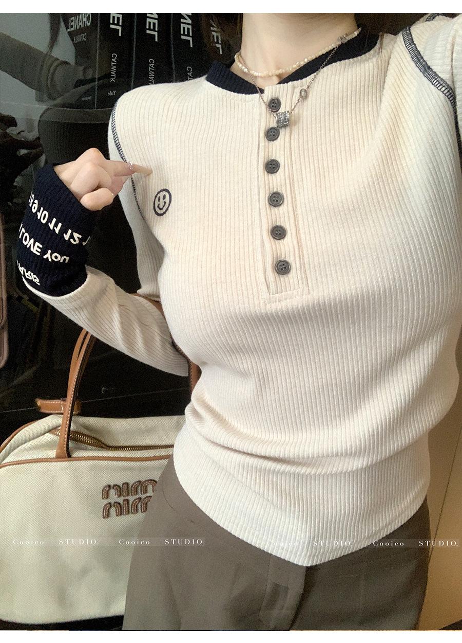 Camisa Básica de Punto Única con Cuello Semiabierto y Color en Contraste Bordado para Mujer con Diseño de Primavera 2025, Botón, Slim