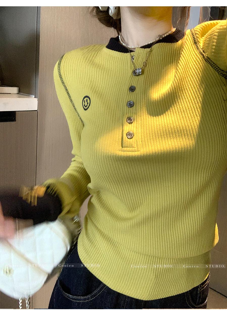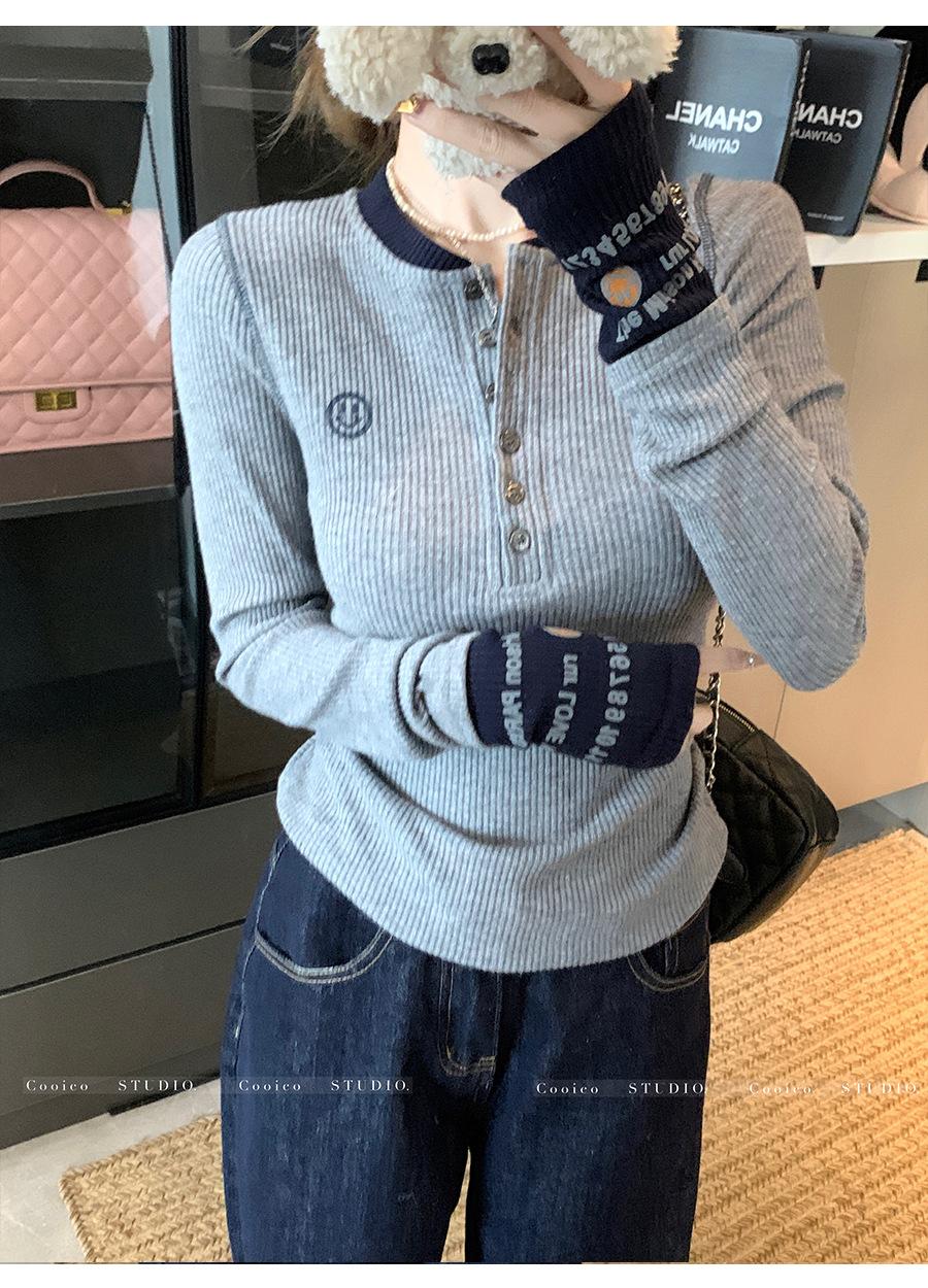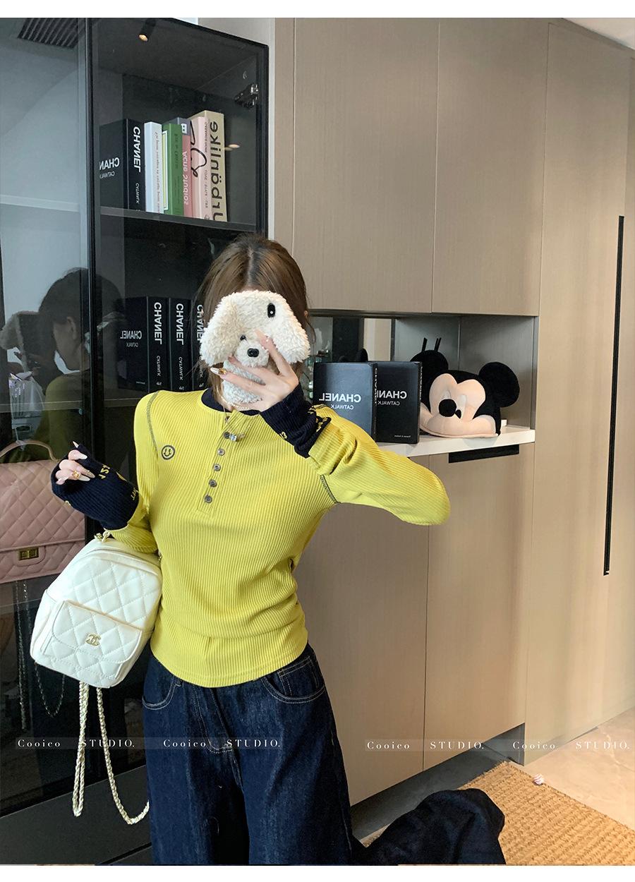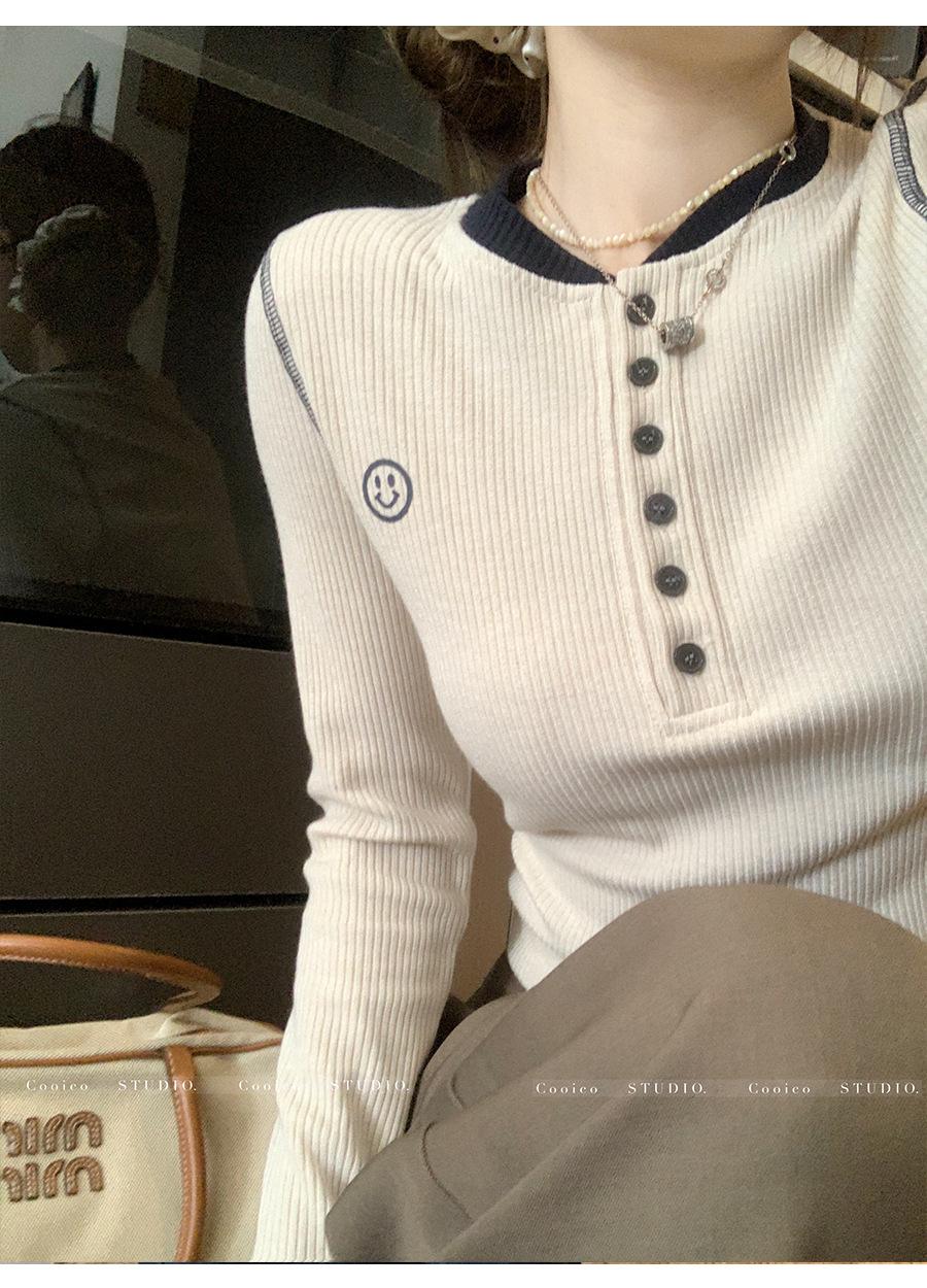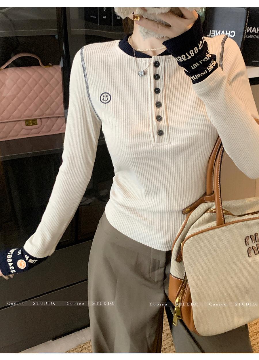 Camisa Básica de Punto Única con Cuello Semiabierto y Color en Contraste Bordado para Mujer con Diseño de Primavera 2025, Botón, Slim