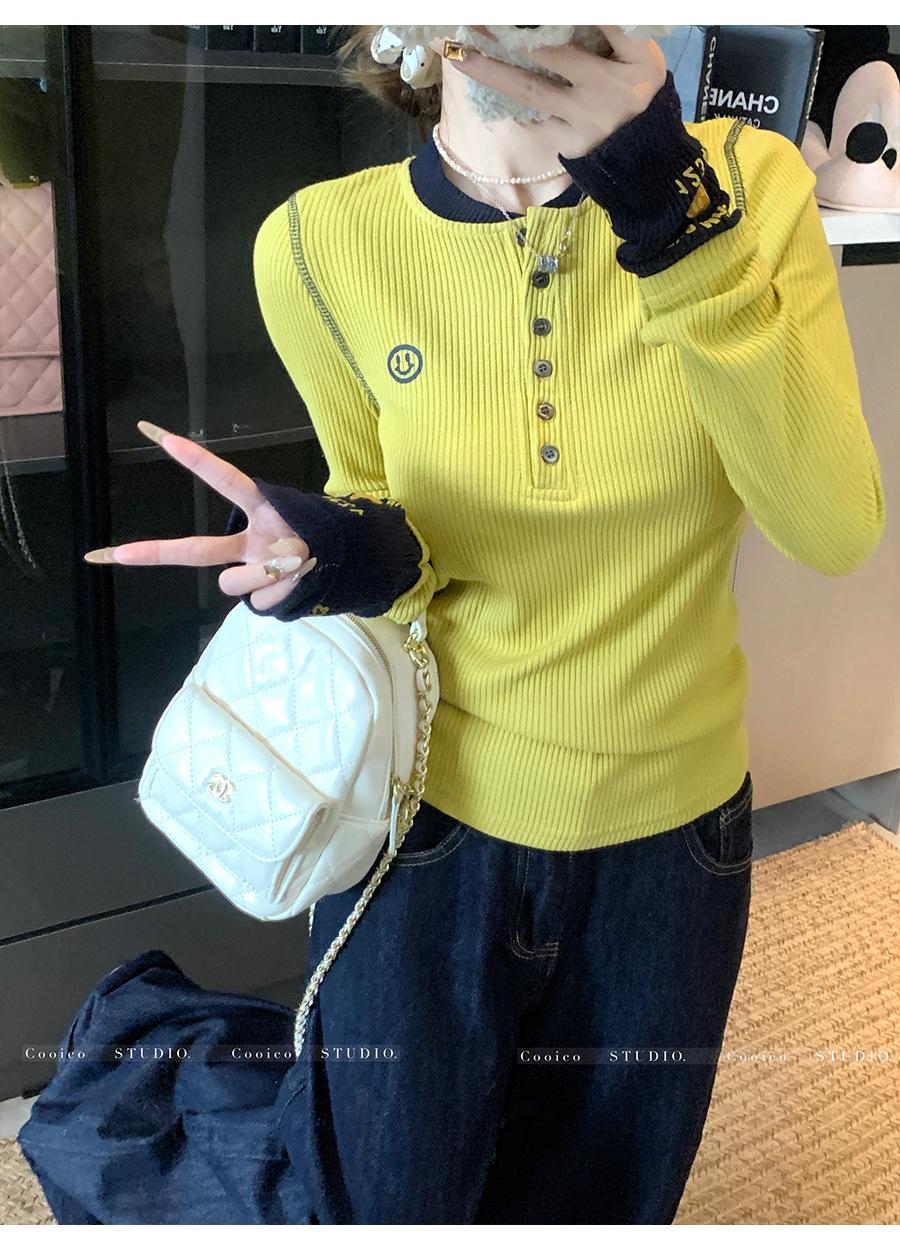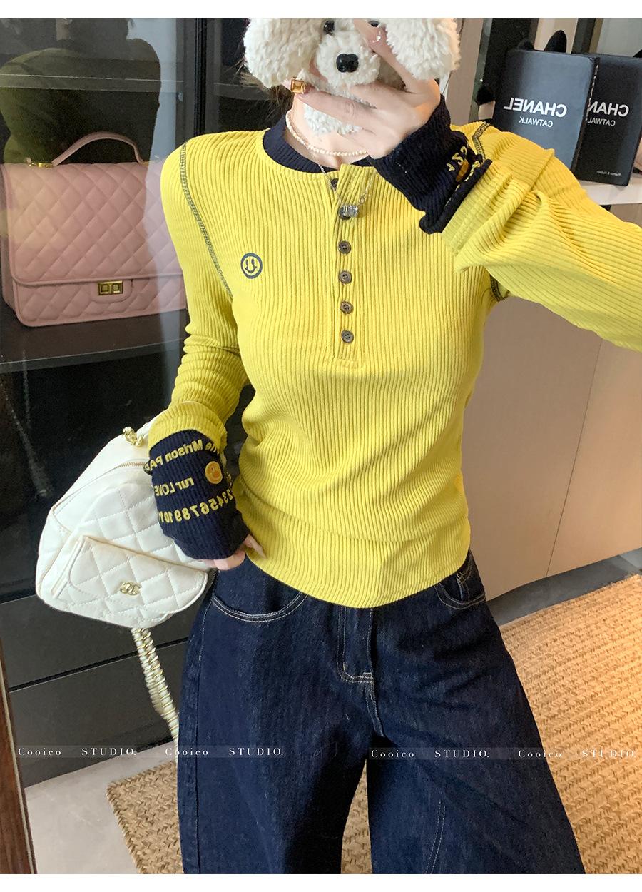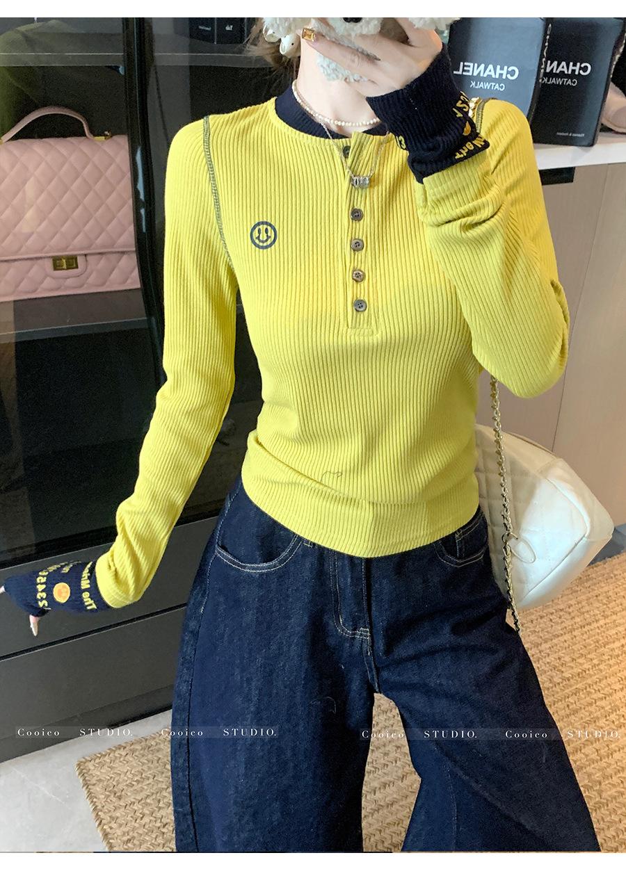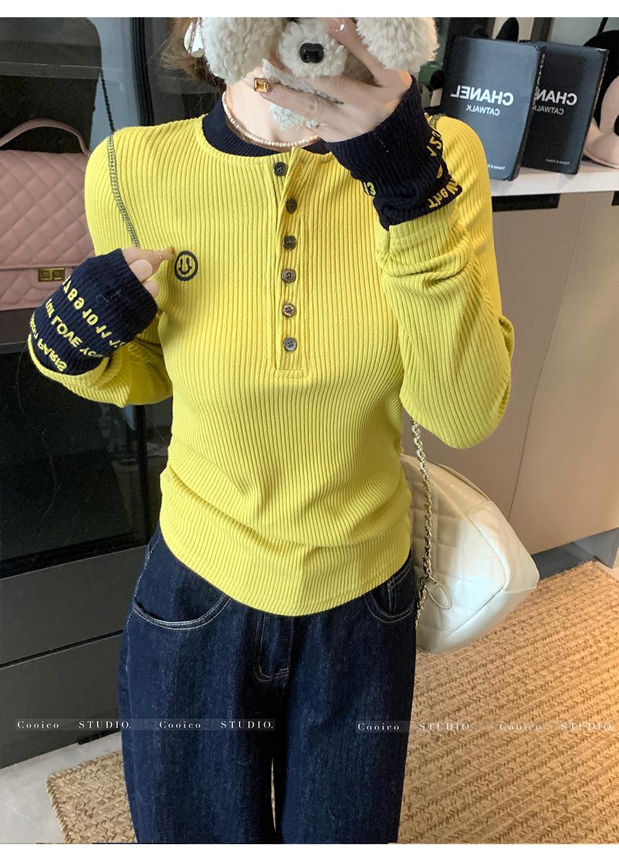 Camisa Básica de Punto Única con Cuello Semiabierto y Color en Contraste Bordado para Mujer con Diseño de Primavera 2025, Botón, Slim