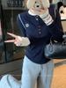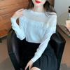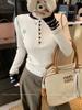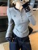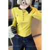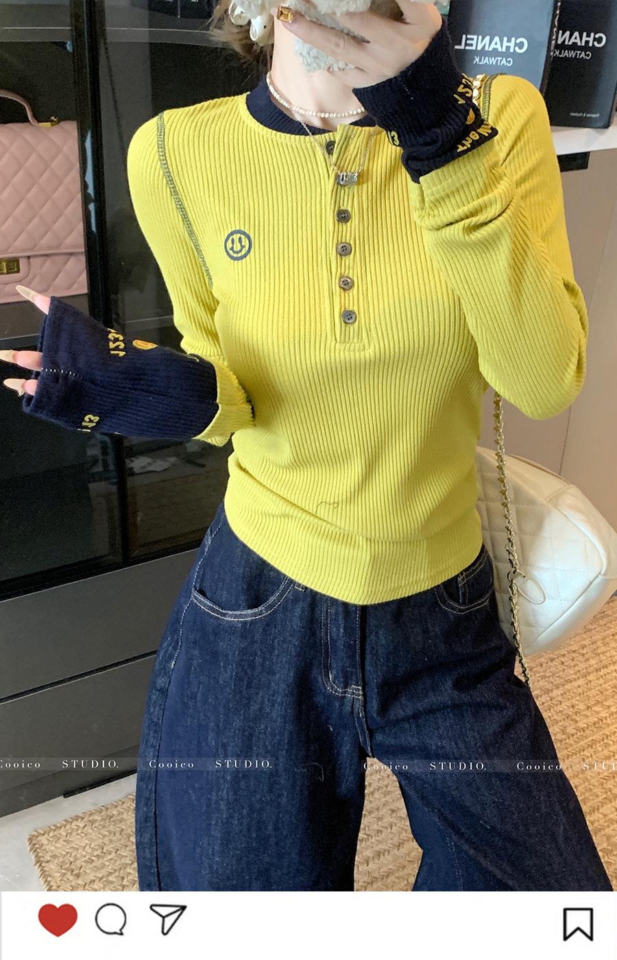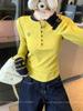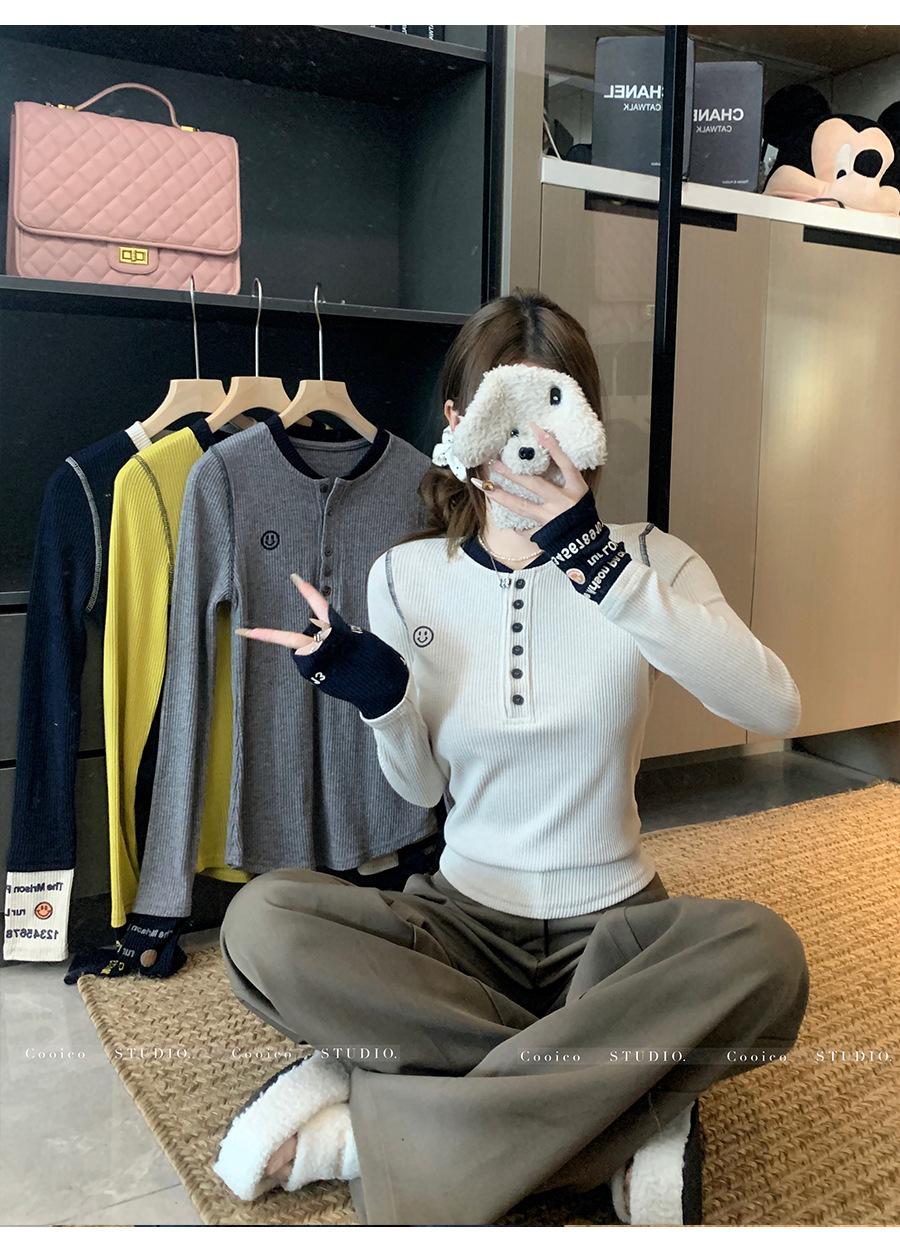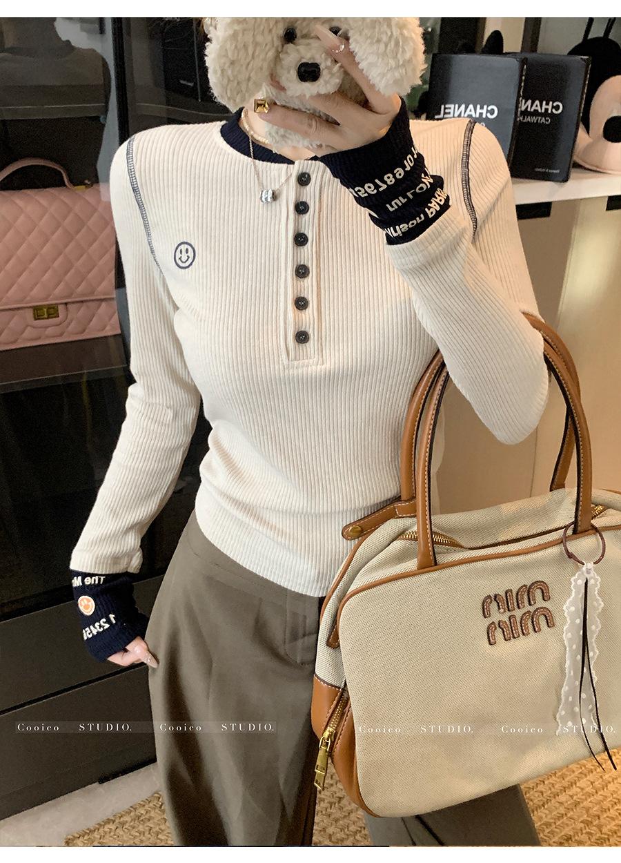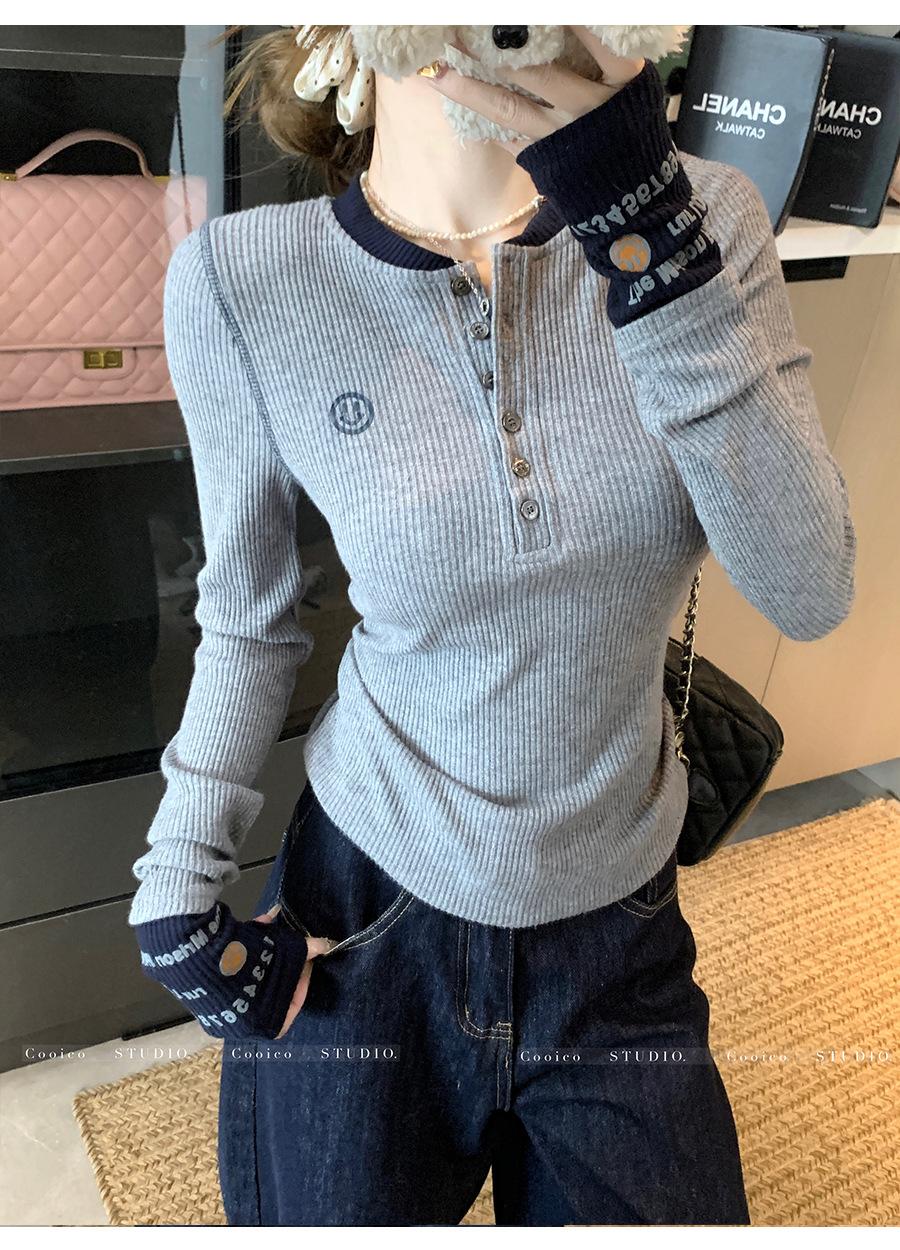 Camisa Básica de Punto Única con Cuello Semiabierto y Color en Contraste Bordado para Mujer con Diseño de Primavera 2025, Botón, Slim