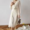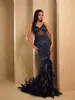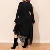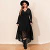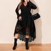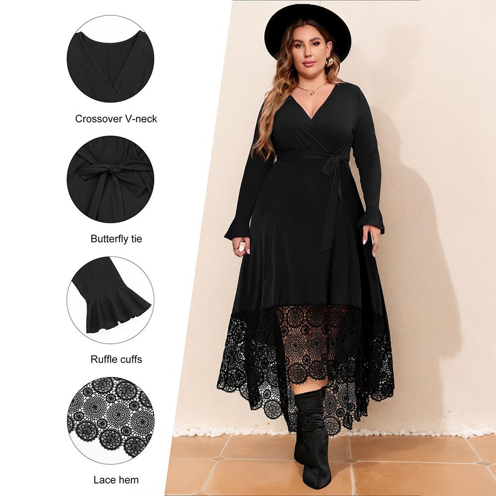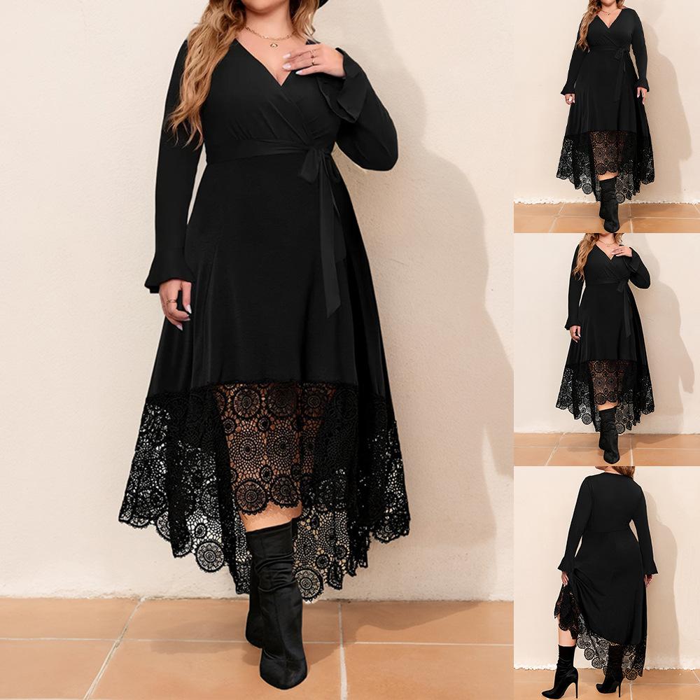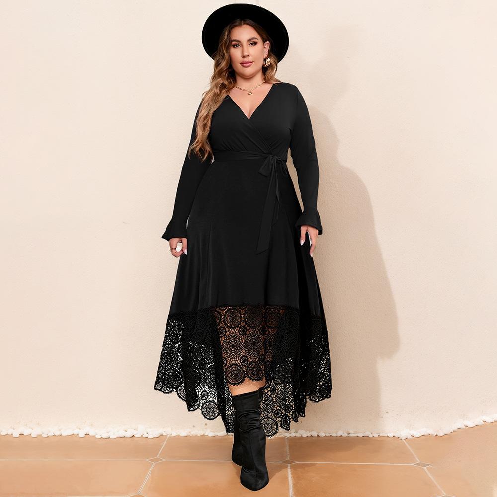 Elegante Vestido Europeo y Americano de Talla Grande con Cuello en V, Corte Trompeta, Manga Larga, Encaje Empalmado, Bajo Asimétrico y Lazo