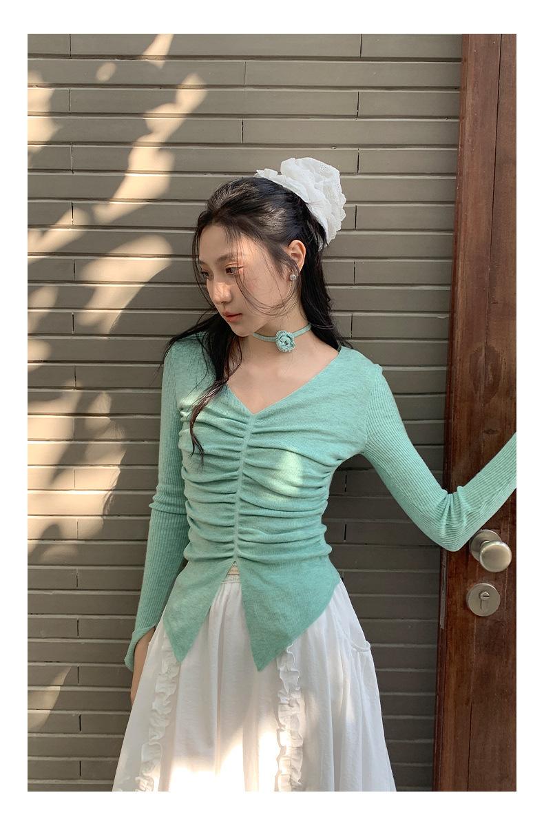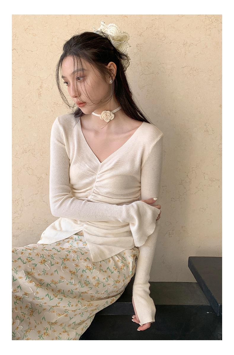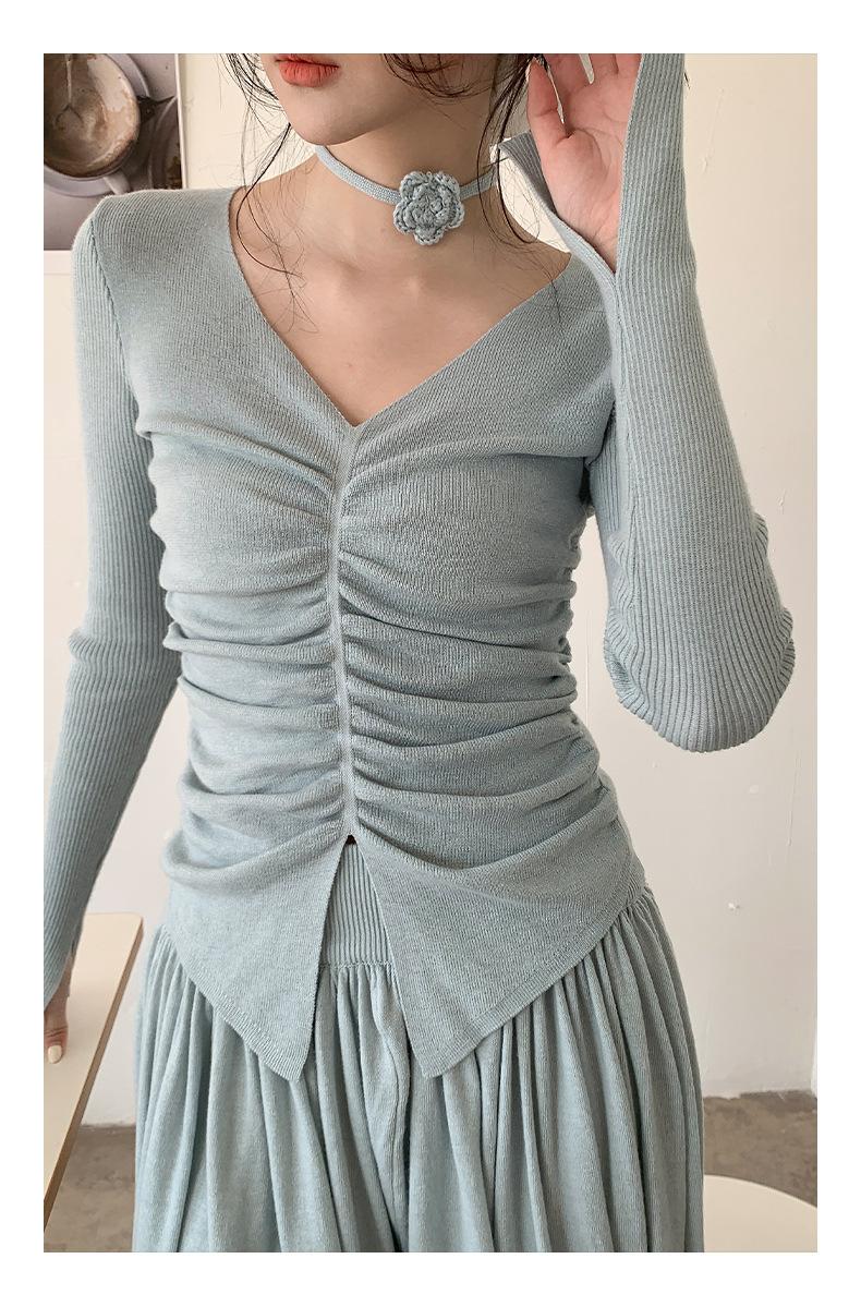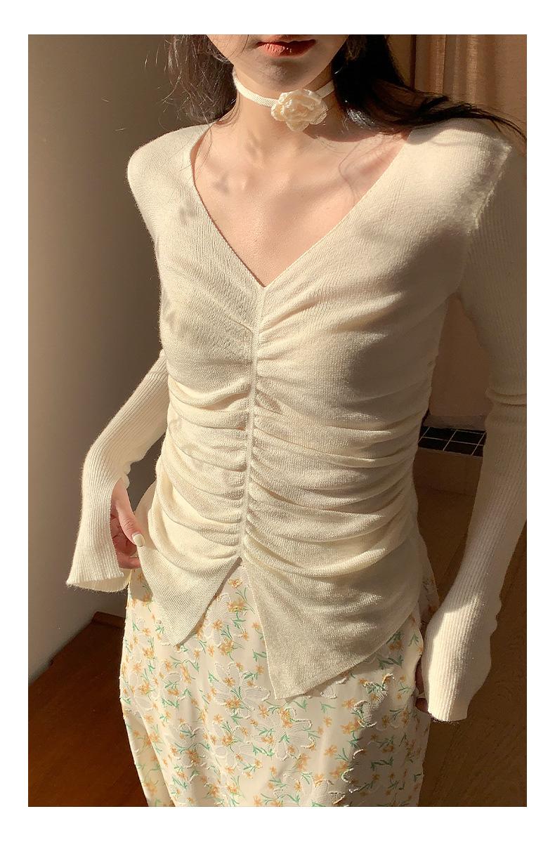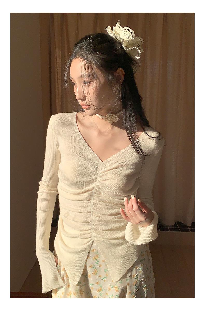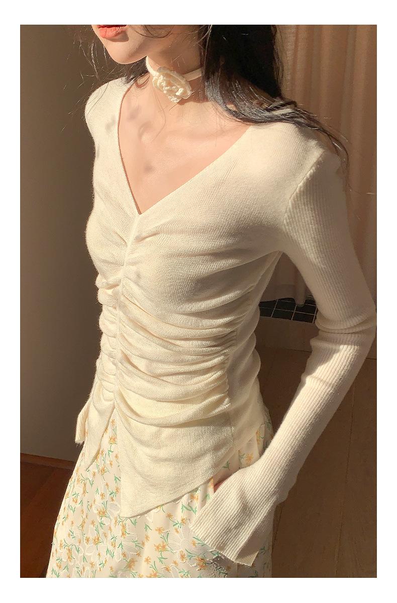 Yi Er Shan Chic Rosa Francés Sentido de Alta Gama Fruncido Adelgazante Cuello en V Suéter Tejido de Manga Larga para Mujer Temperamento 0342