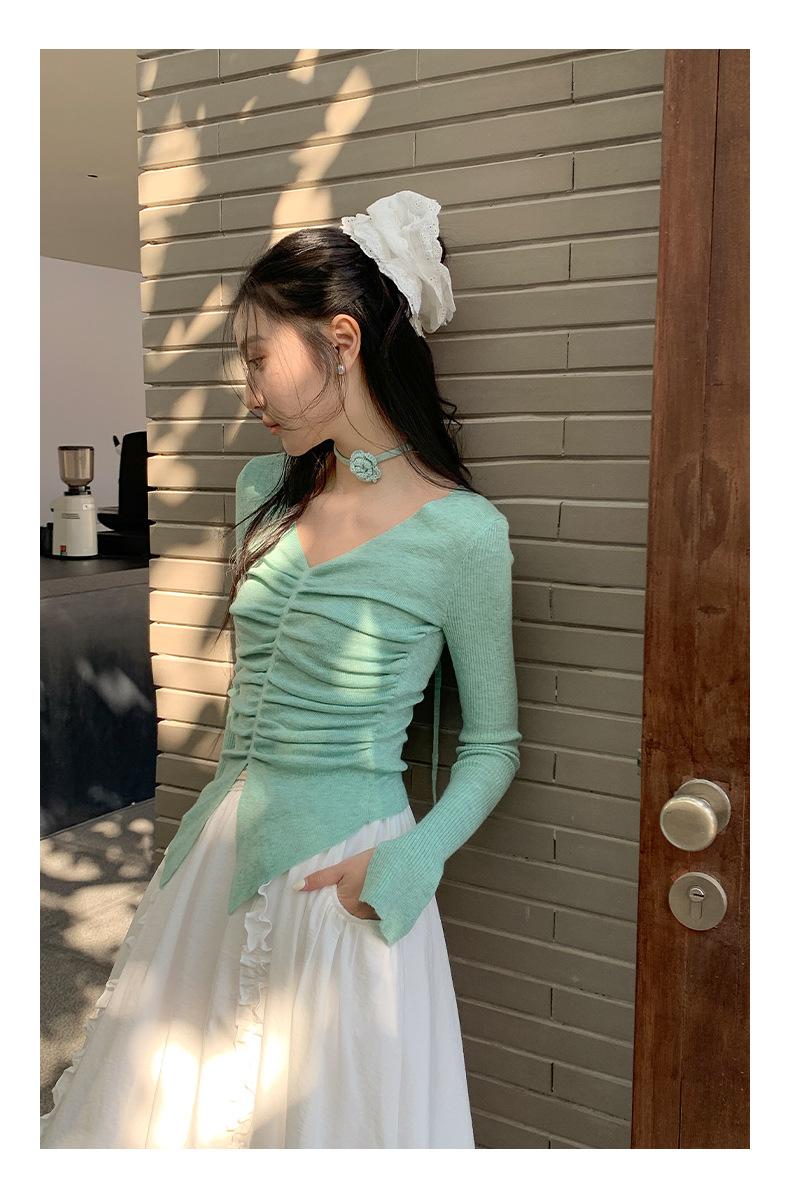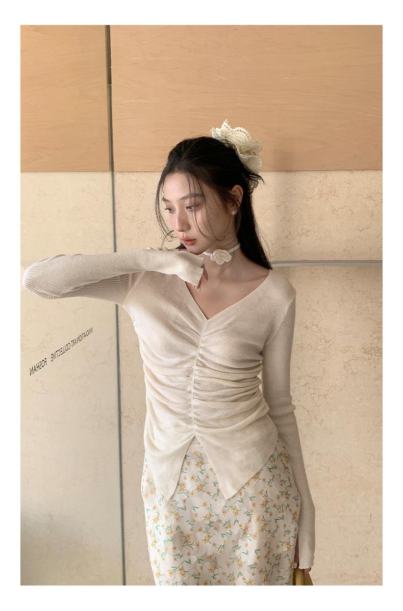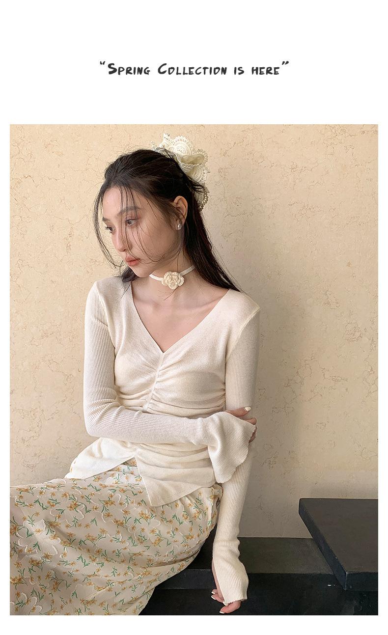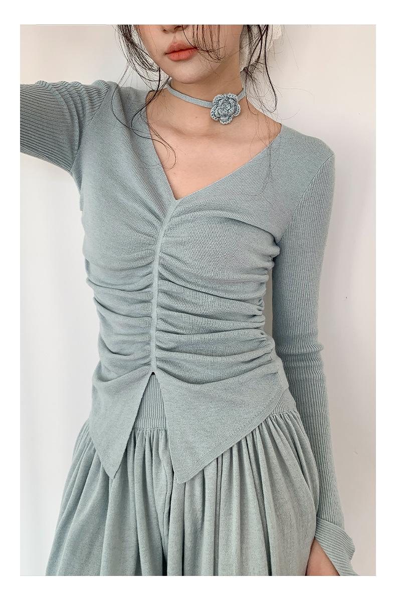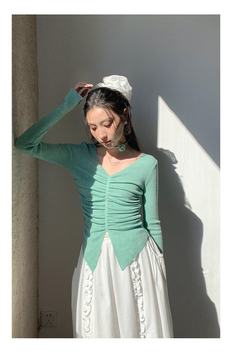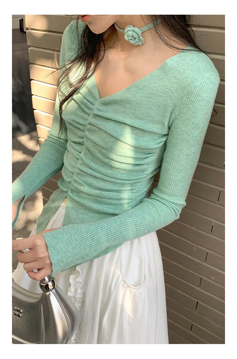 Yi Er Shan Chic Rosa Francés Sentido de Alta Gama Fruncido Adelgazante Cuello en V Suéter Tejido de Manga Larga para Mujer Temperamento 0342