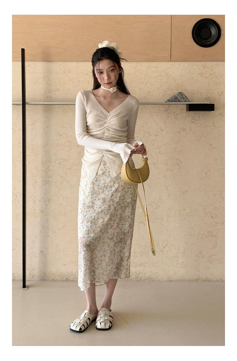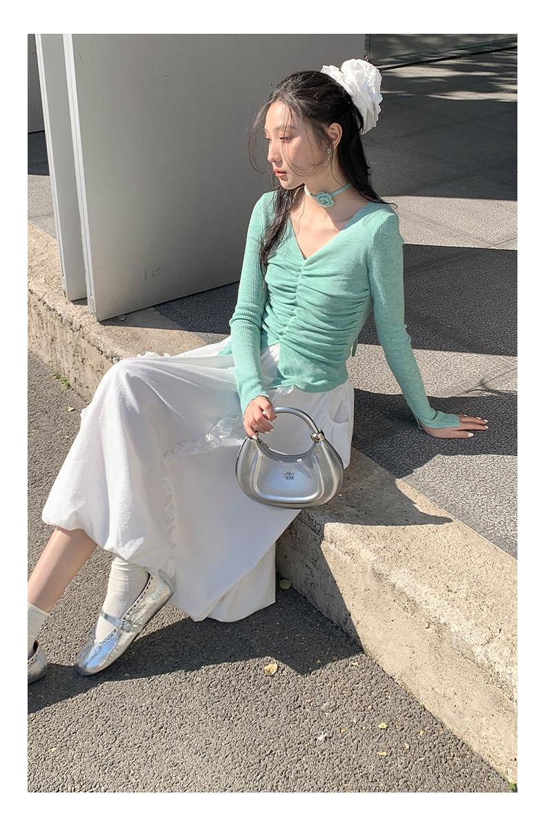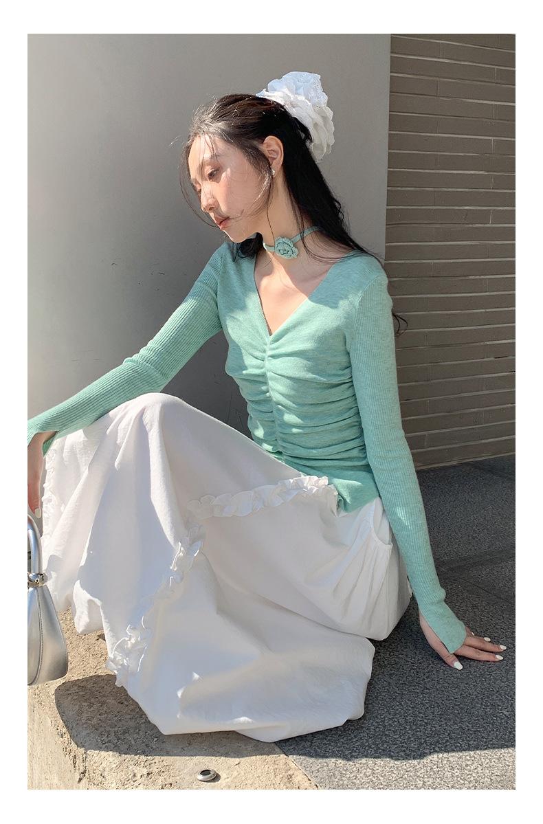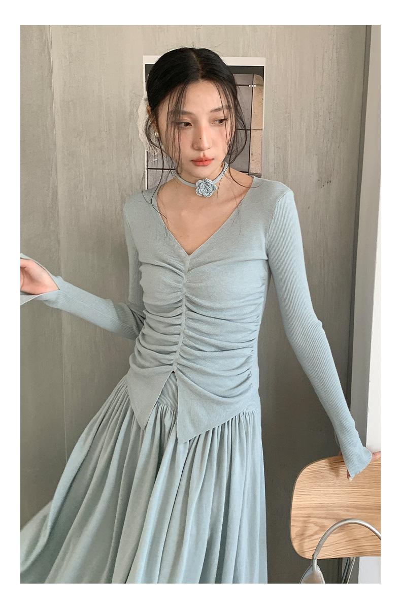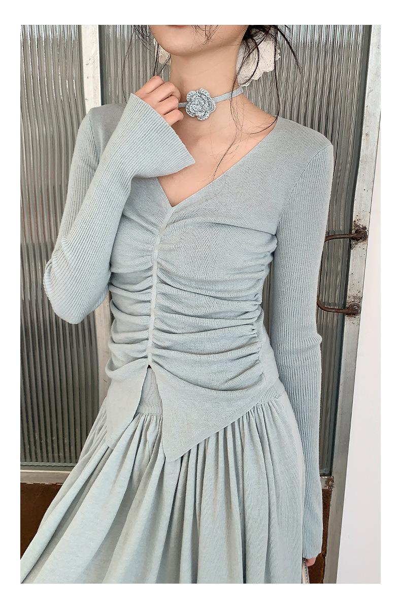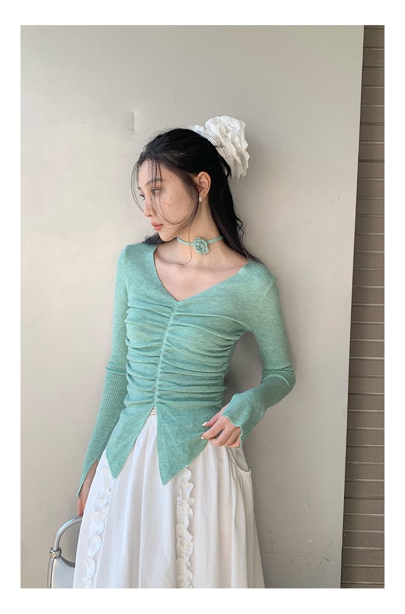 Yi Er Shan Chic Rosa Francés Sentido de Alta Gama Fruncido Adelgazante Cuello en V Suéter Tejido de Manga Larga para Mujer Temperamento 0342