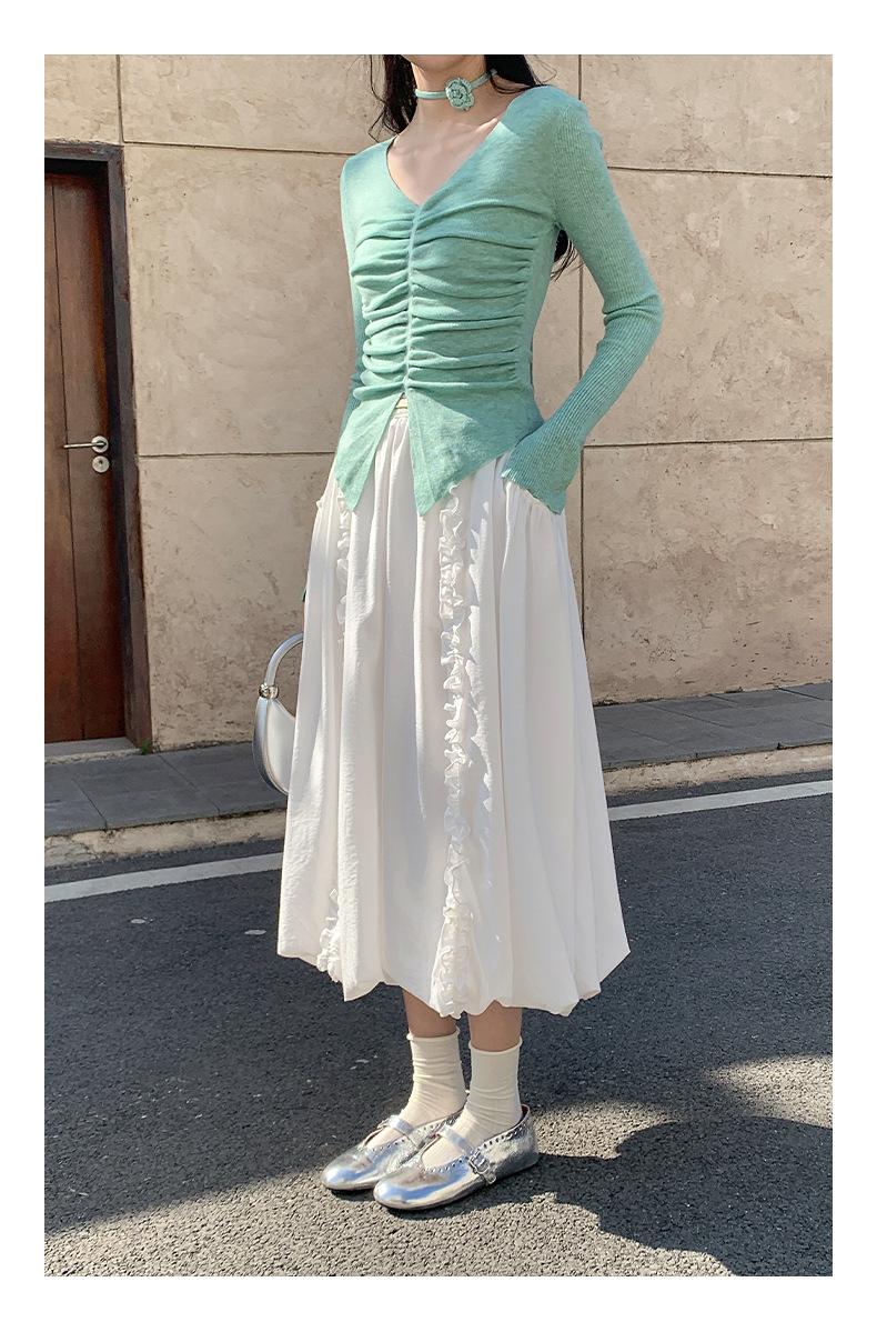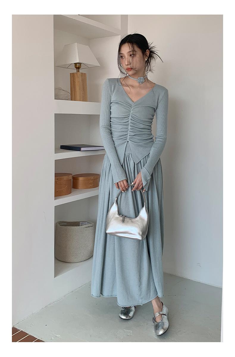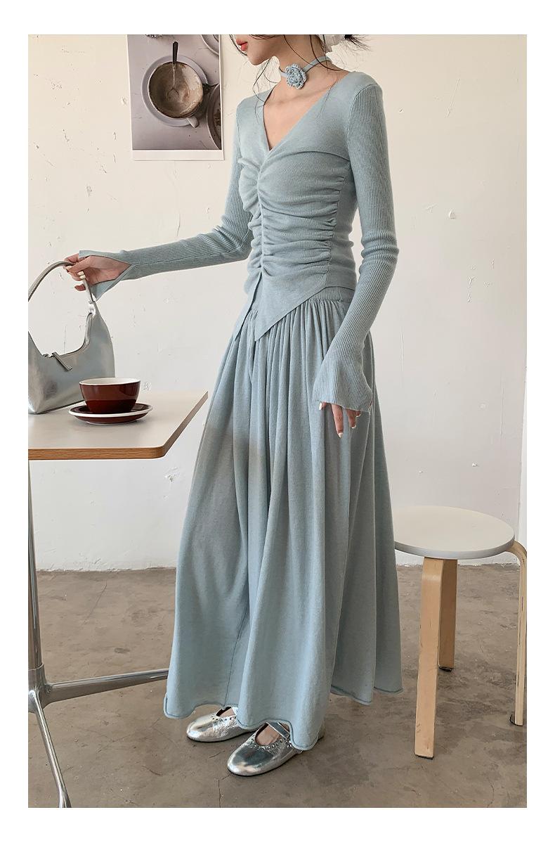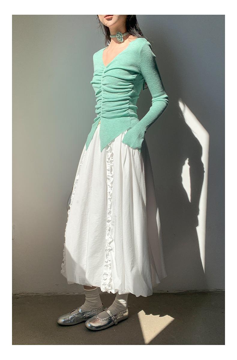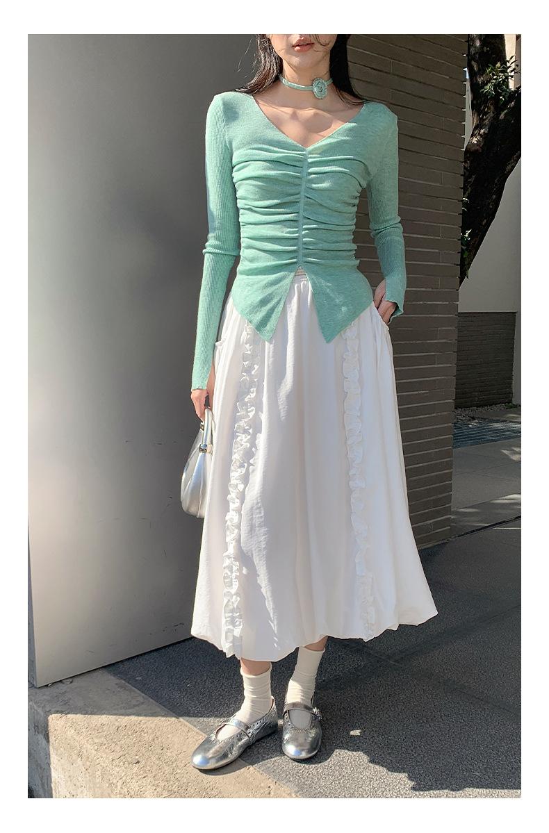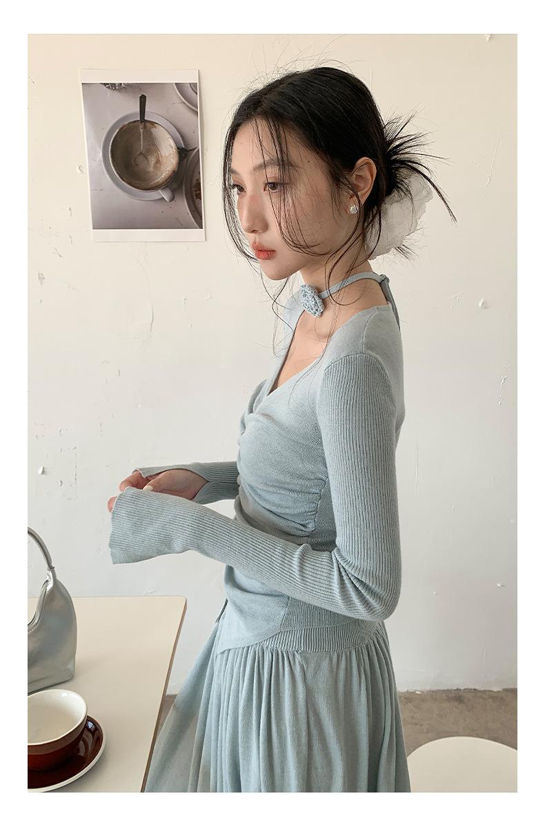 Yi Er Shan Chic Rosa Francés Sentido de Alta Gama Fruncido Adelgazante Cuello en V Suéter Tejido de Manga Larga para Mujer Temperamento 0342