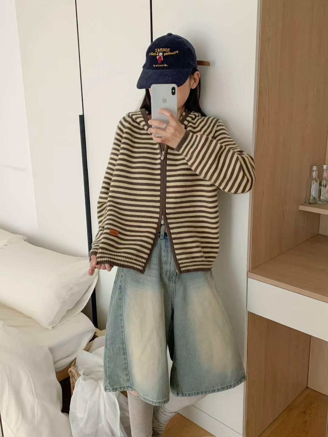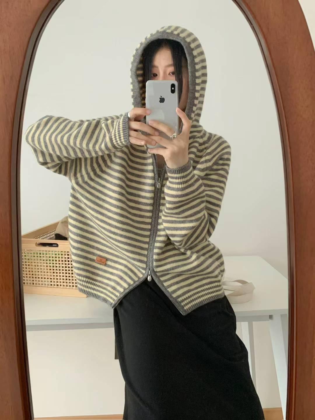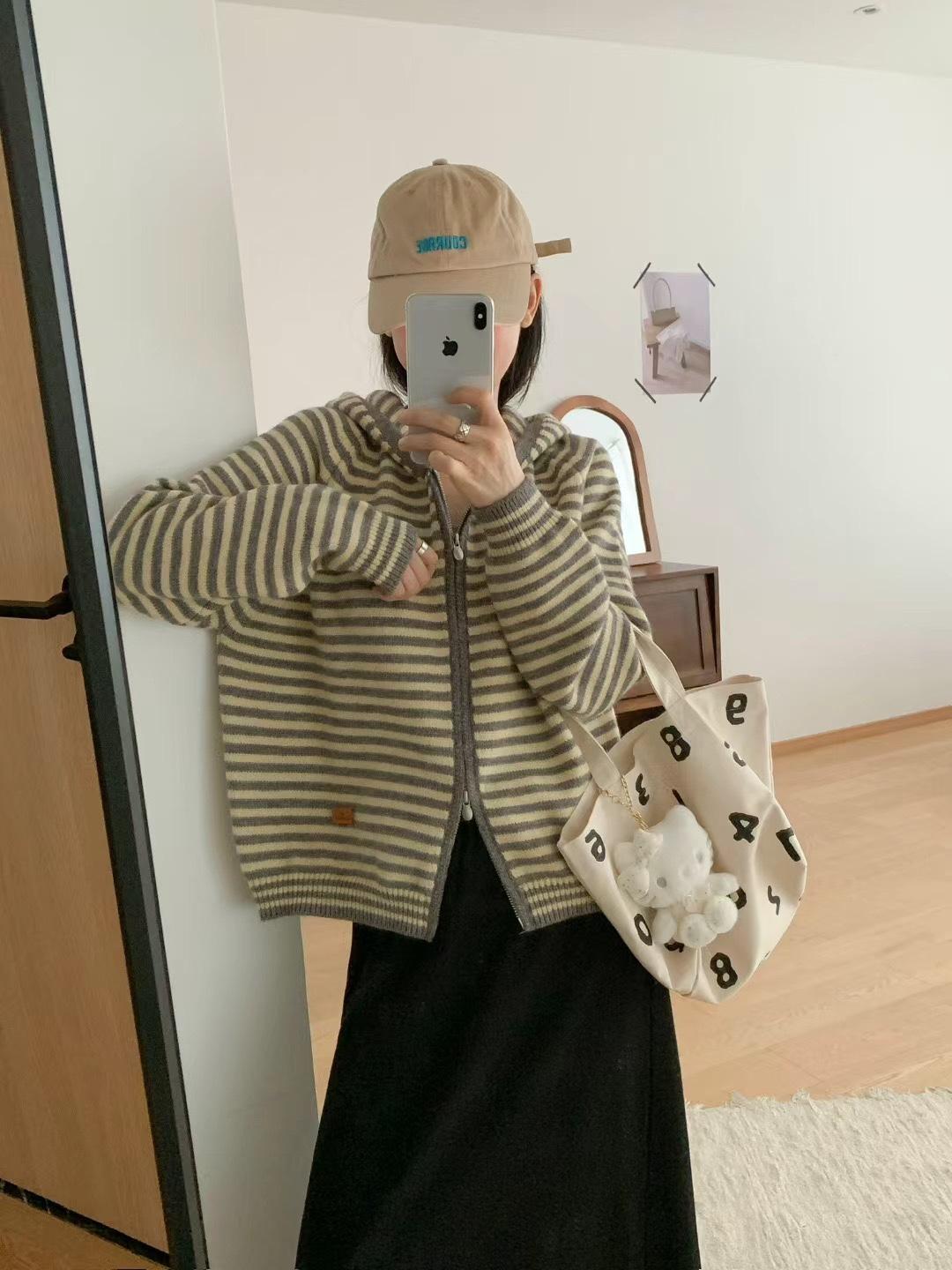 Sentido del diseño cárdigan de punto con capucha y doble cremallera para mujer otoño invierno estilo holgado perezoso a rayas casual abrigo grueso suéter marea