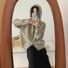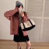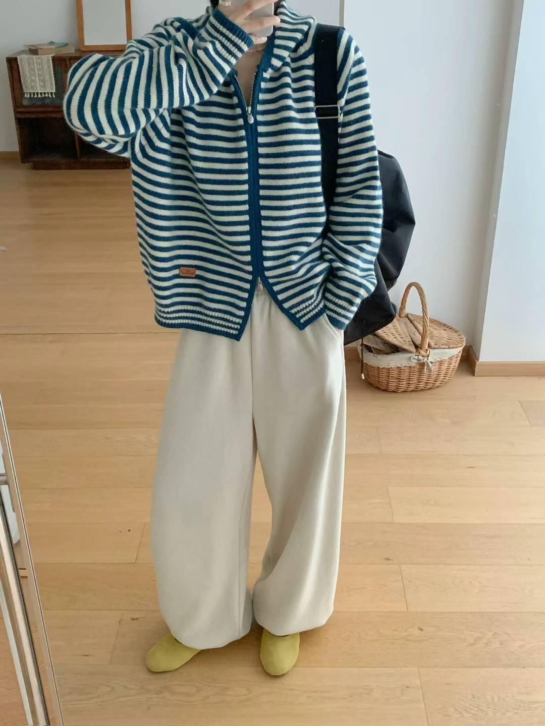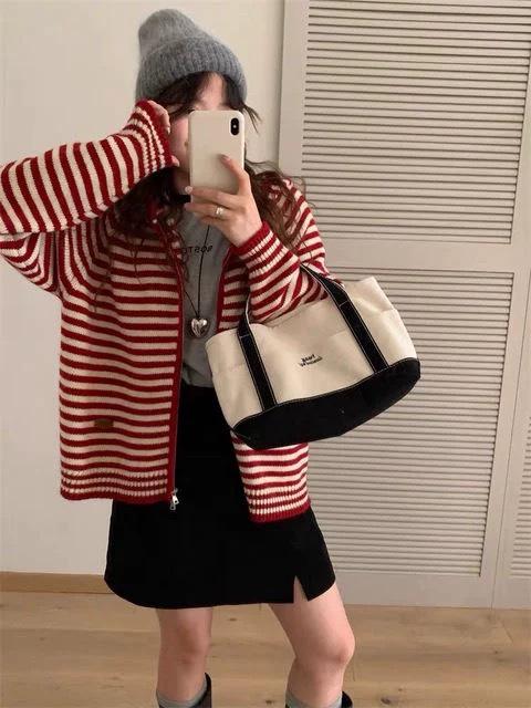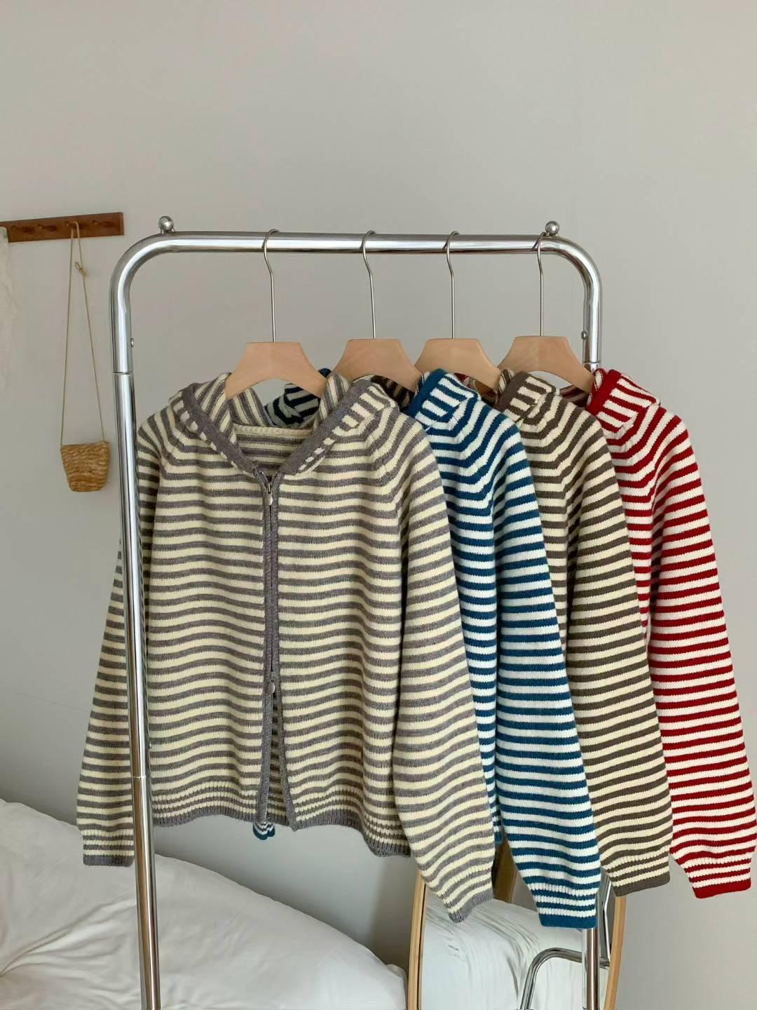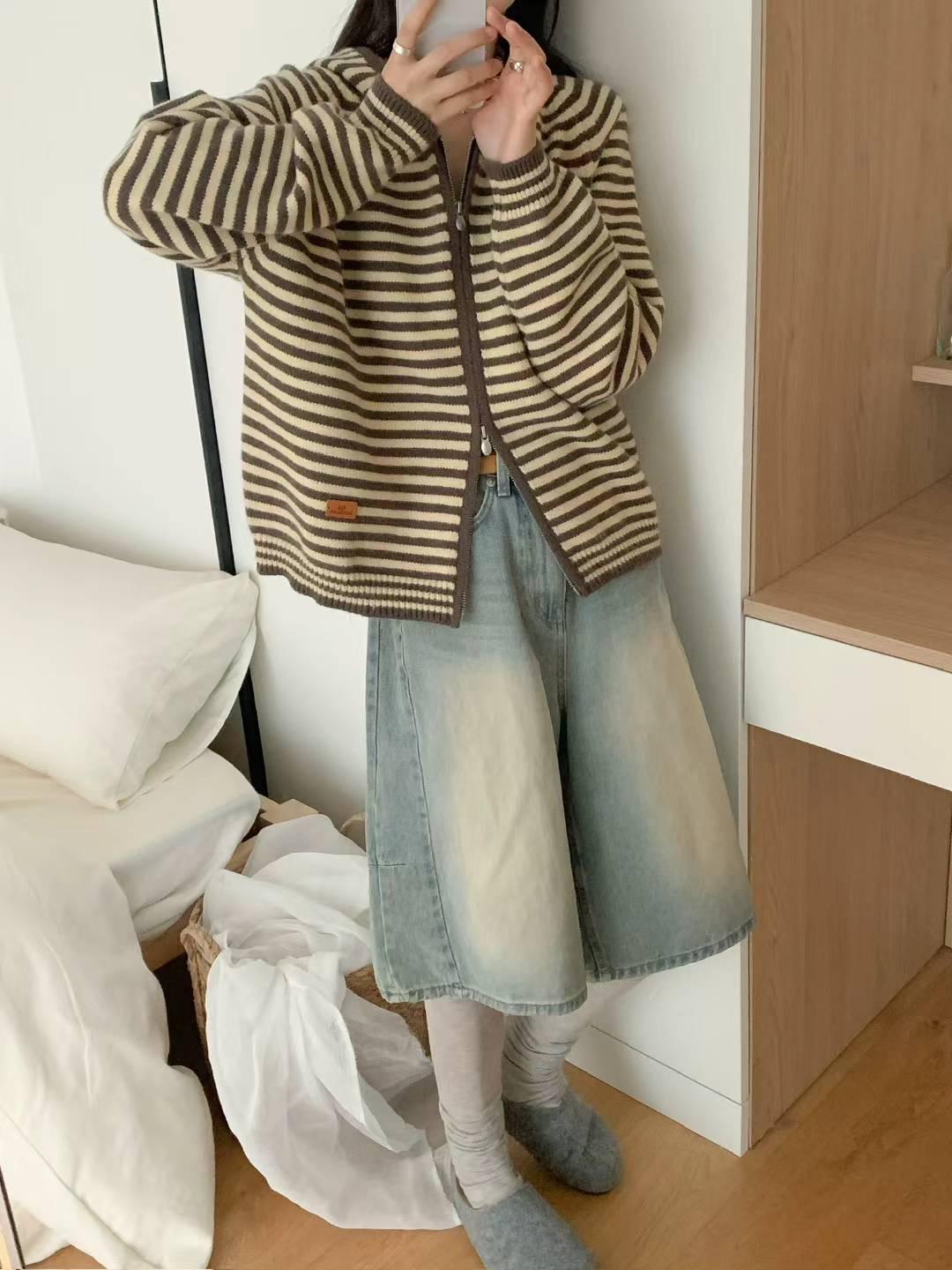 Sentido del diseño cárdigan de punto con capucha y doble cremallera para mujer otoño invierno estilo holgado perezoso a rayas casual abrigo grueso suéter marea