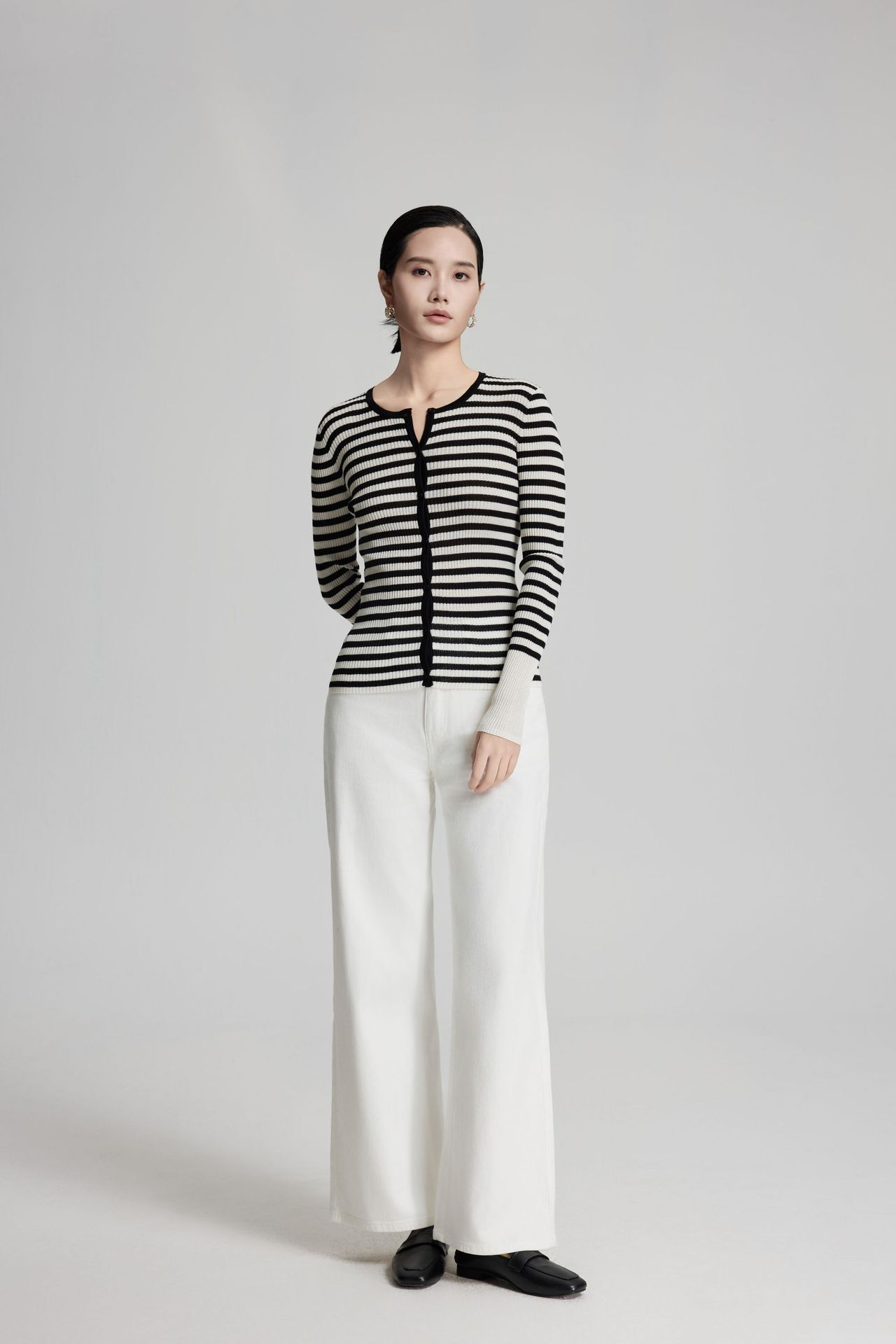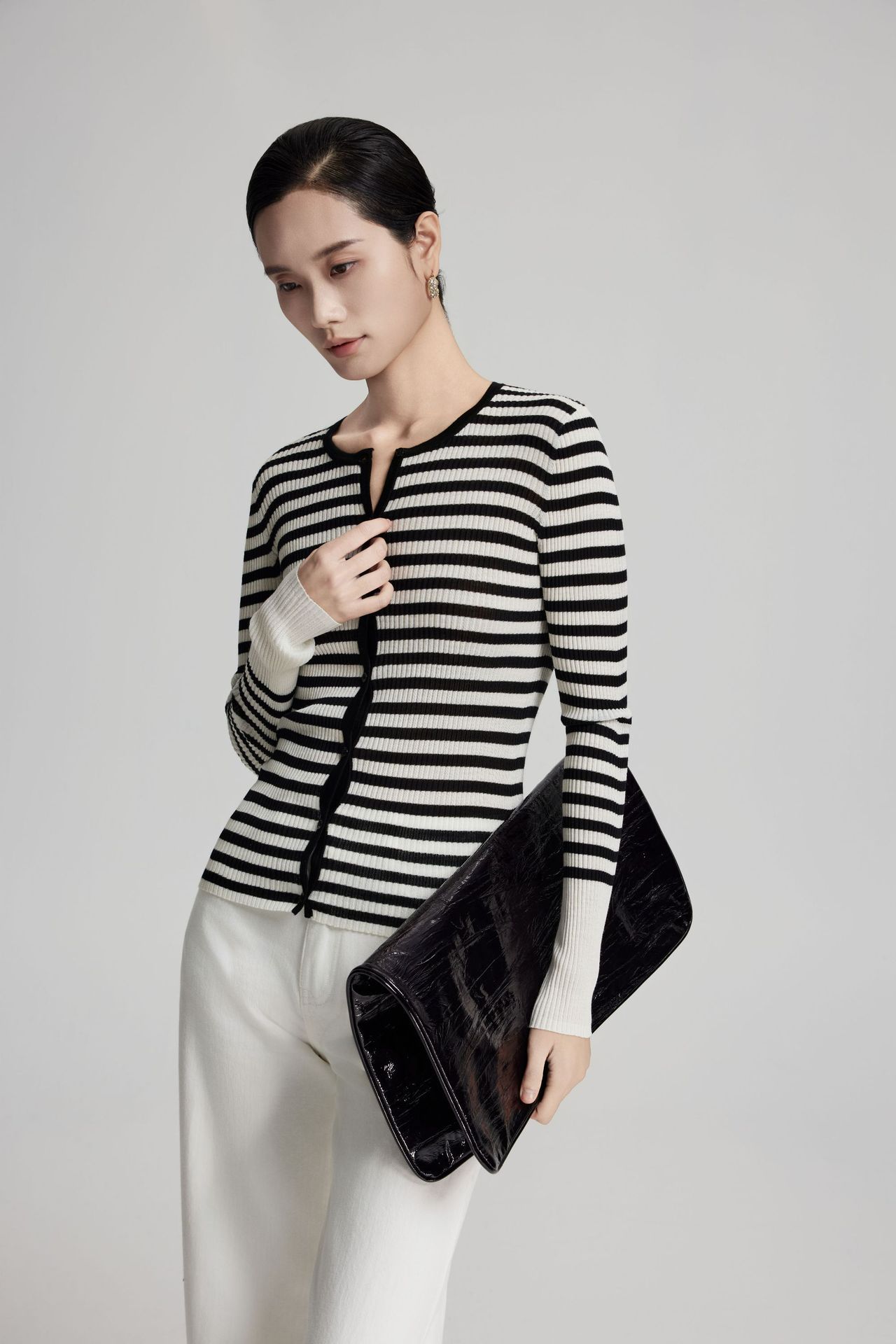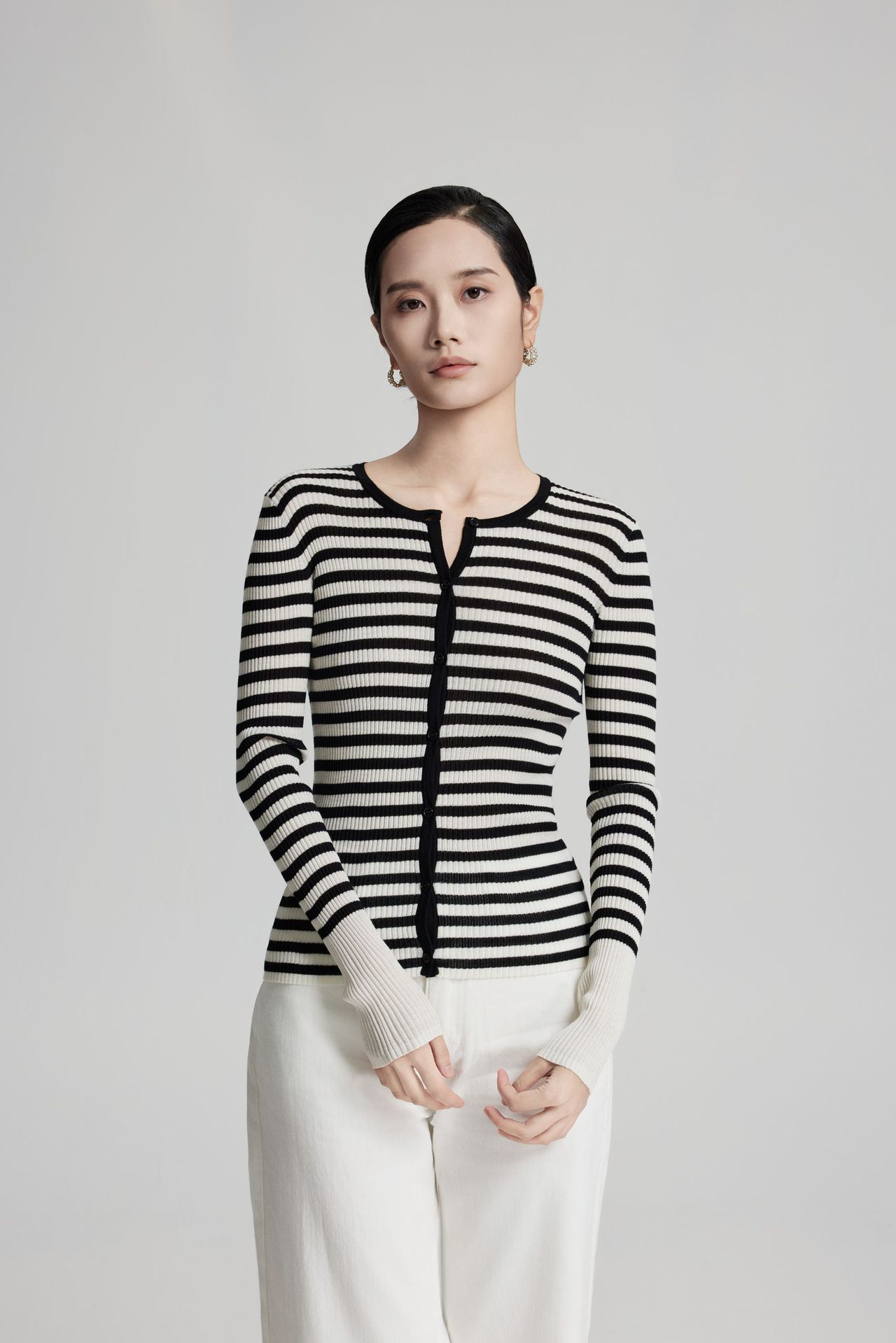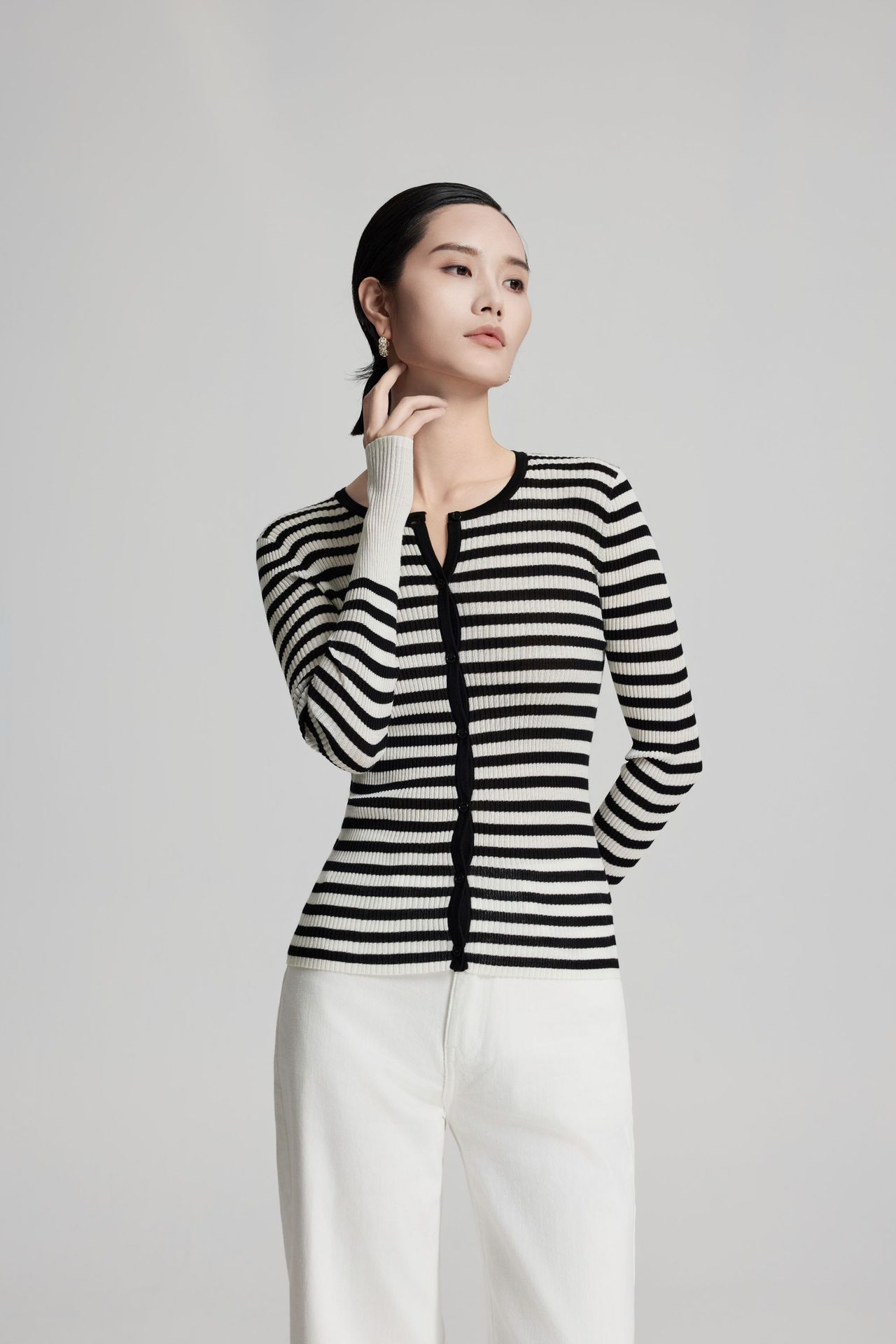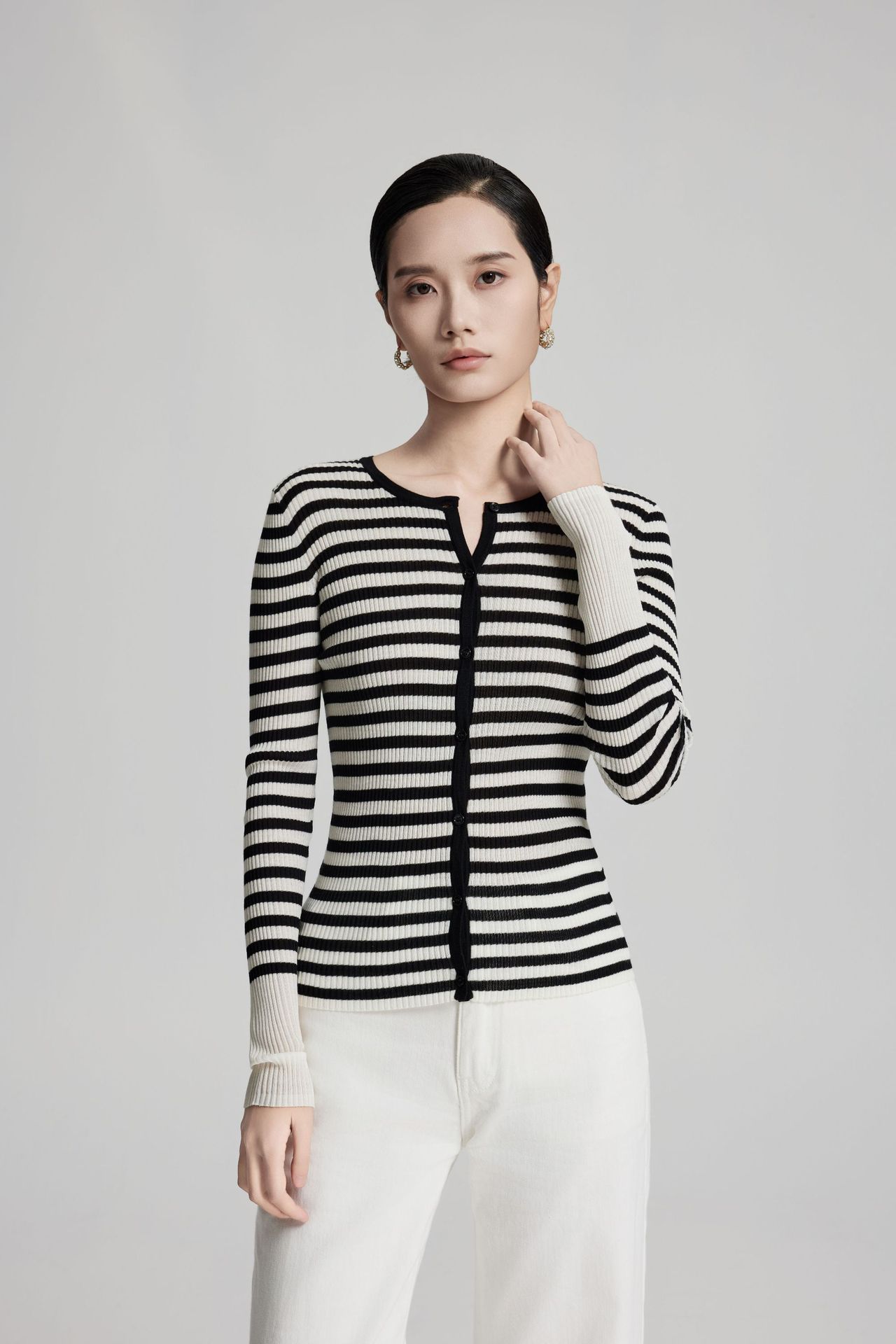 2025 Spring New Fashion Round Neck Striped Single-Breasted Wool Knit Cardigan Women's Outerwear