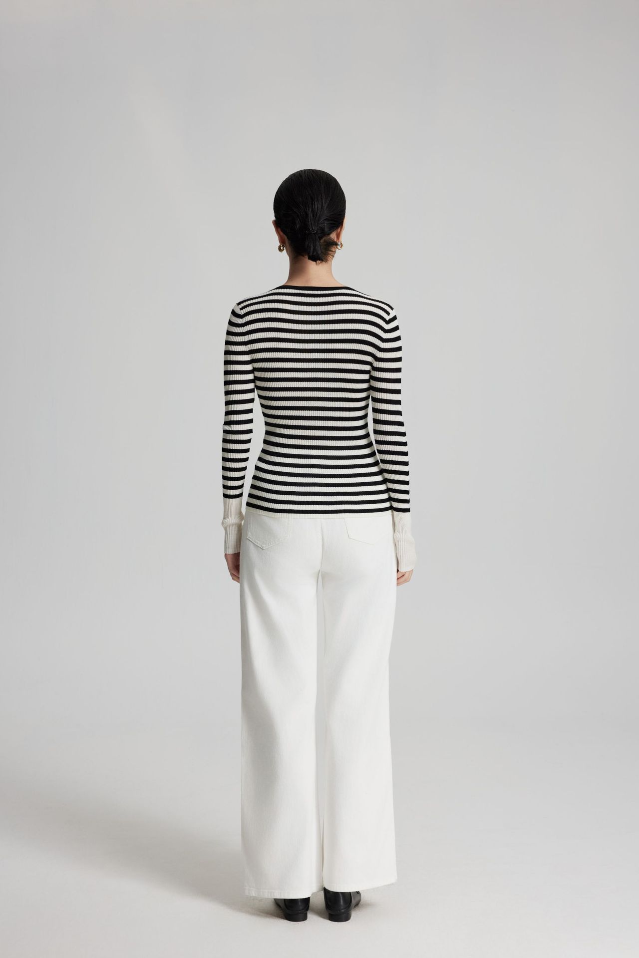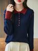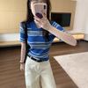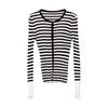 Top de punto de manga larga a rayas con bloques de color, cuello redondo, lana acetato de 18 agujas, corte slim adelgazante, fino, cárdigan de un solo botón