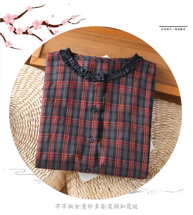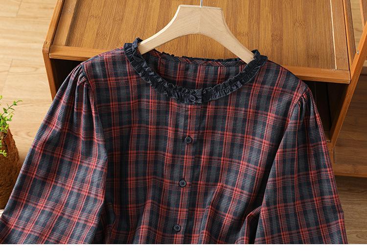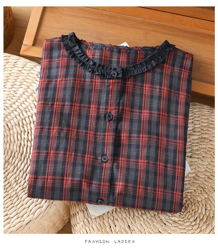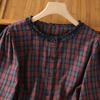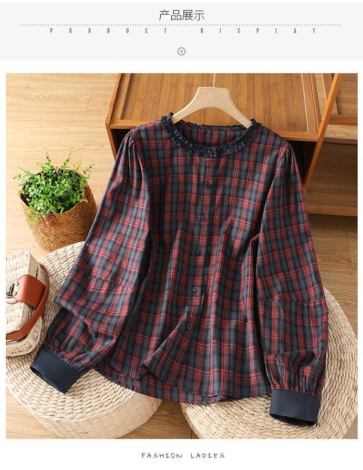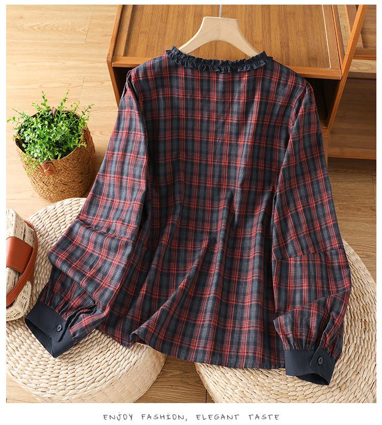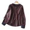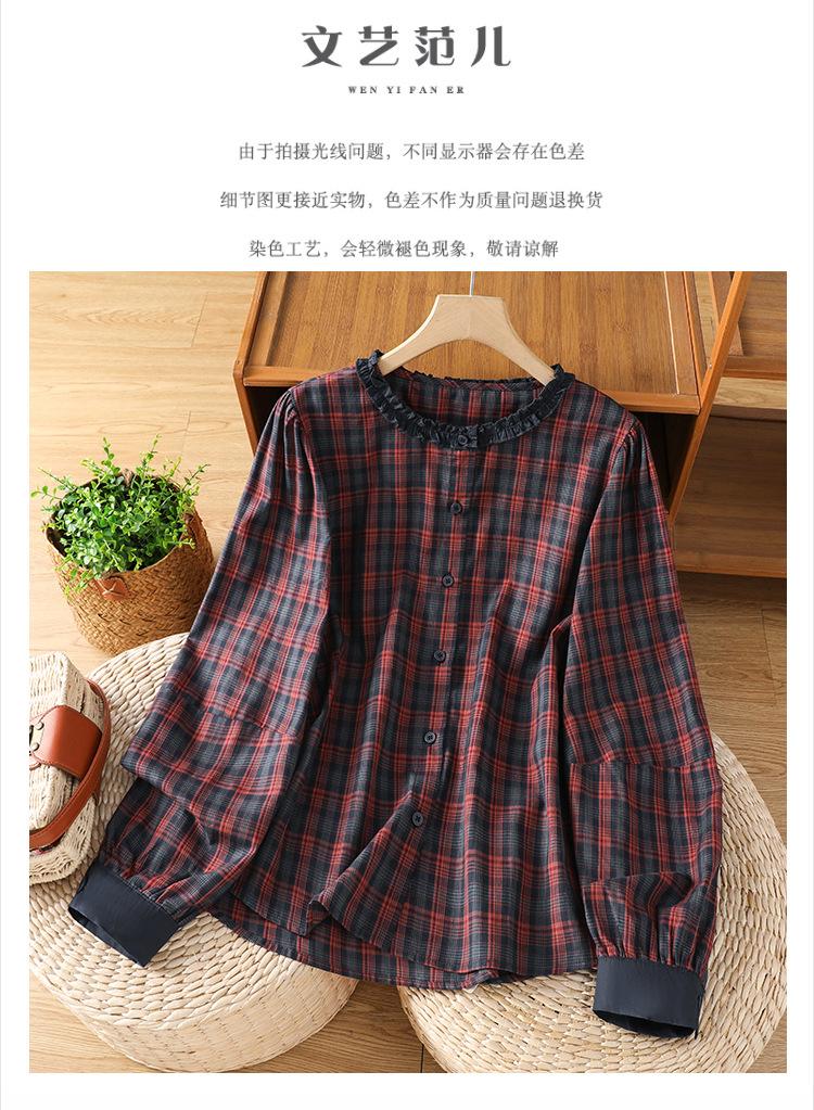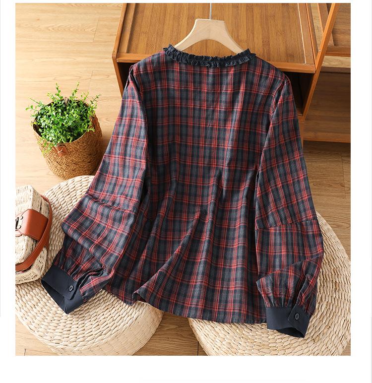 Foto Real 2025 Casual Sencillo Cuadros Cuello de Encaje Suelto Moda Estilo Extranjero Versátil Adelgazante Camisa Top Mujer