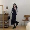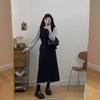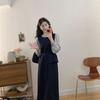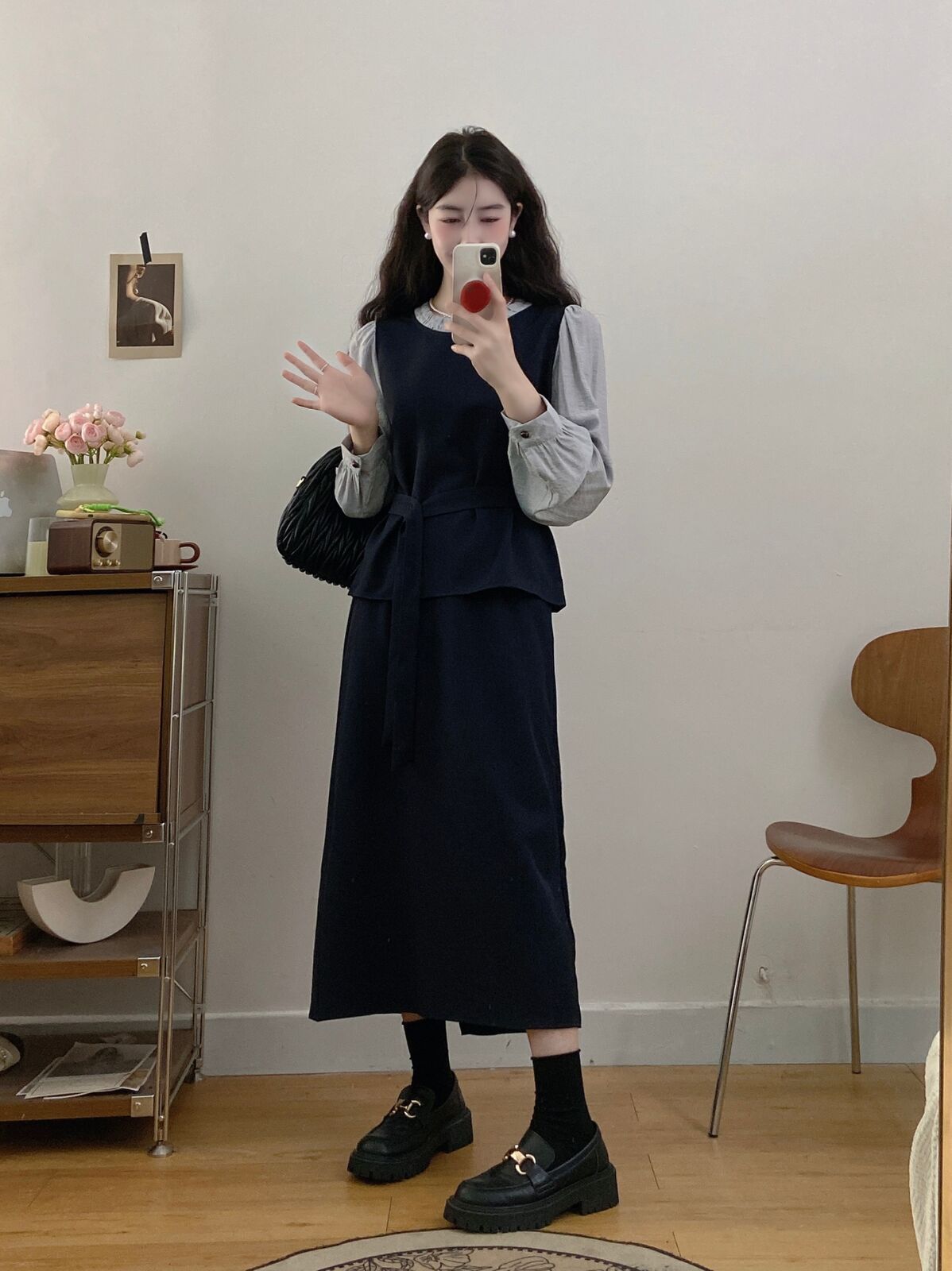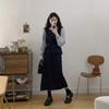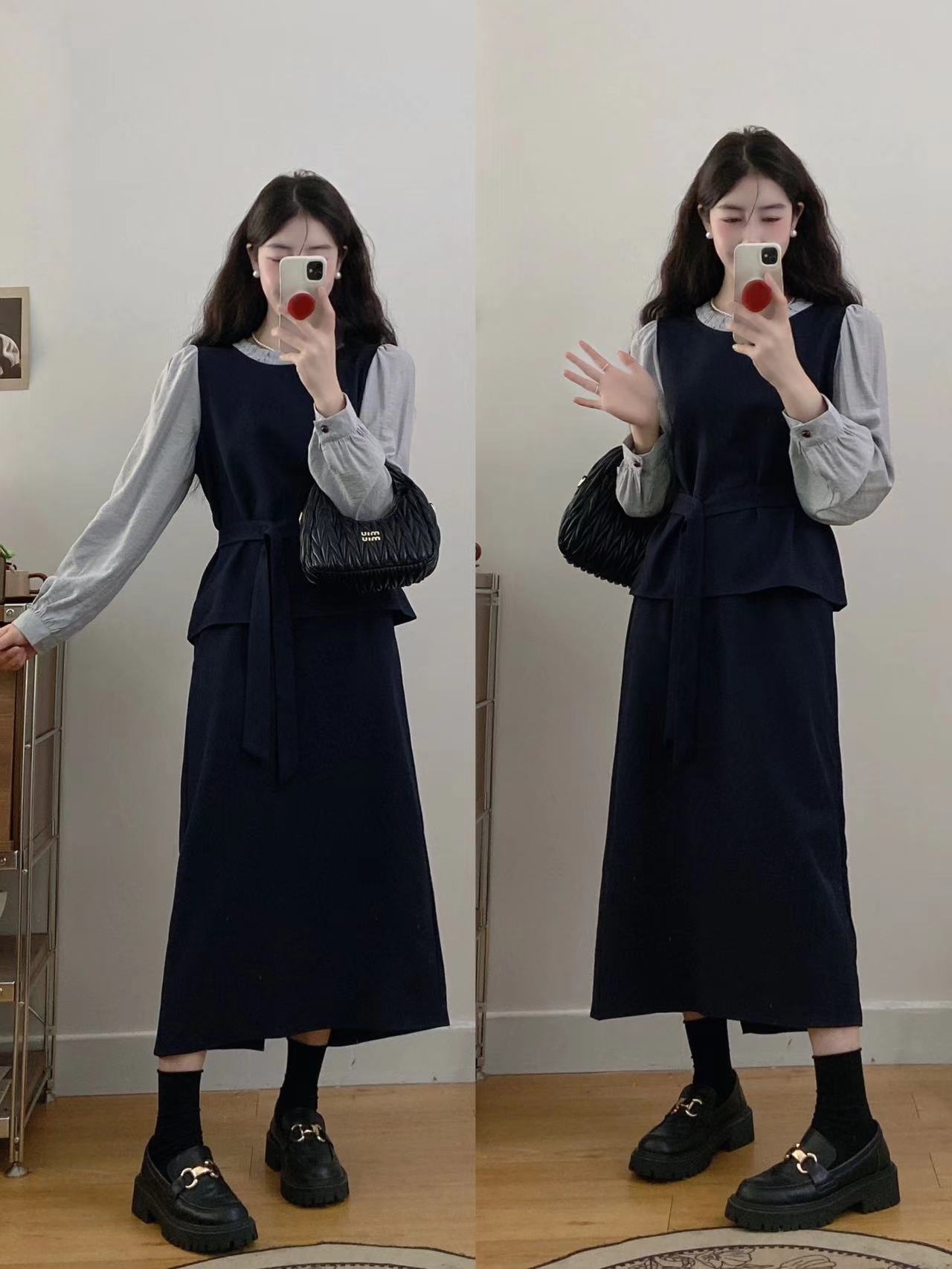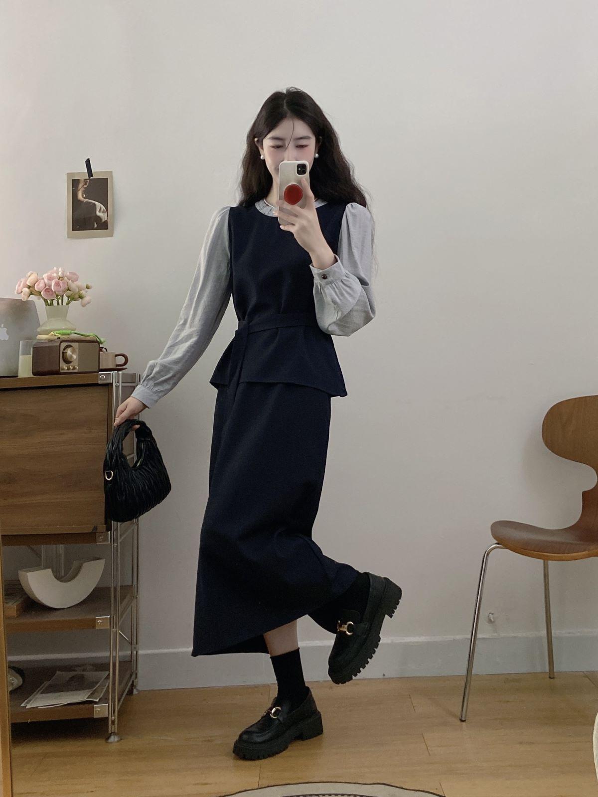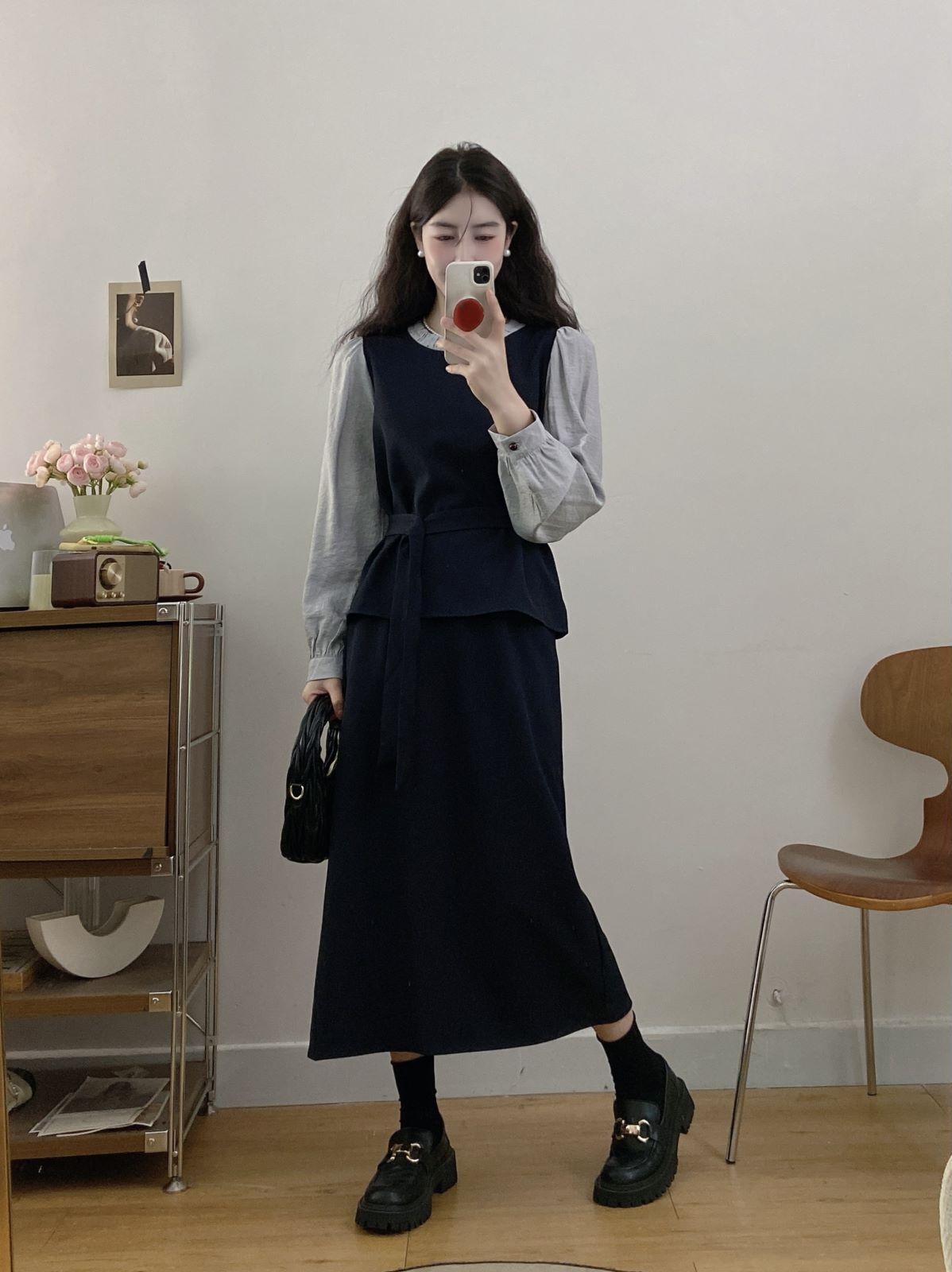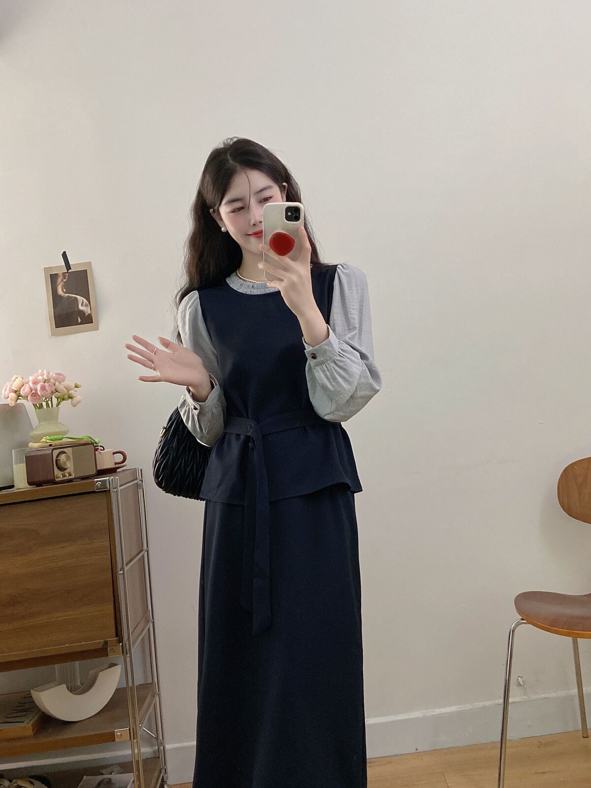 Conjunto de ropa de trabajo de temperamento de alta gama para mujer 2025 principios de otoño nuevo camisa de manga larga empalmada de dos piezas falsas falda midi