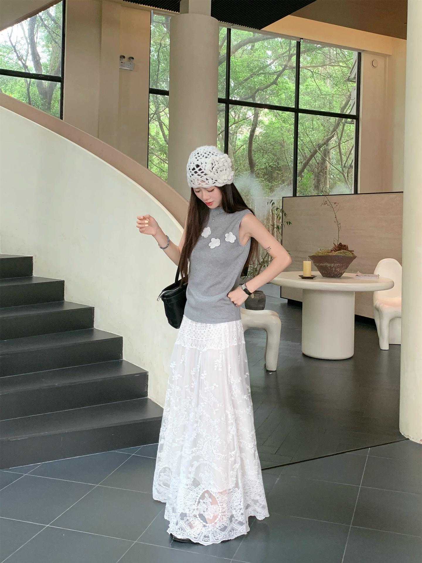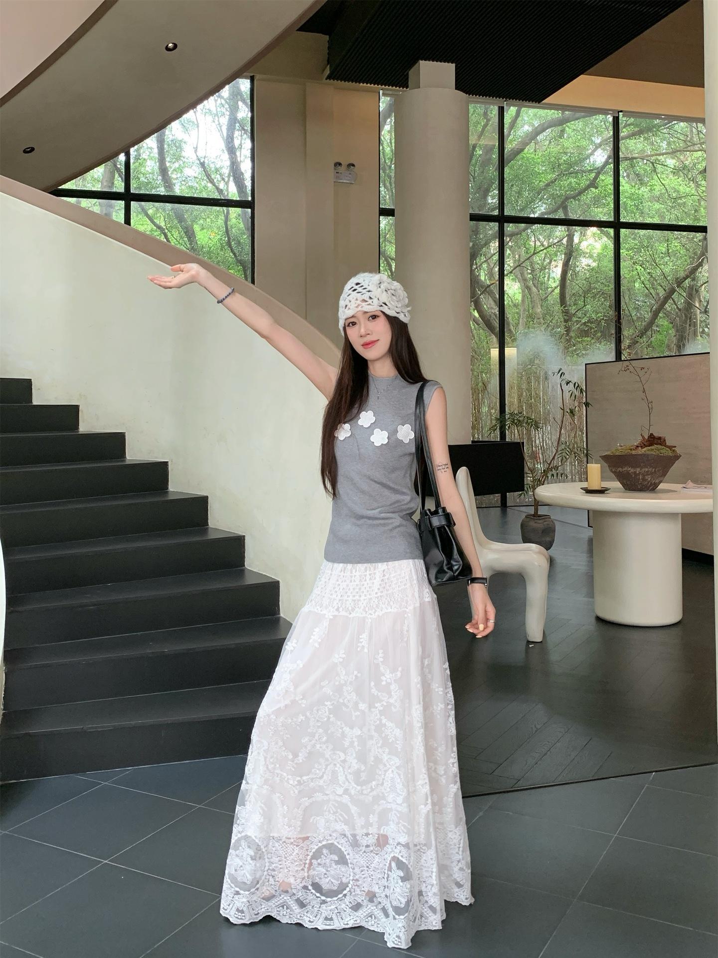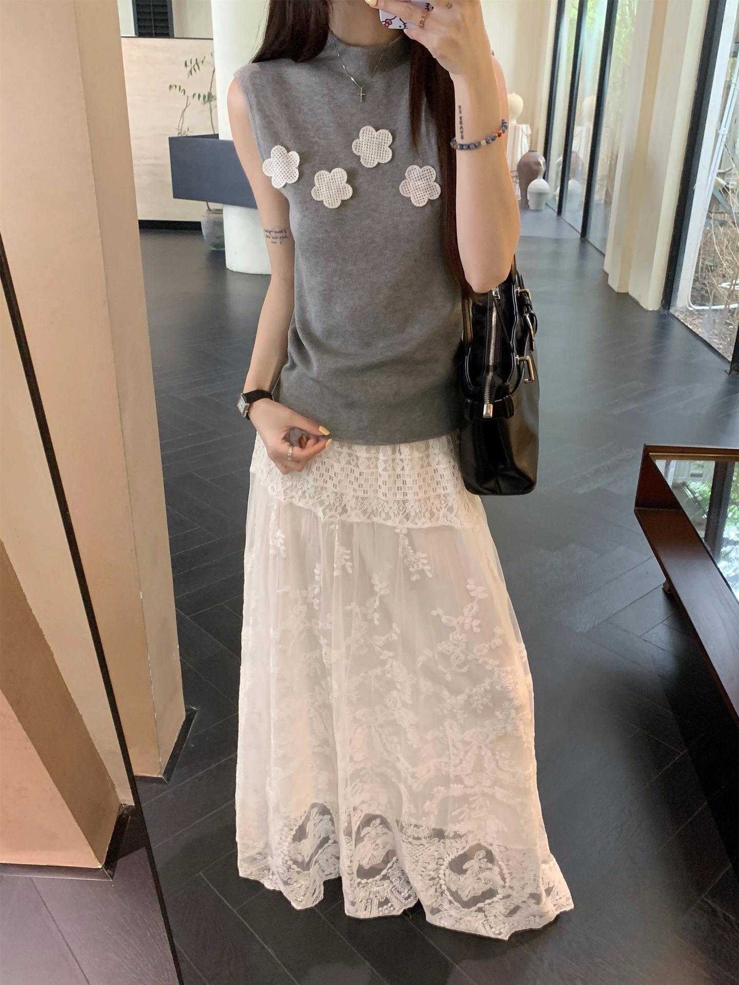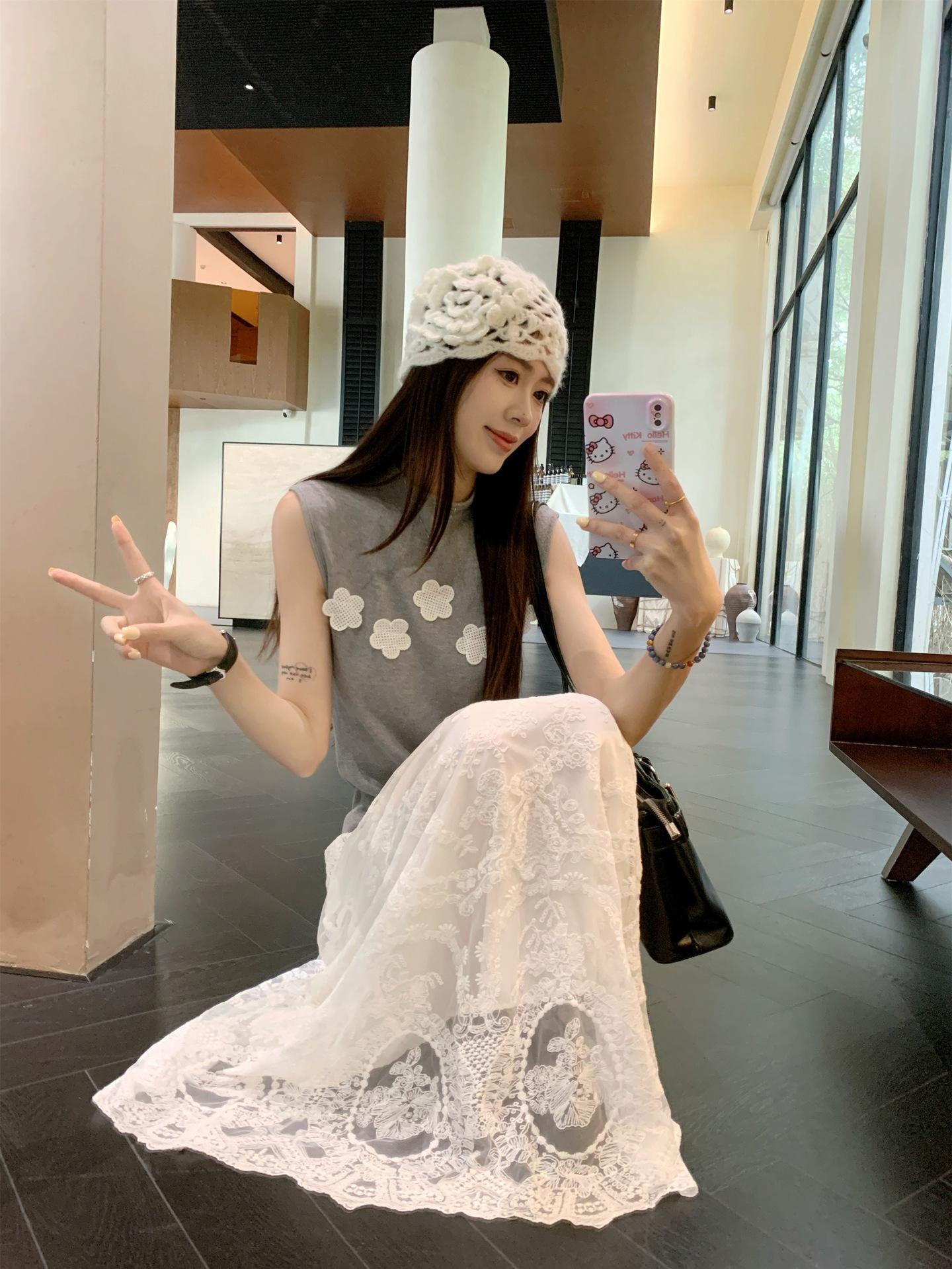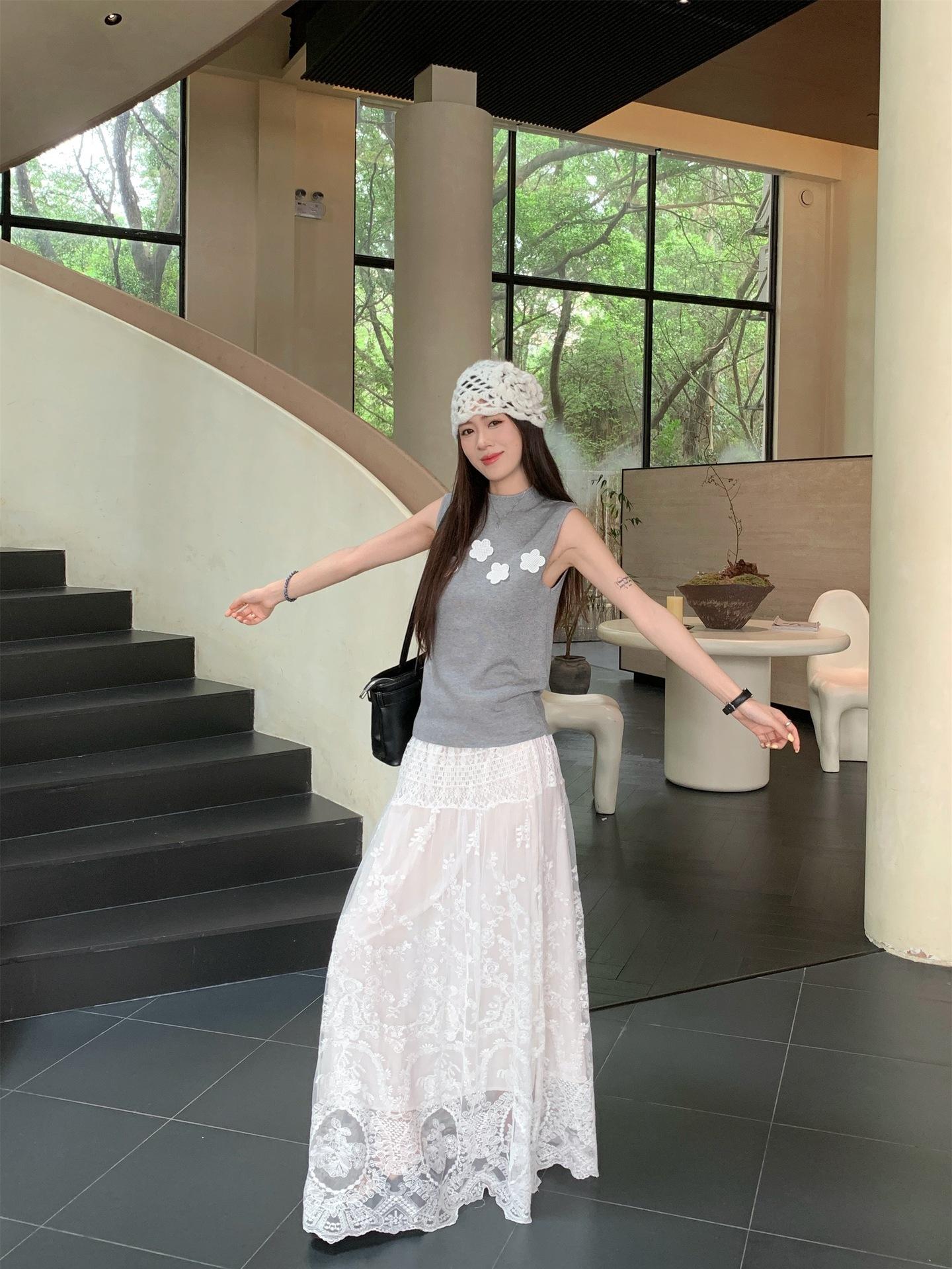 Diseño Coreano Top Chaleco Floral Falda Chic de Encaje Cintura Alta Nuevo Traje de Verano para Mujer 2025 Tendencia