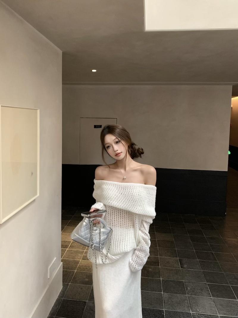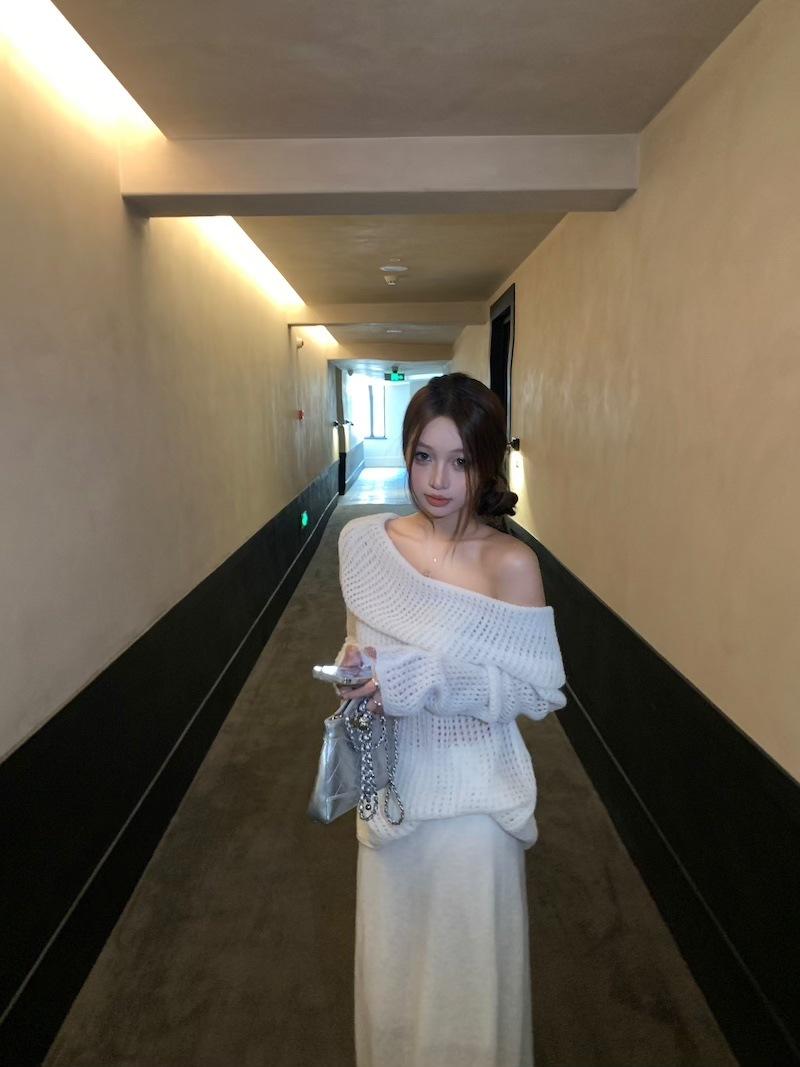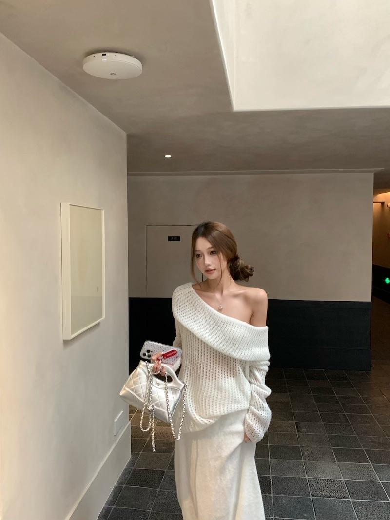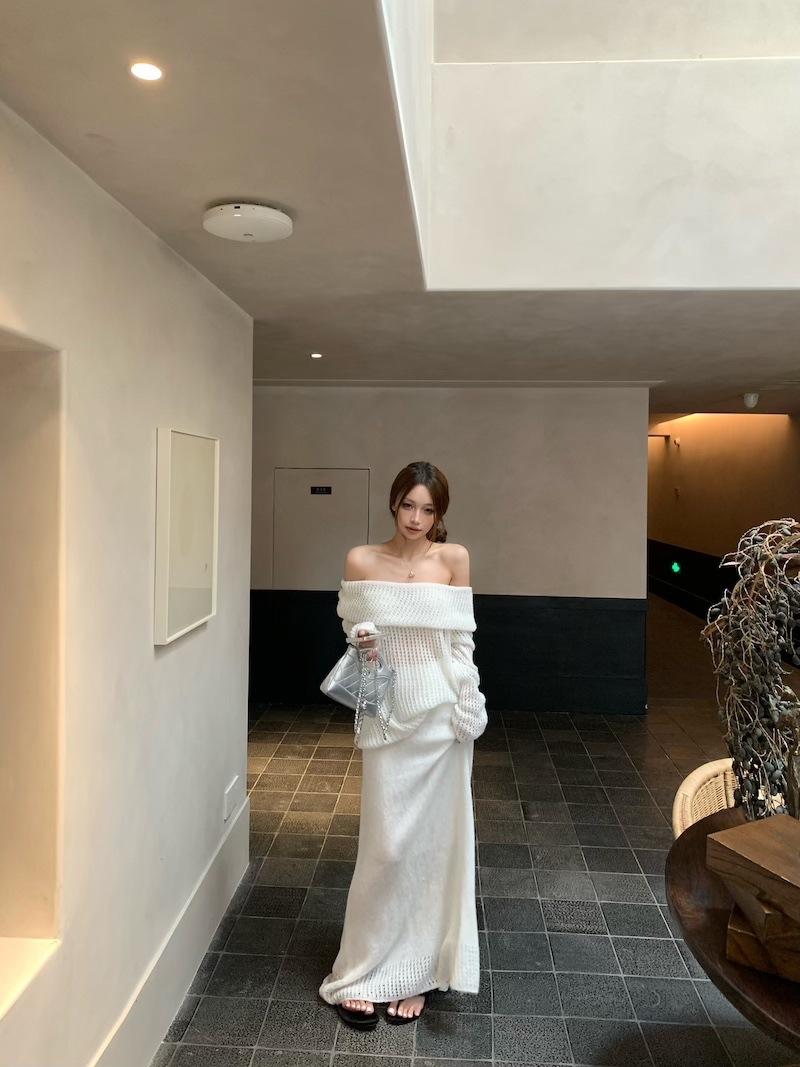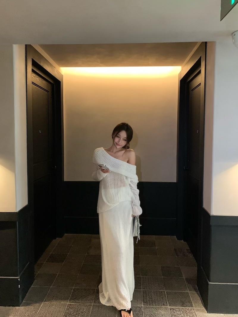 Foto Real 2025 Principios de Otoño Temperamento Fresco Hombro Descubierto Recorte Top de Punto Estilo Casual Relajado Falda Midi Conjunto de Dos Piezas