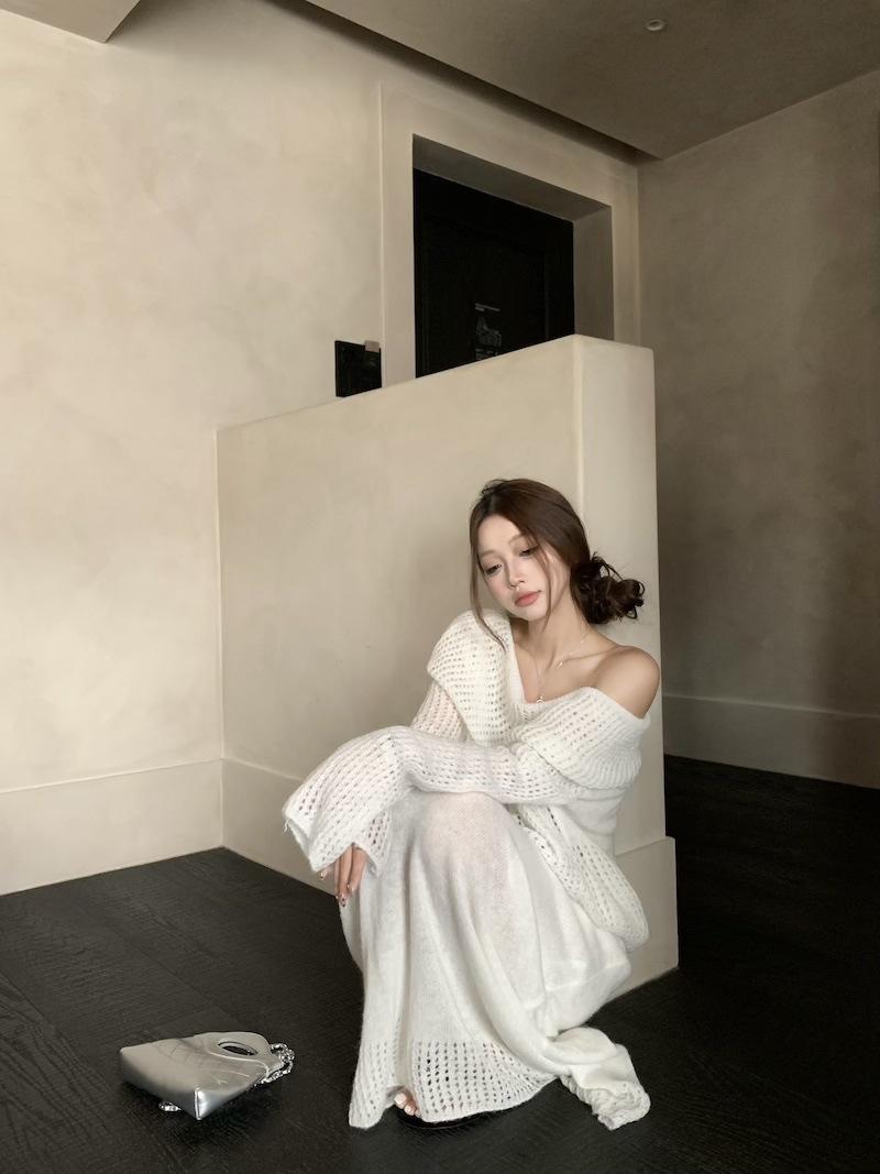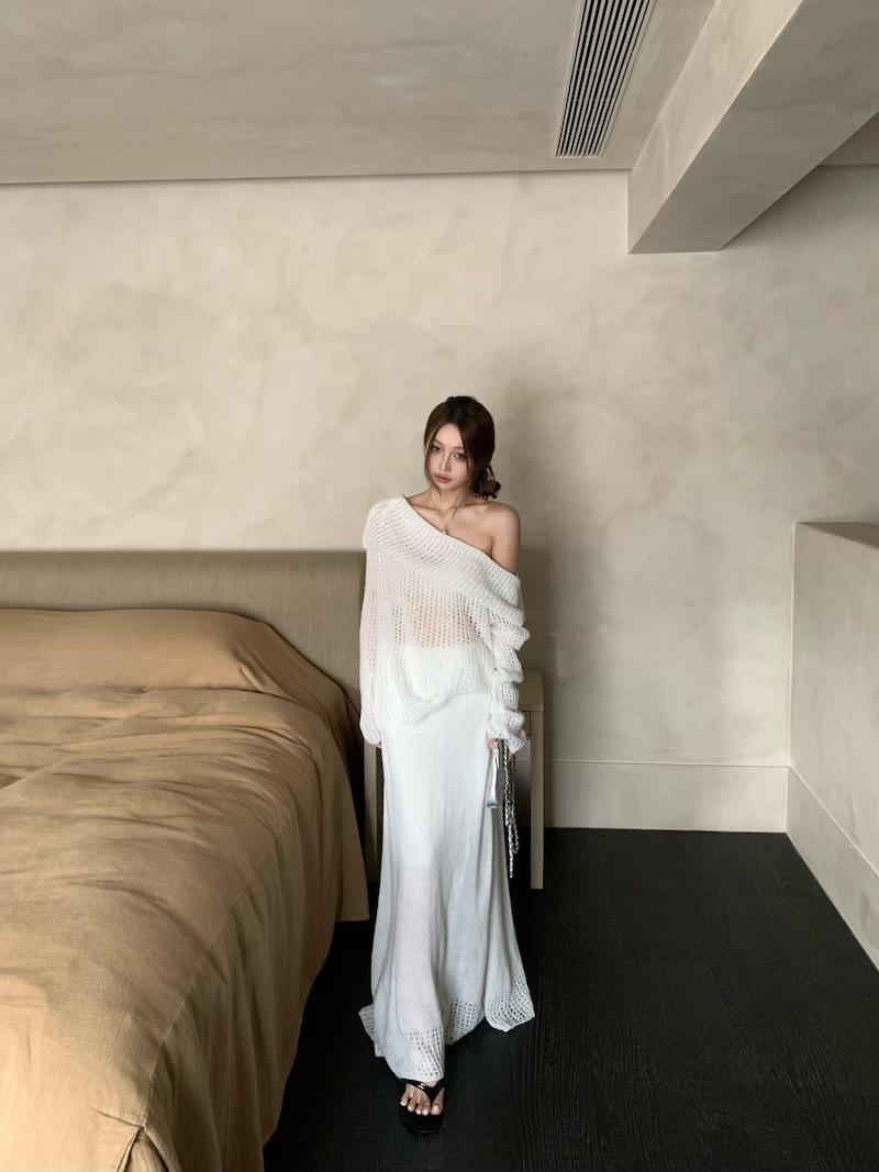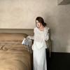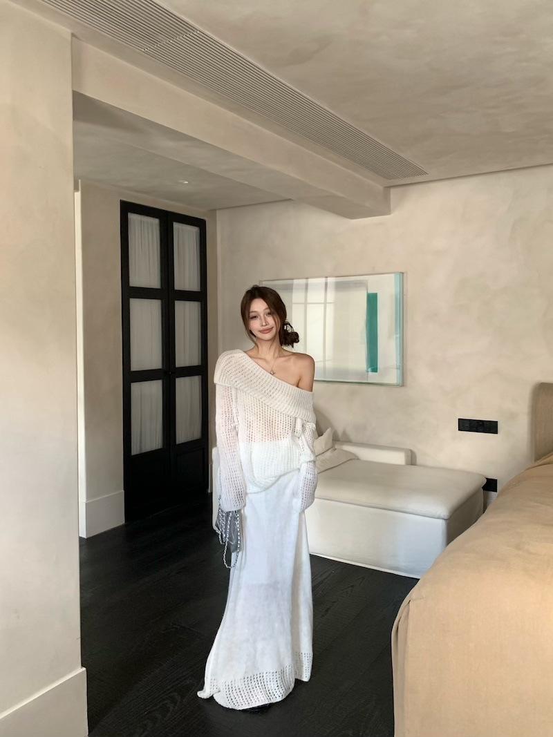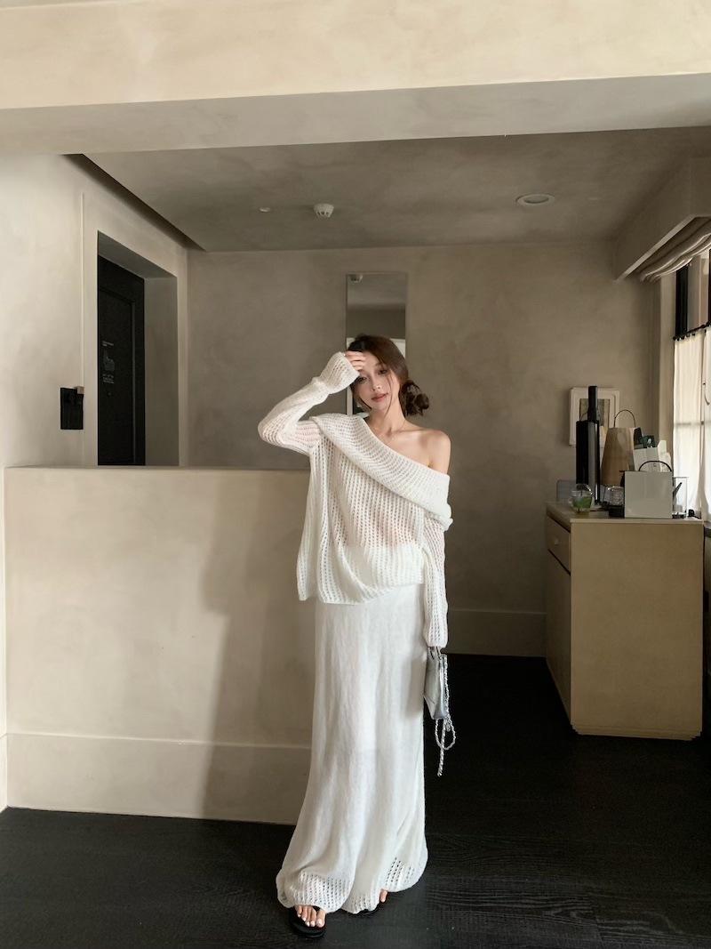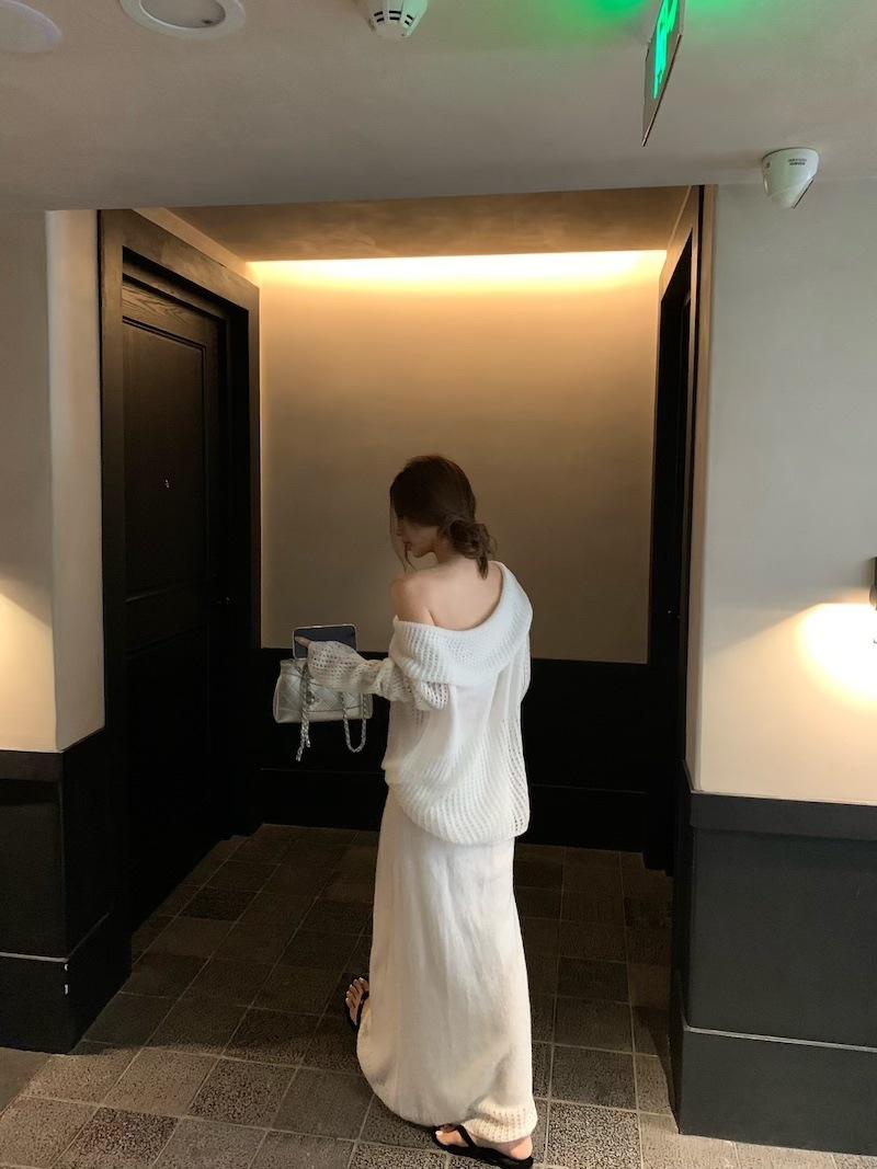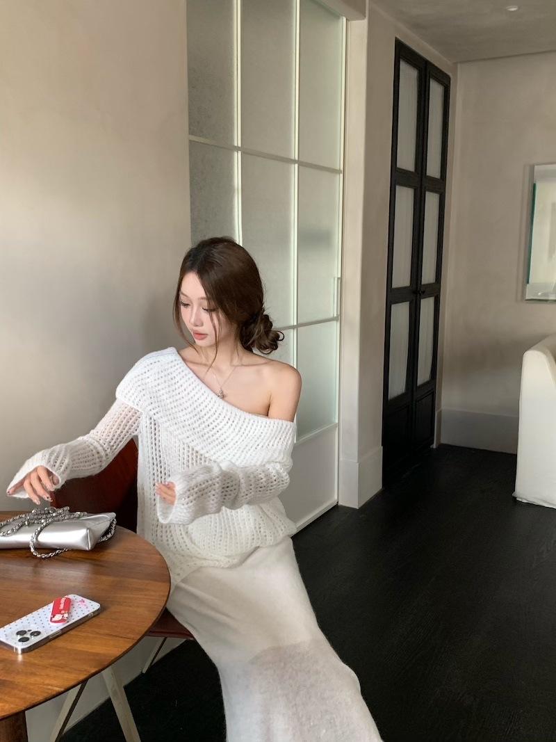 Foto Real 2025 Principios de Otoño Temperamento Fresco Hombro Descubierto Recorte Top de Punto Estilo Casual Relajado Falda Midi Conjunto de Dos Piezas