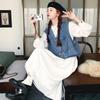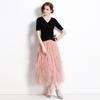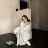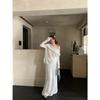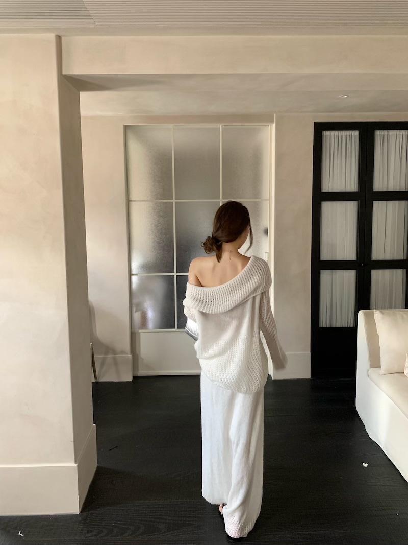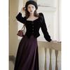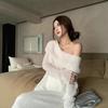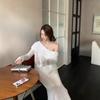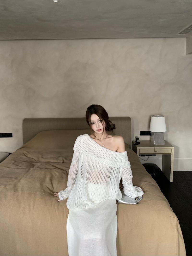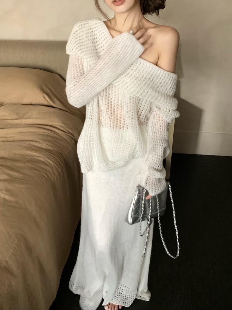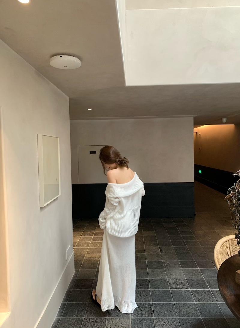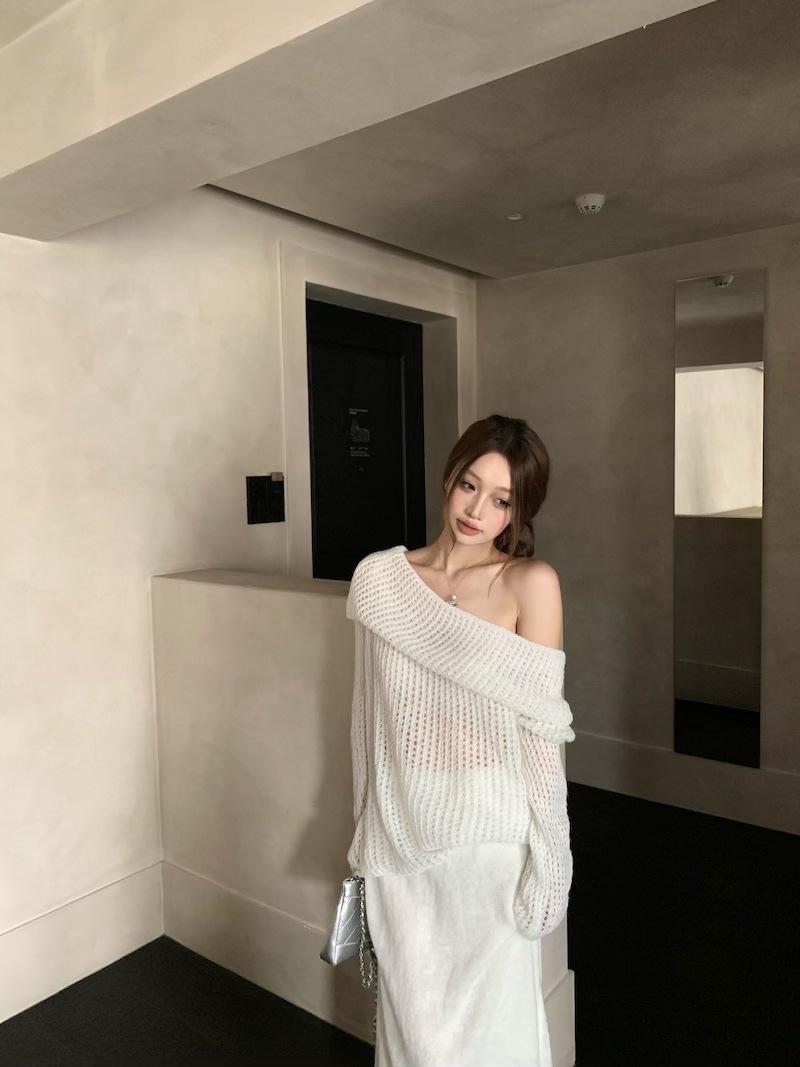 Foto Real 2025 Principios de Otoño Temperamento Fresco Hombro Descubierto Recorte Top de Punto Estilo Casual Relajado Falda Midi Conjunto de Dos Piezas