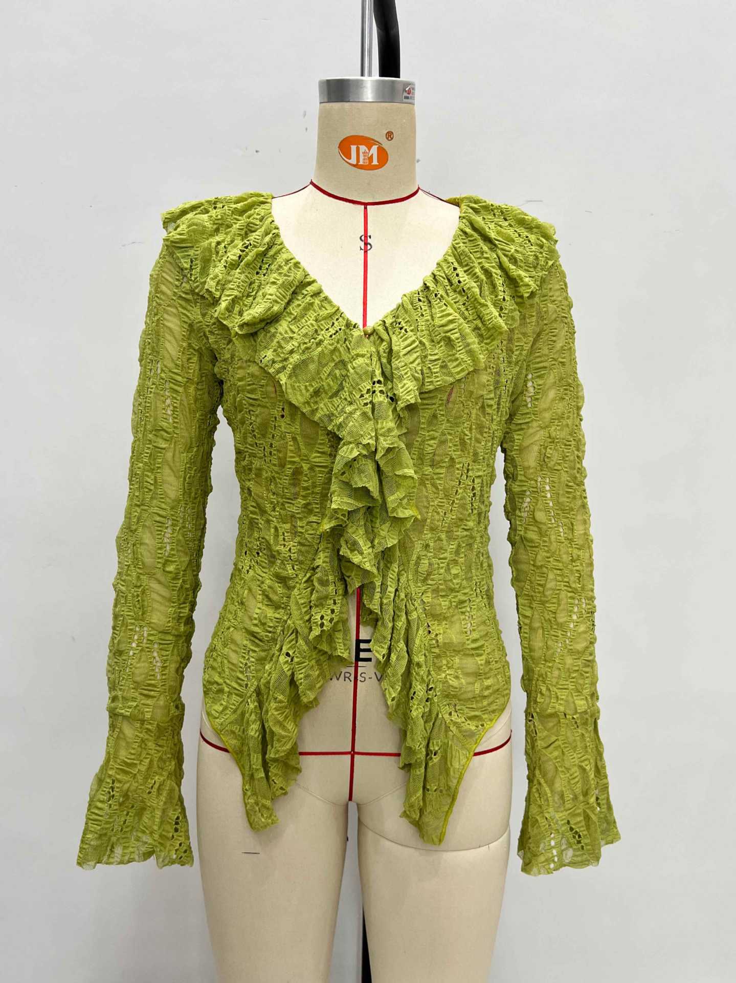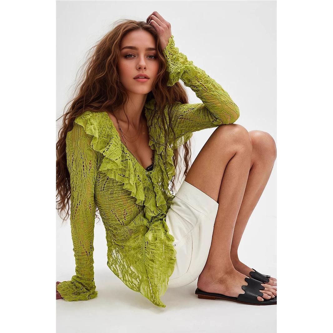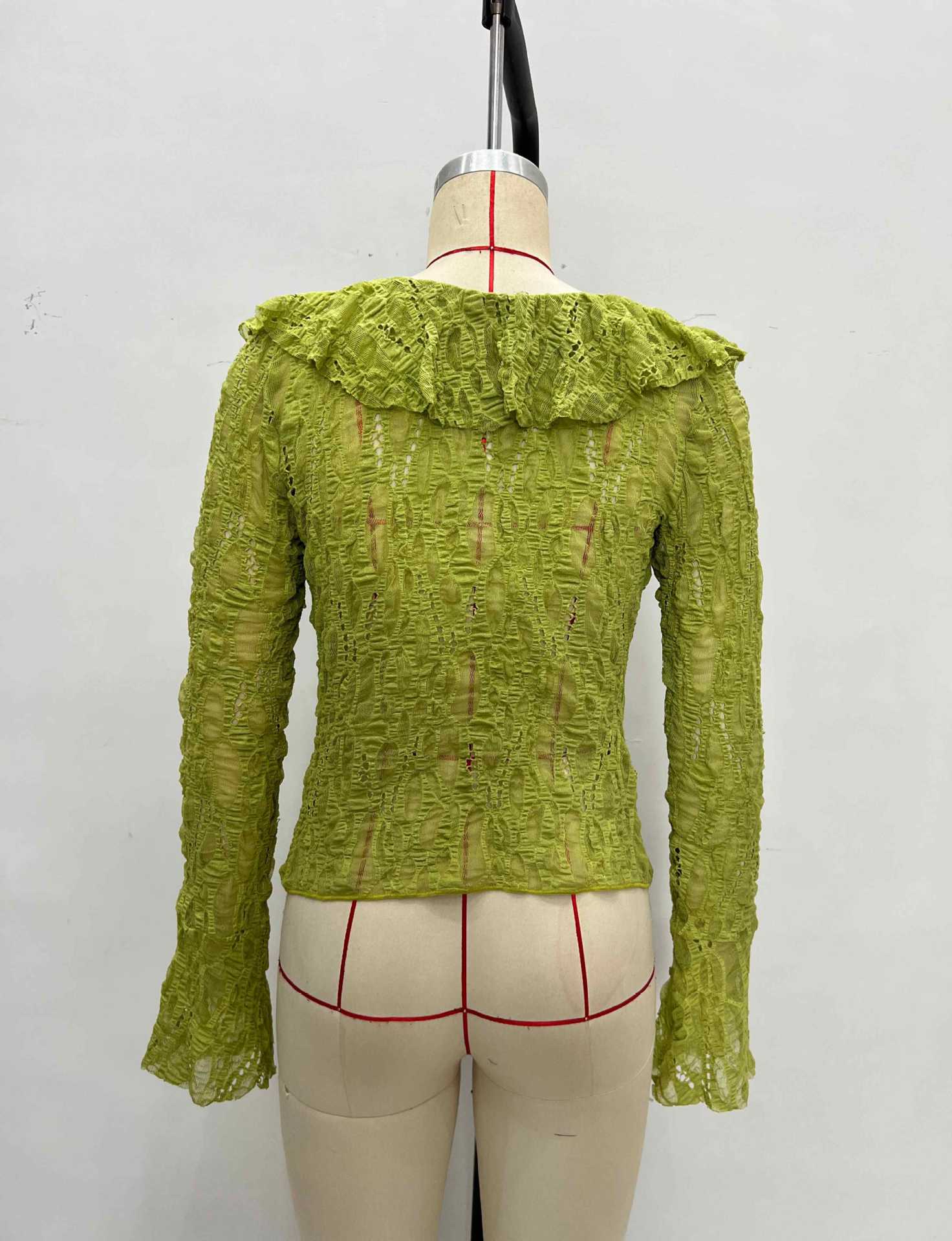 Exportación Transfronteriza Camisa de Encaje con Cuello en V para Mujer Otoño Nueva Moda Cárdigan con Volantes Manga Larga Top Corto de Punto
