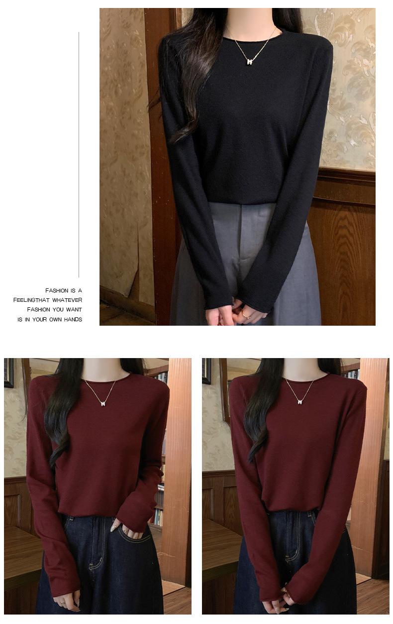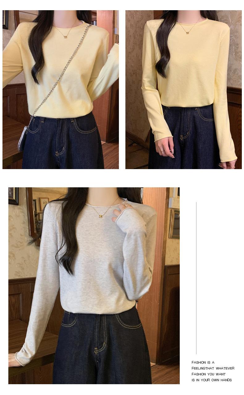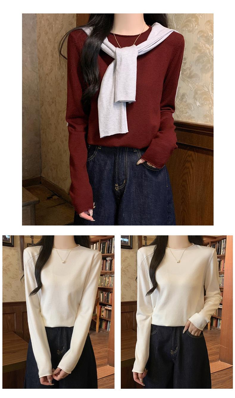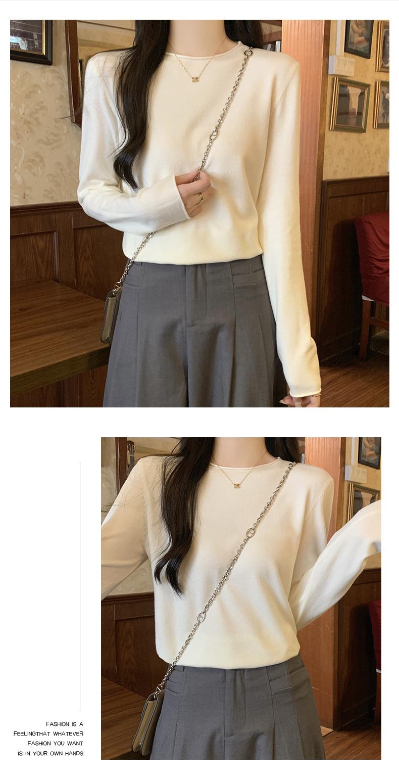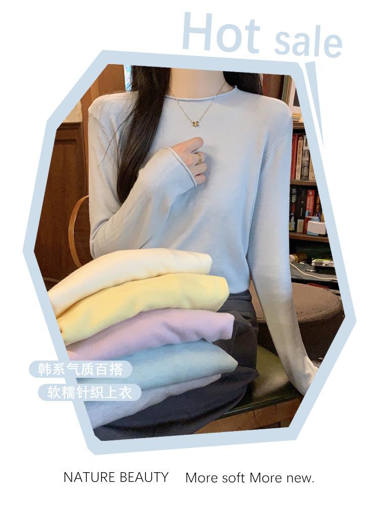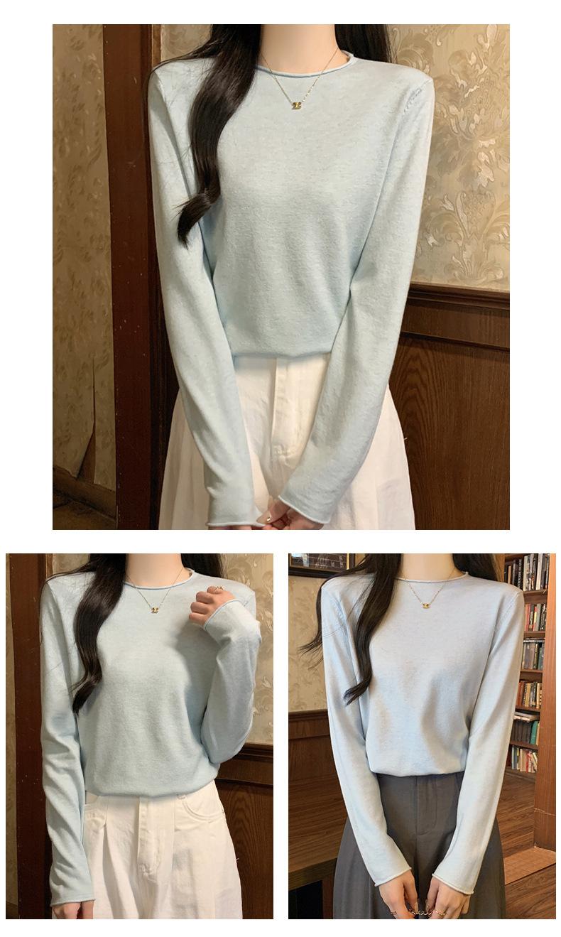 Top de Punto de Cuello Redondo con Dobladillo Enrollado para Primavera 2025 para Mujer, Suéter Casual Suave y Ceroso, Estilo Coreano Reductor de Edad, Camiseta Interior para Capas