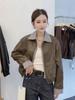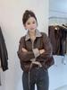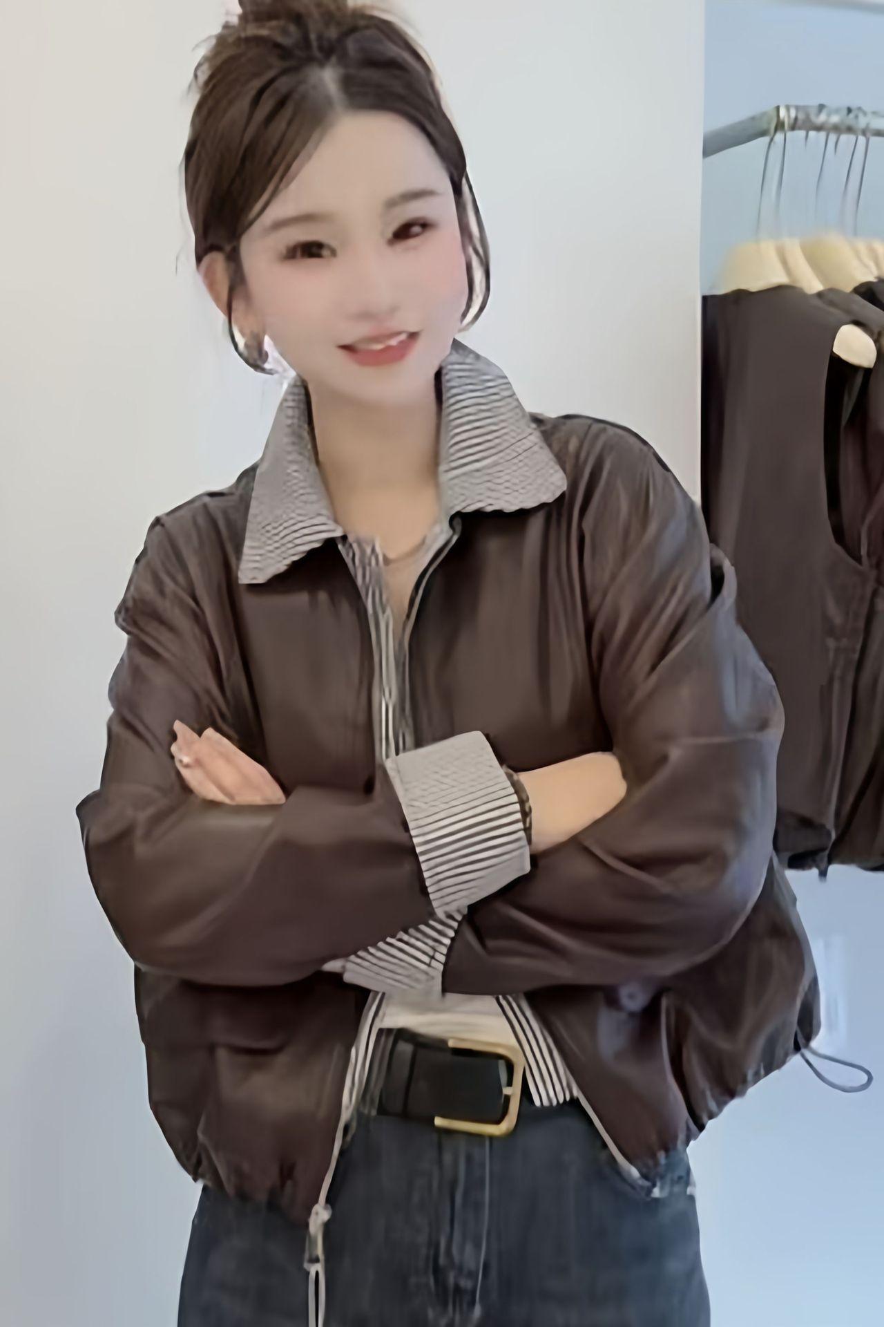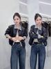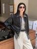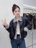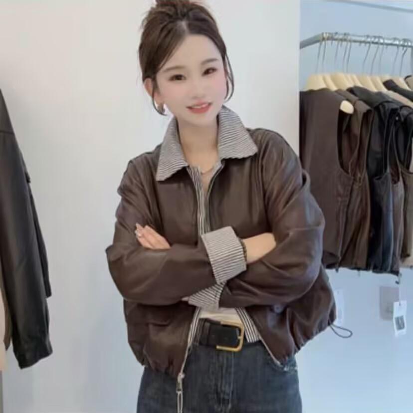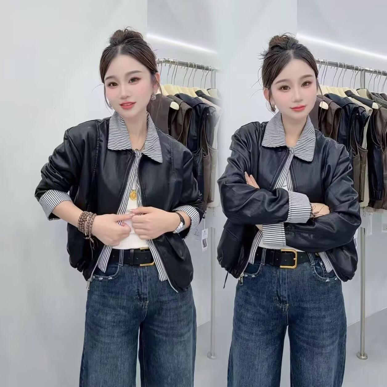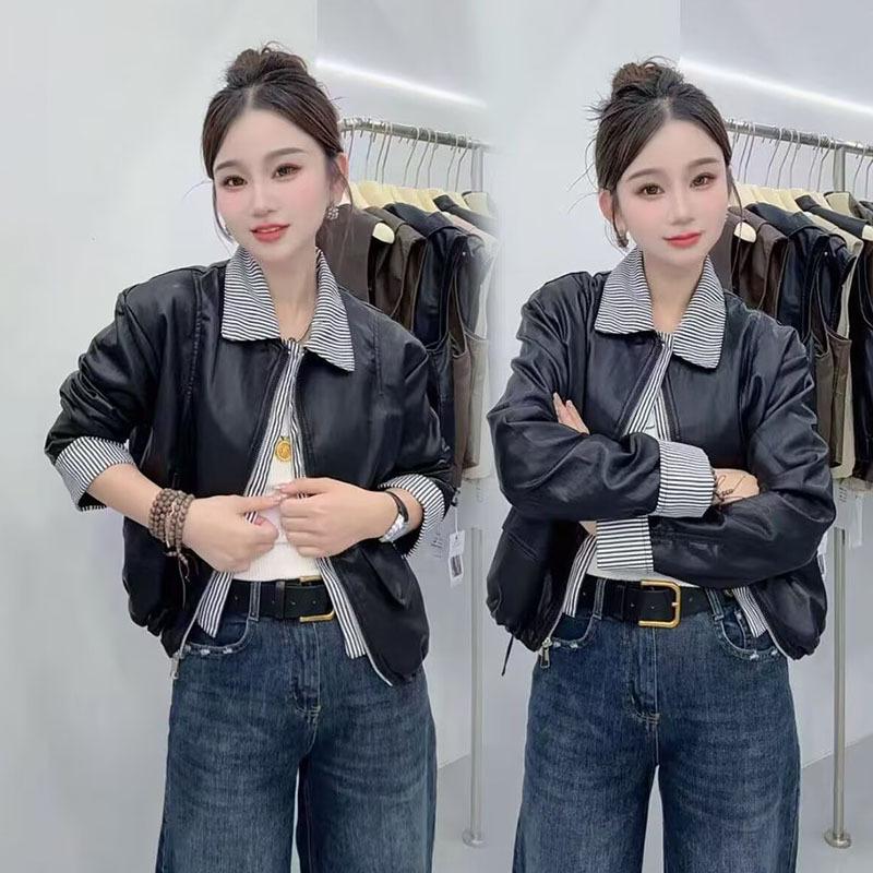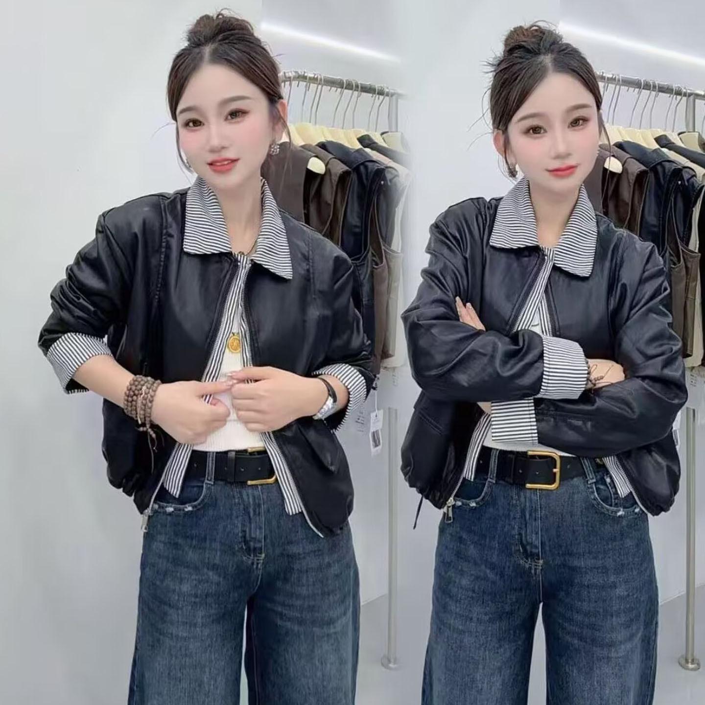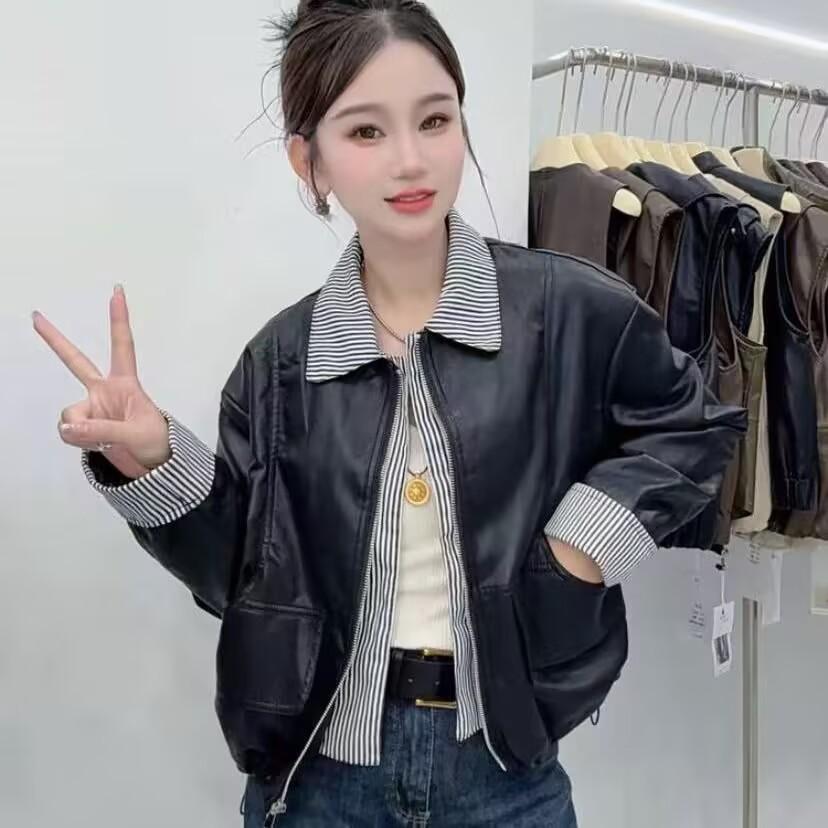 Chaqueta de Cuero PU Nueva Otoño 2025 para Mujer Europea de Alta Gama Empalmada Falso Dos Piezas Petite Biker Top Corto
