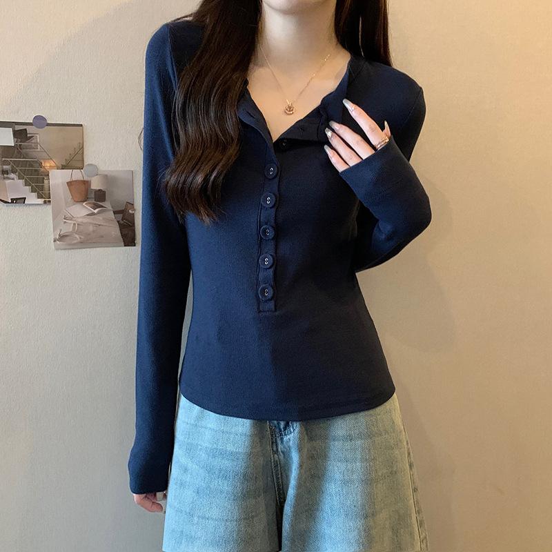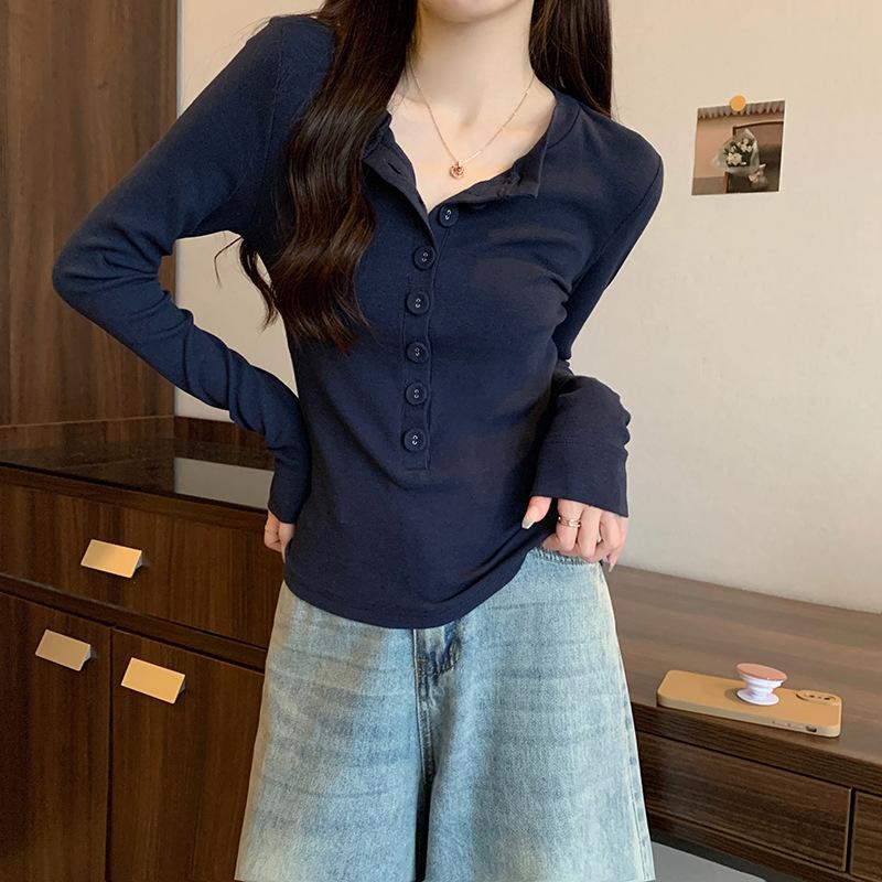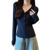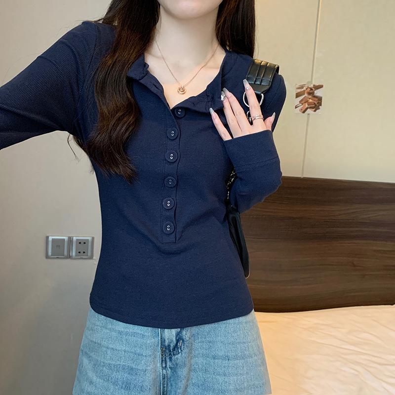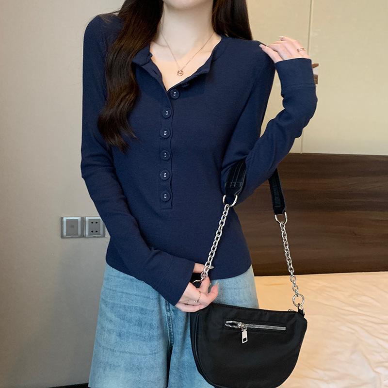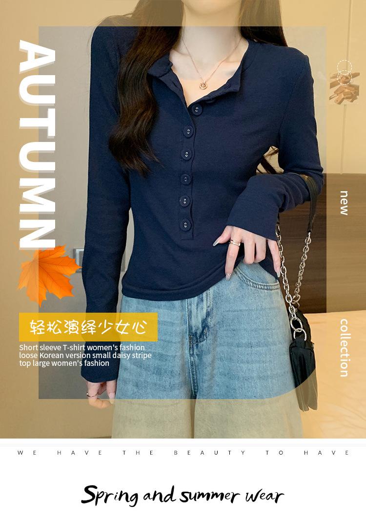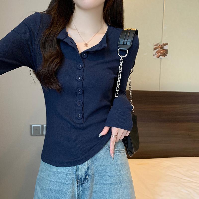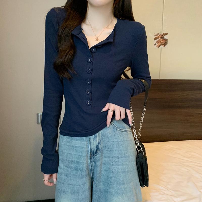Camiseta Americana Ajustada con Botones y Cuello Semiabierto de Manga Larga para Mujer Otoño 2024 Nueva Adelgazante Hot Girl Top Corto
