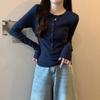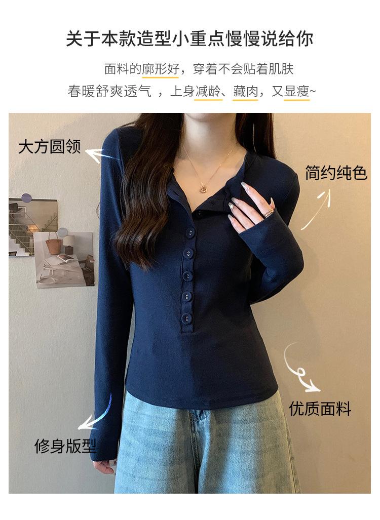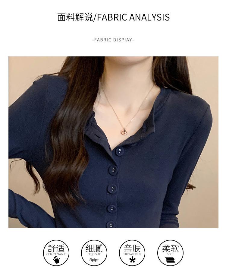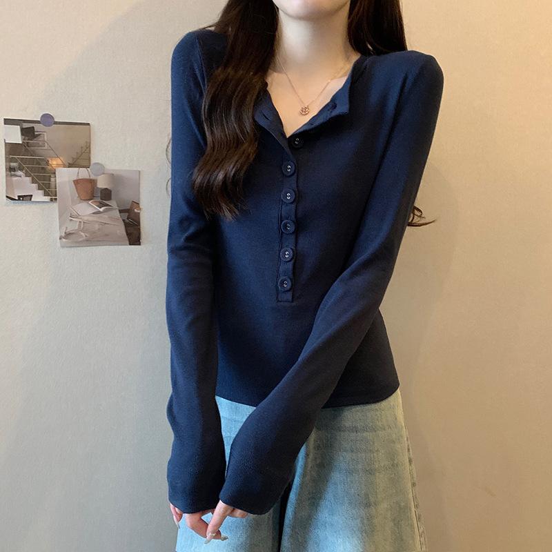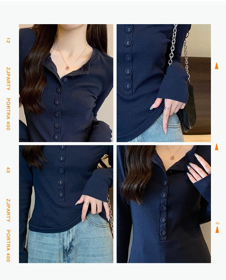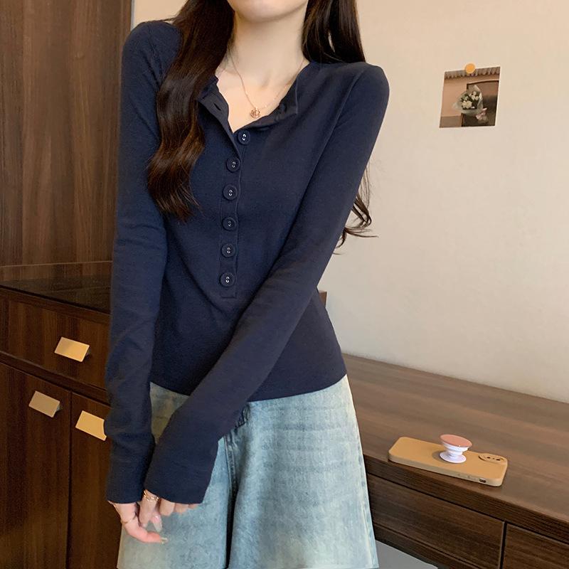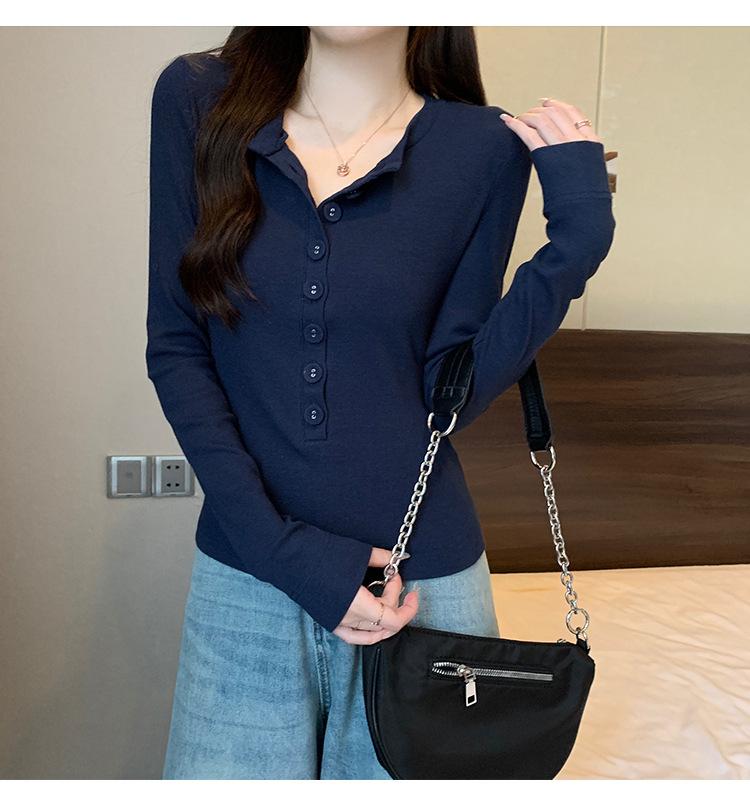 Camiseta Americana Ajustada con Botones y Cuello Semiabierto de Manga Larga para Mujer Otoño 2024 Nueva Adelgazante Hot Girl Top Corto
