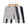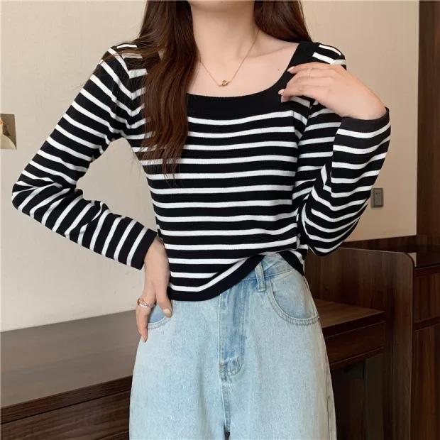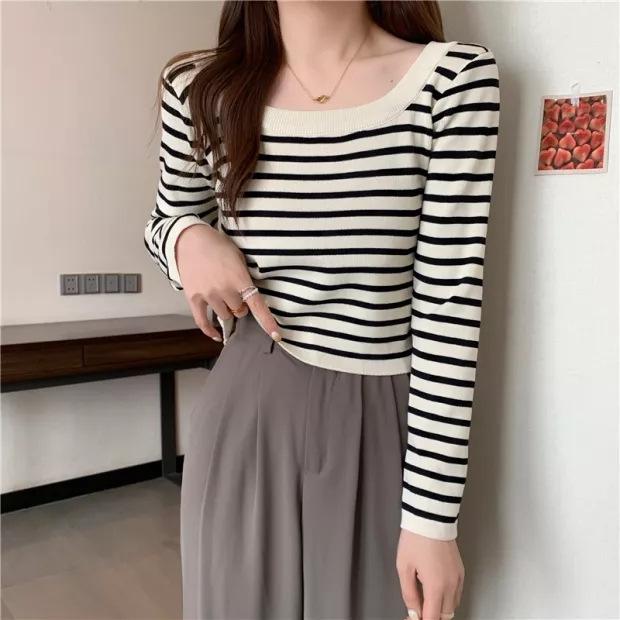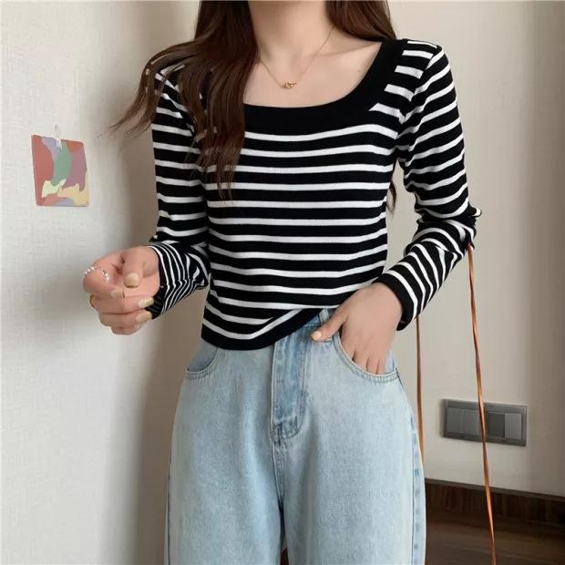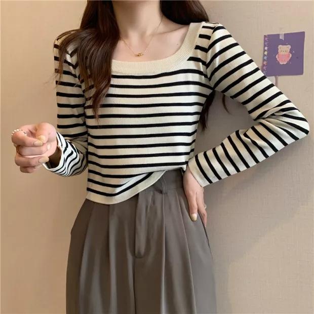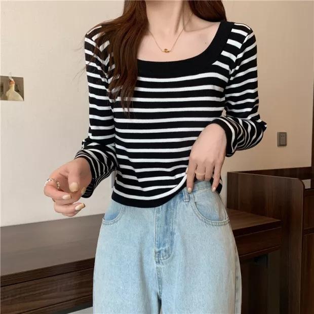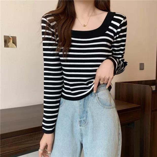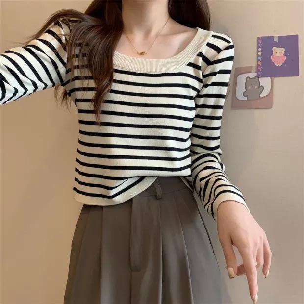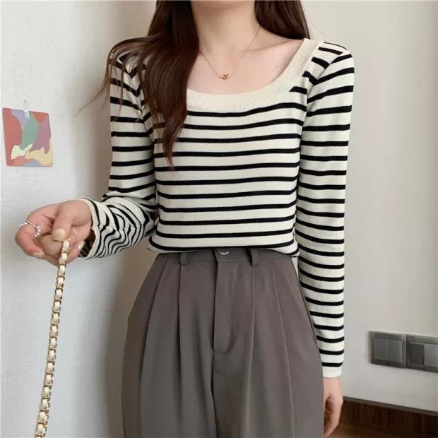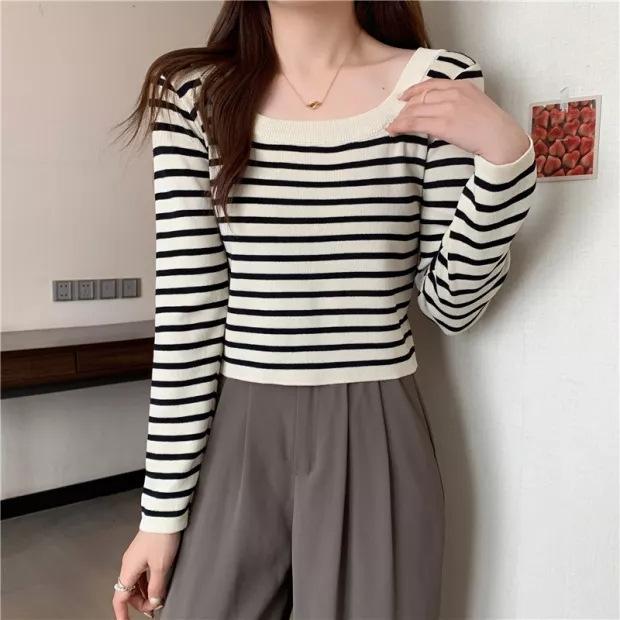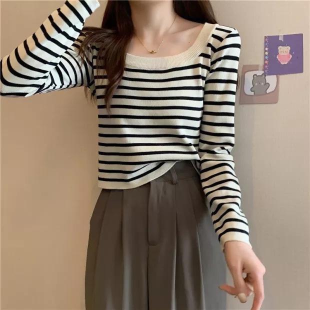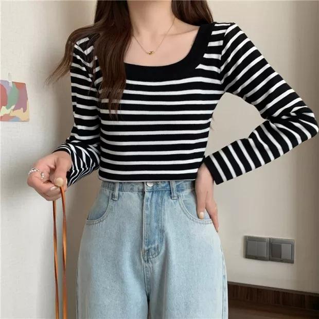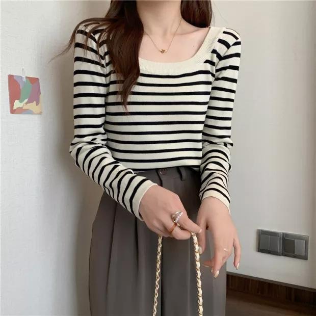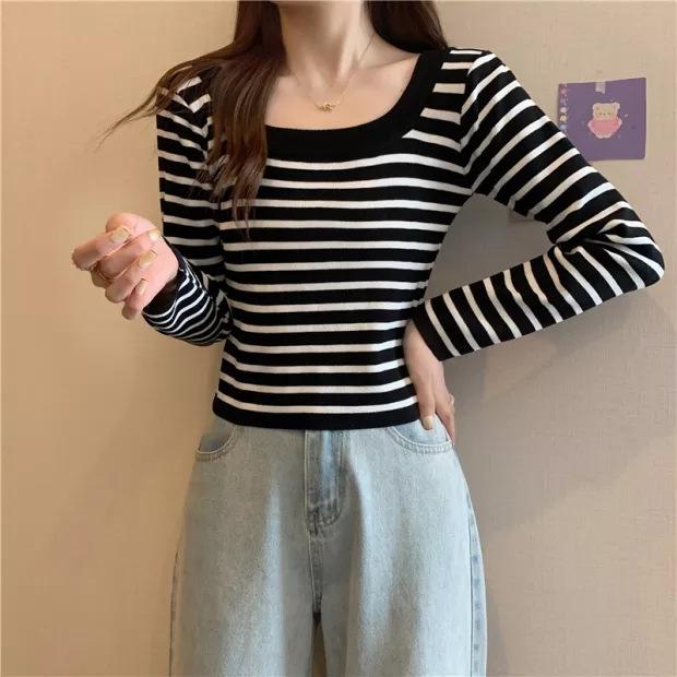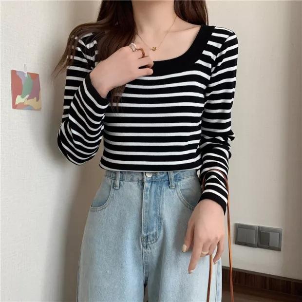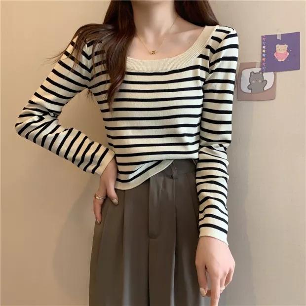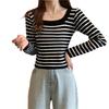 Camiseta de rayas de manga larga con cuello en U ajustada para chicas guapas Estilo Deseo Puro Sexy Combinable Moda Nicho Top Ins