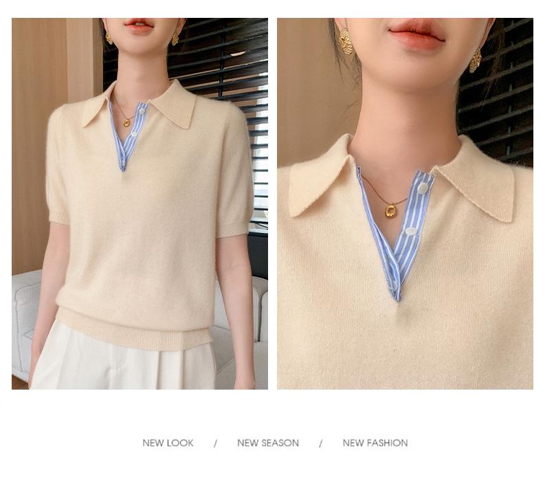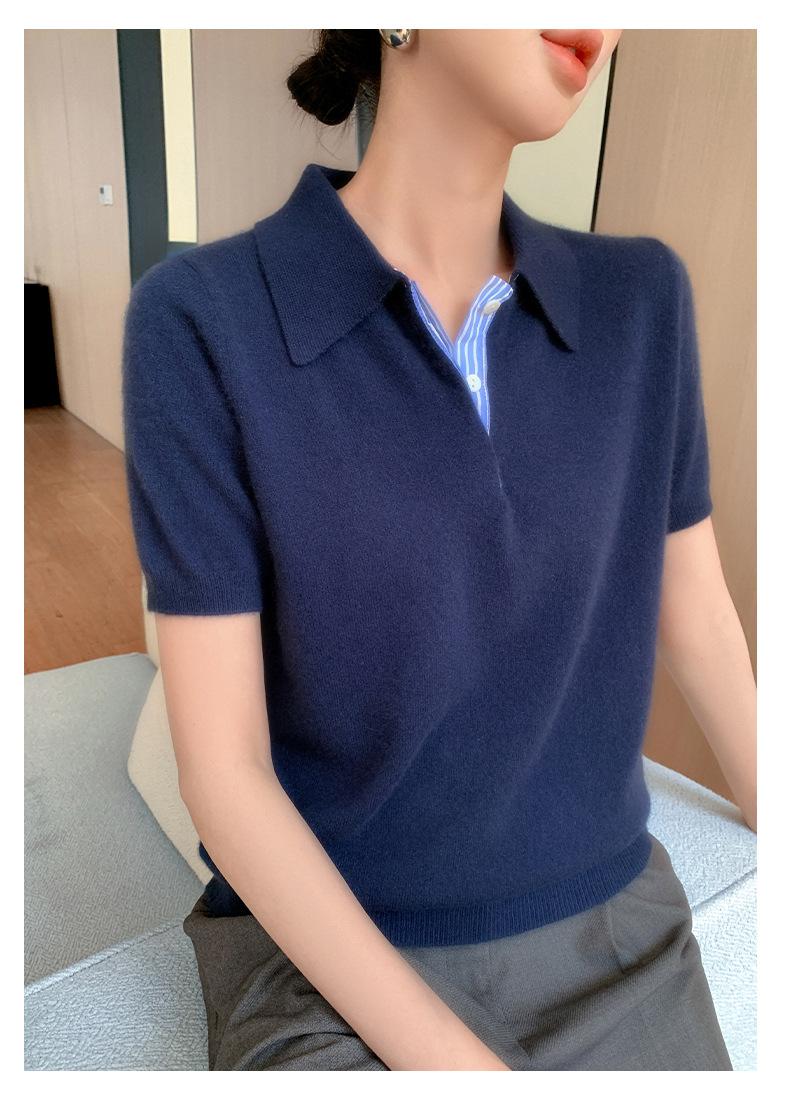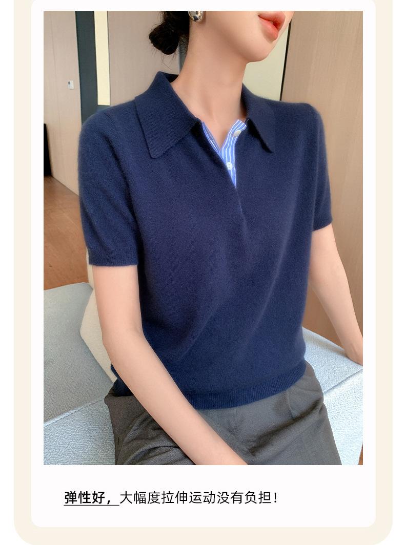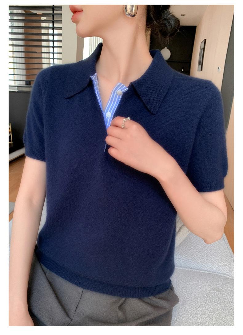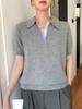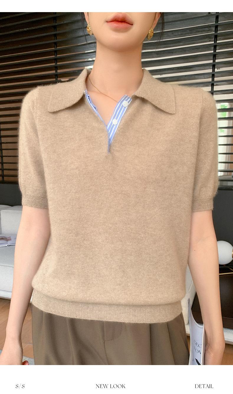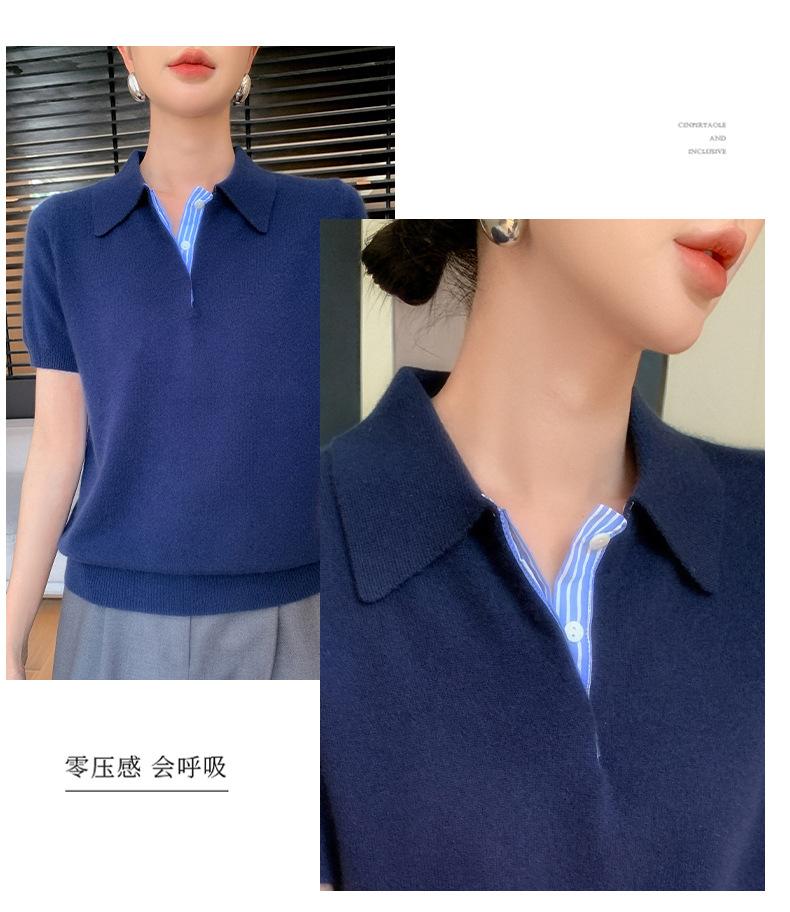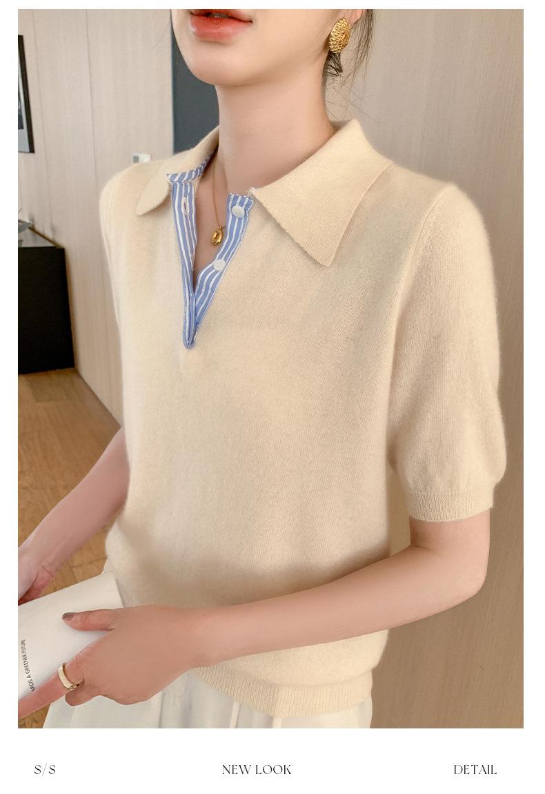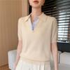 Sentido del diseño de empalme de bloques de color POLO cuello punto 2025 otoño casual simple versátil adelgazante manga corta top mujer