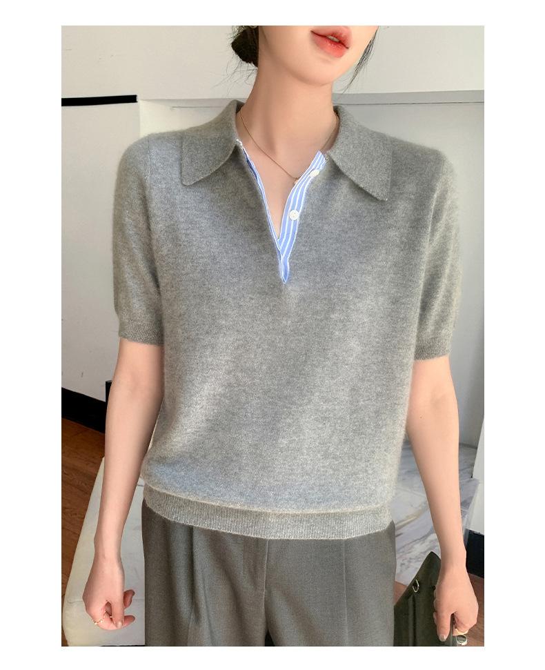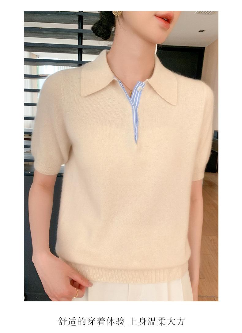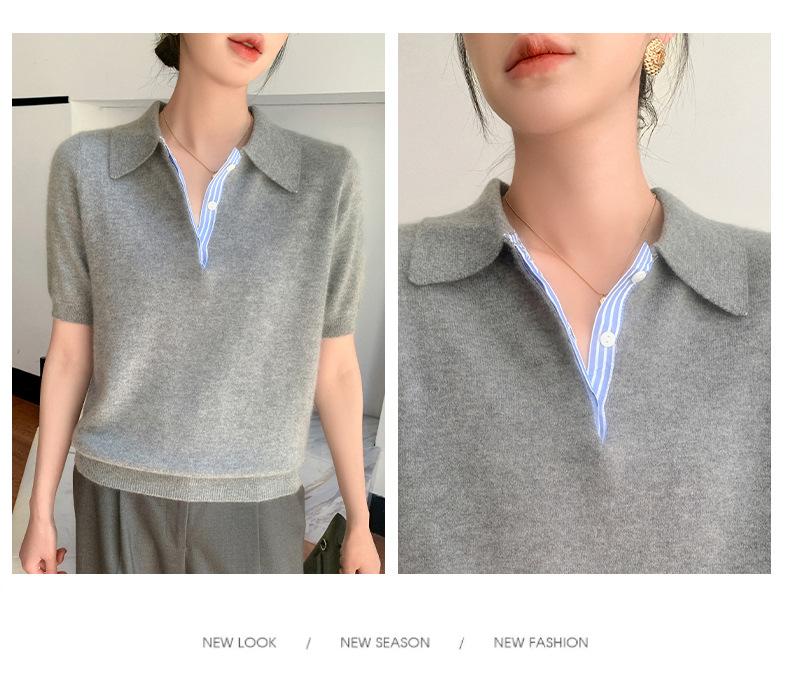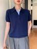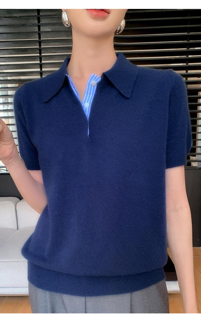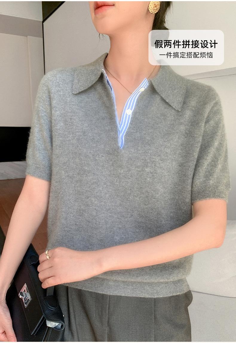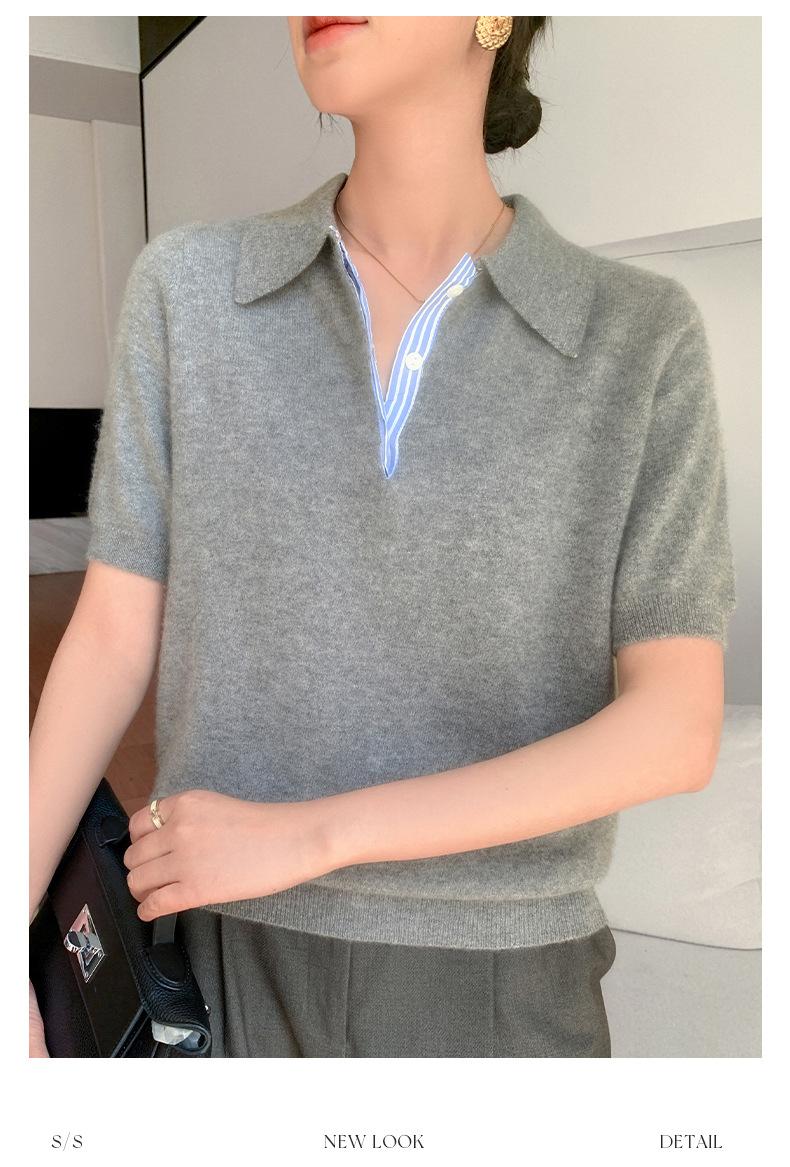 Sentido del diseño de empalme de bloques de color POLO cuello punto 2025 otoño casual simple versátil adelgazante manga corta top mujer