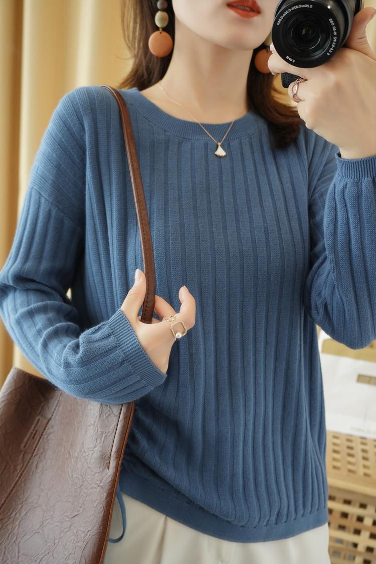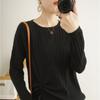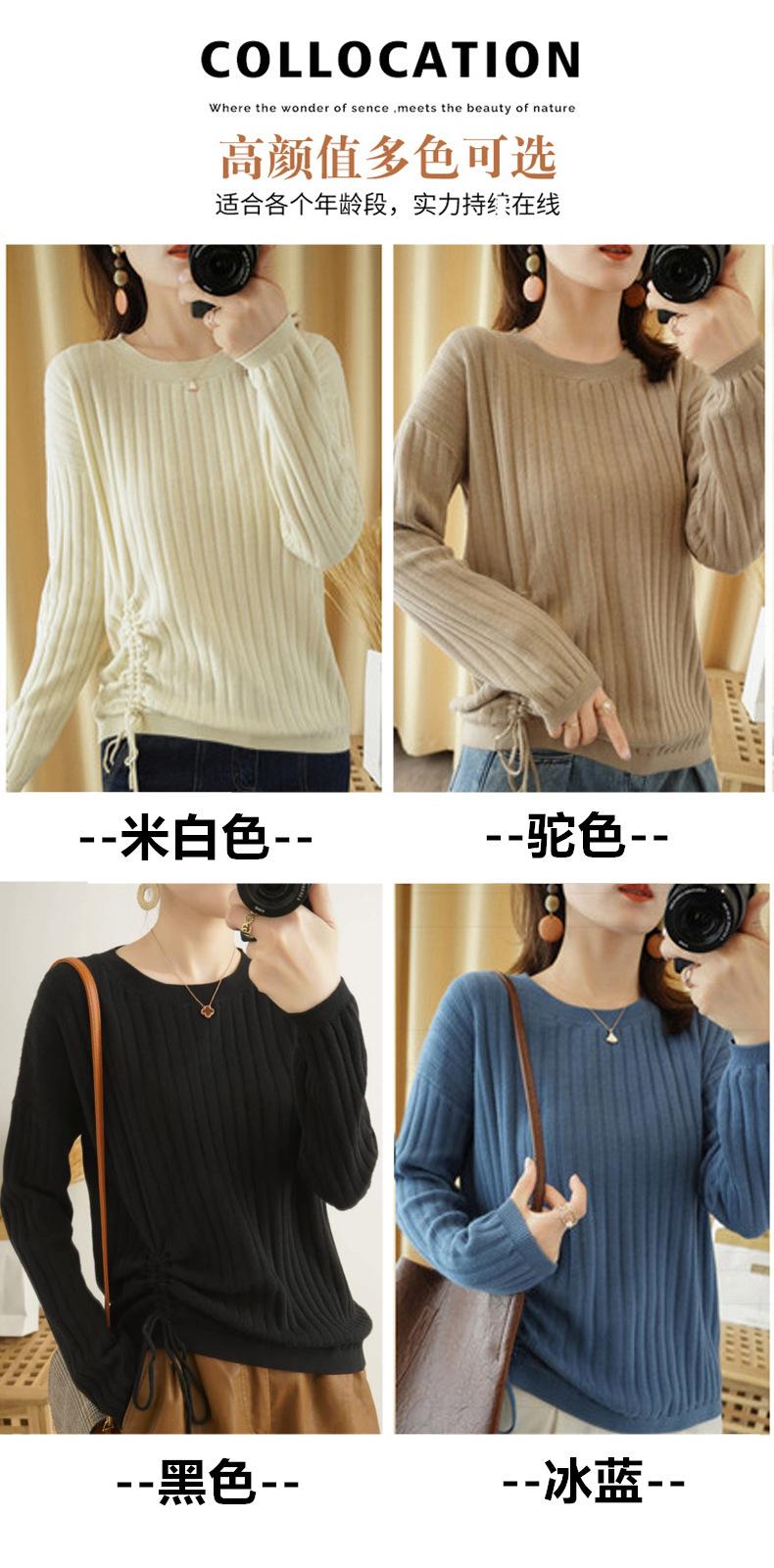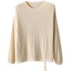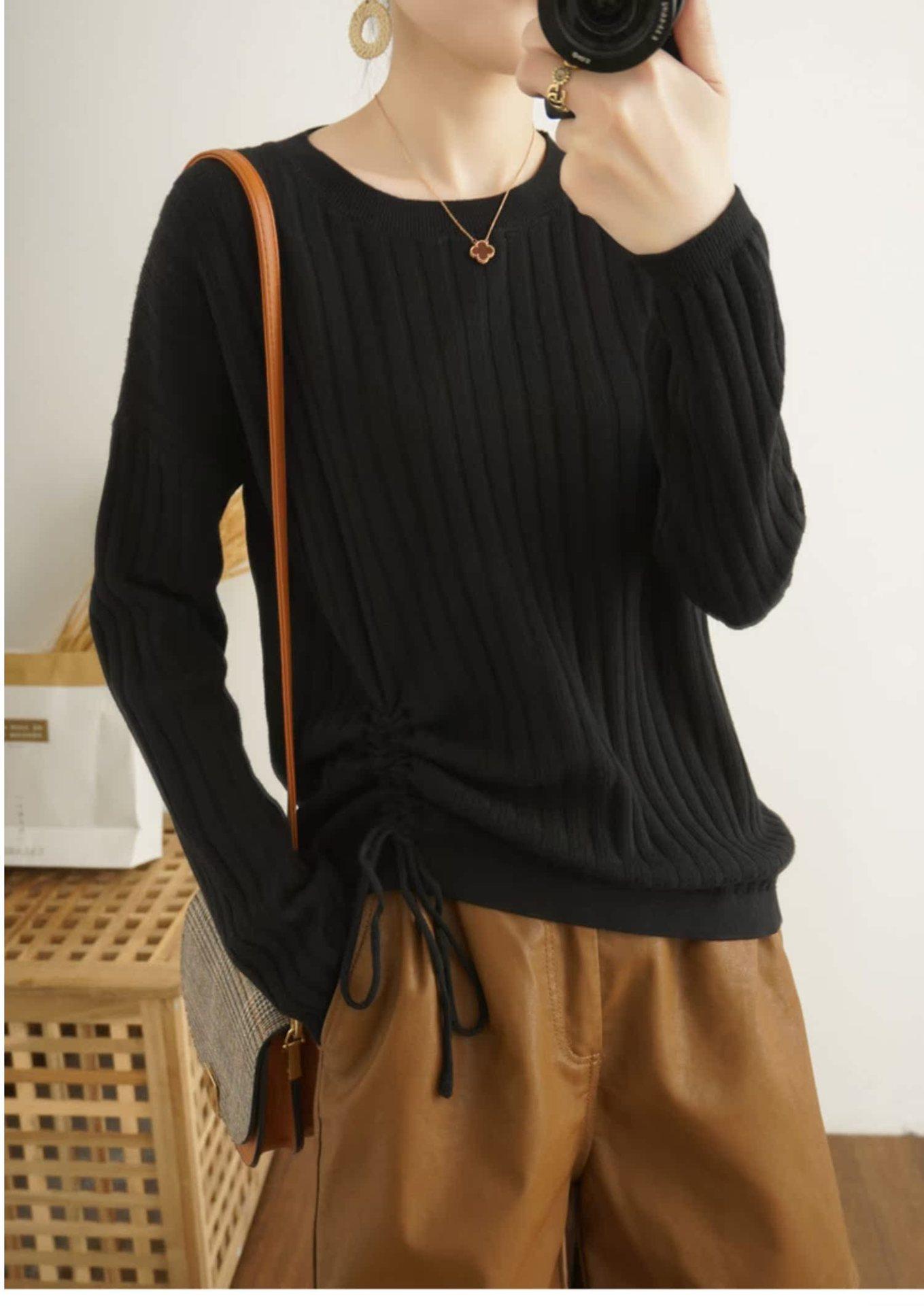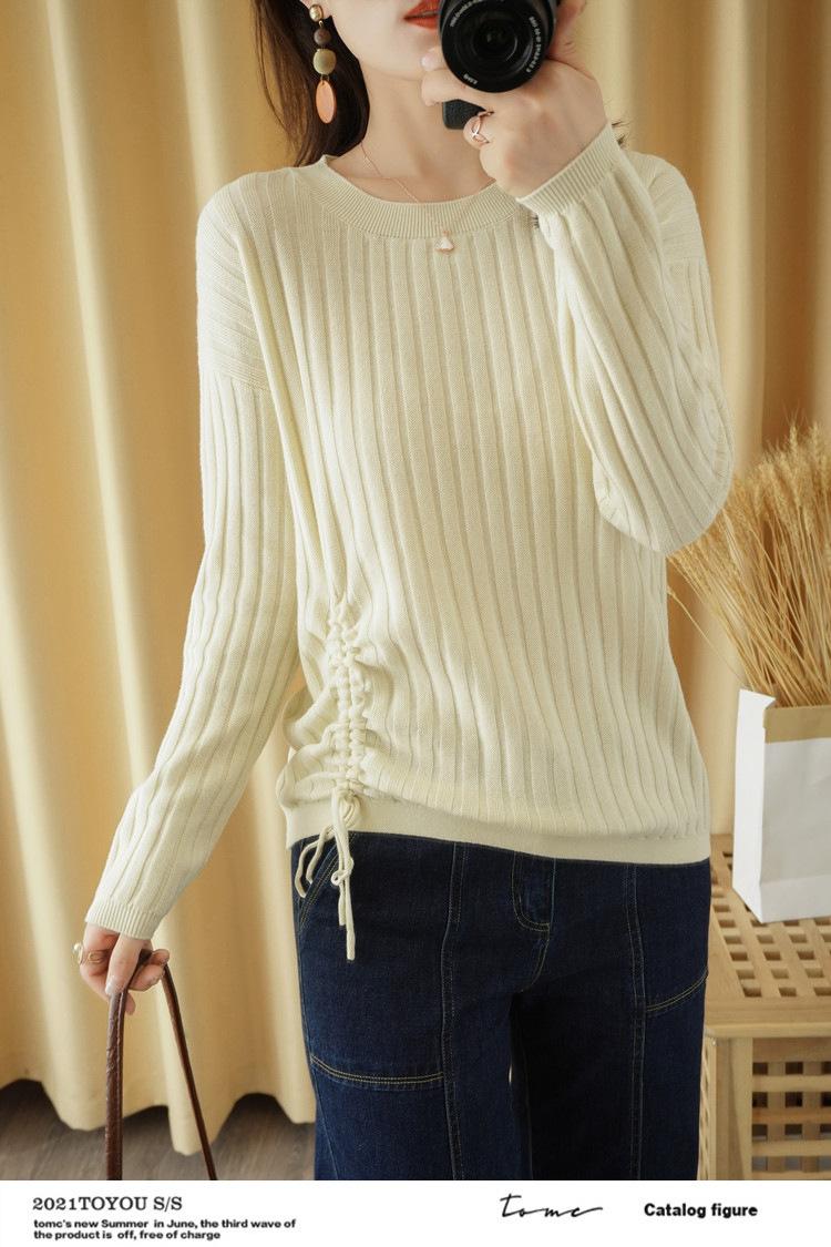 2025 primavera y verano nuevo suéter de algodón puro de cuello redondo manga larga con cordón lateral en la sisa color sólido jersey camiseta básica mujer