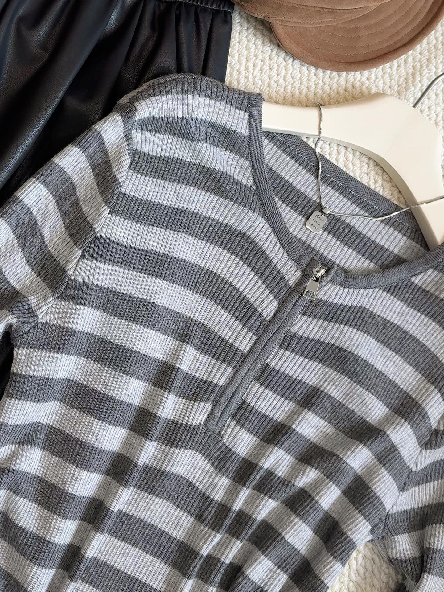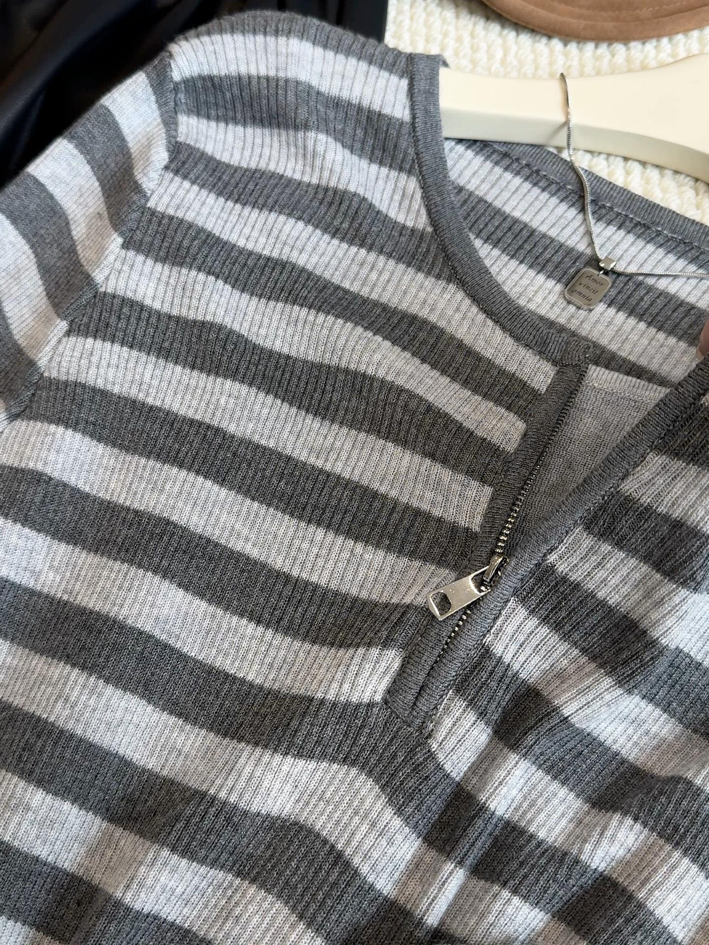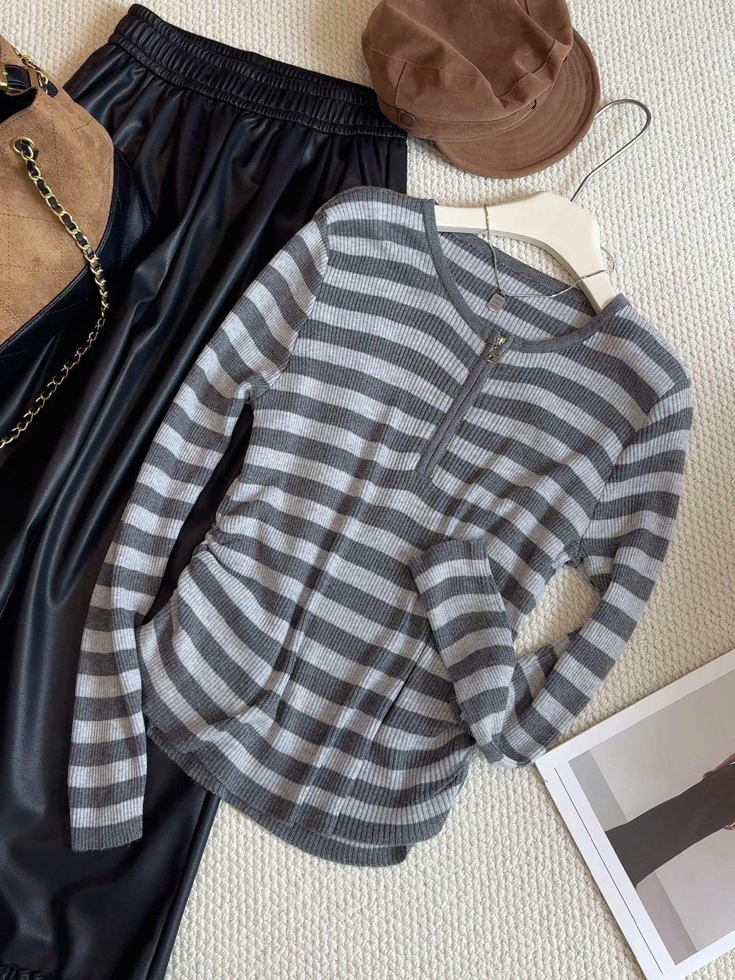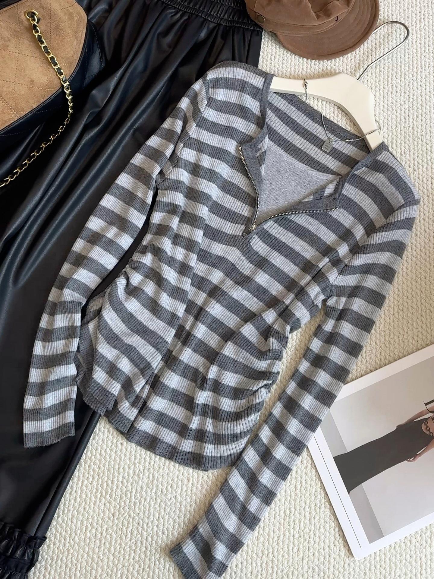 Top de Punto de Manga Larga con Rayas Estilo Coreano de Media Cremallera Falso de Dos Piezas para Mujer 2025 Ambiente Otoño Temprano Conjunto Adelgazante Capa Base