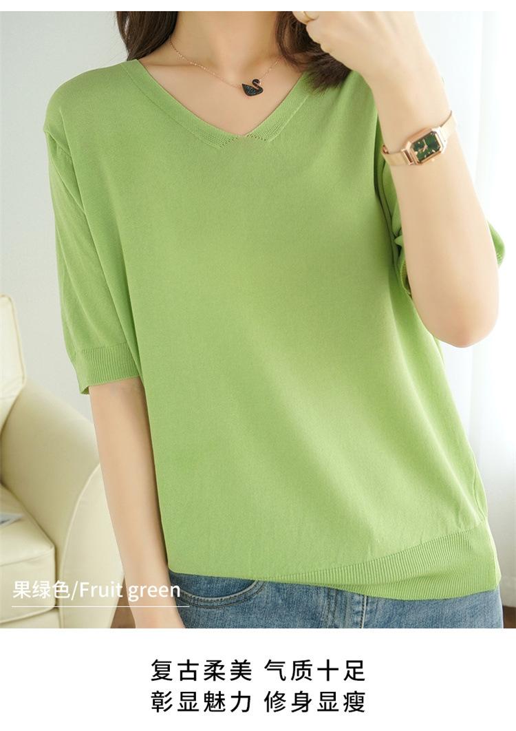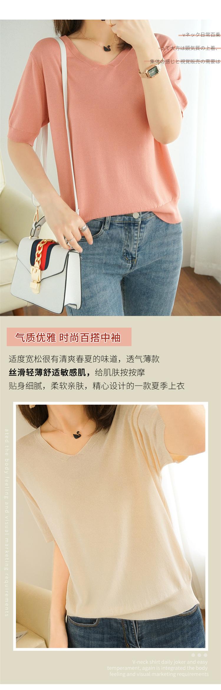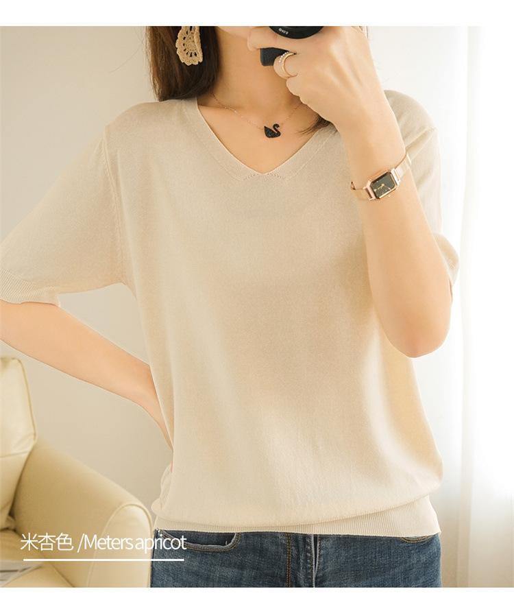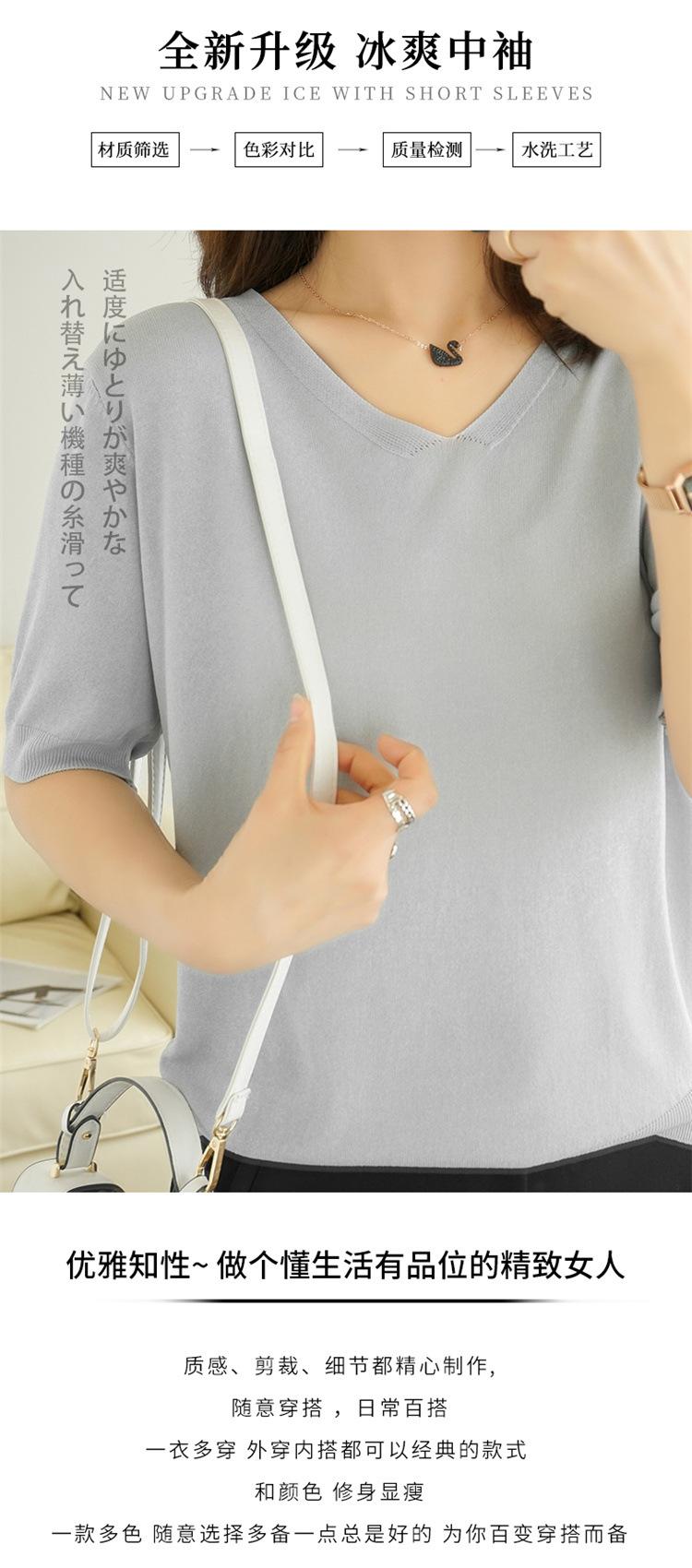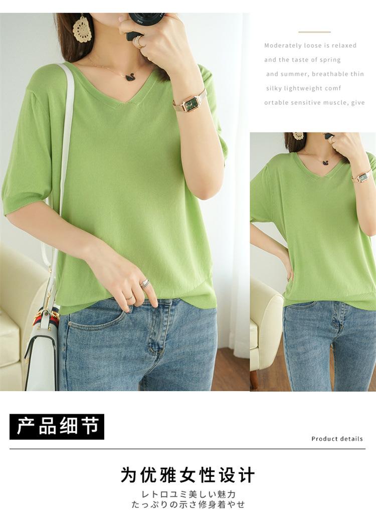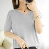 Suéter Nuevo de Primavera y Verano 2025 con Cuello en V Manga Media Color Sólido Holgado Jersey Elegante Camiseta Básica Top para Mujer