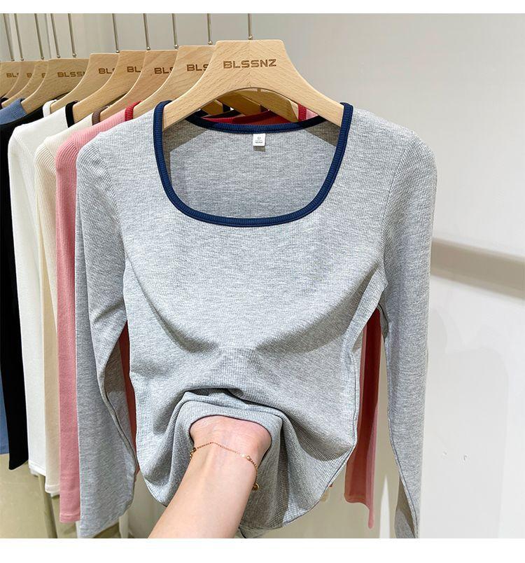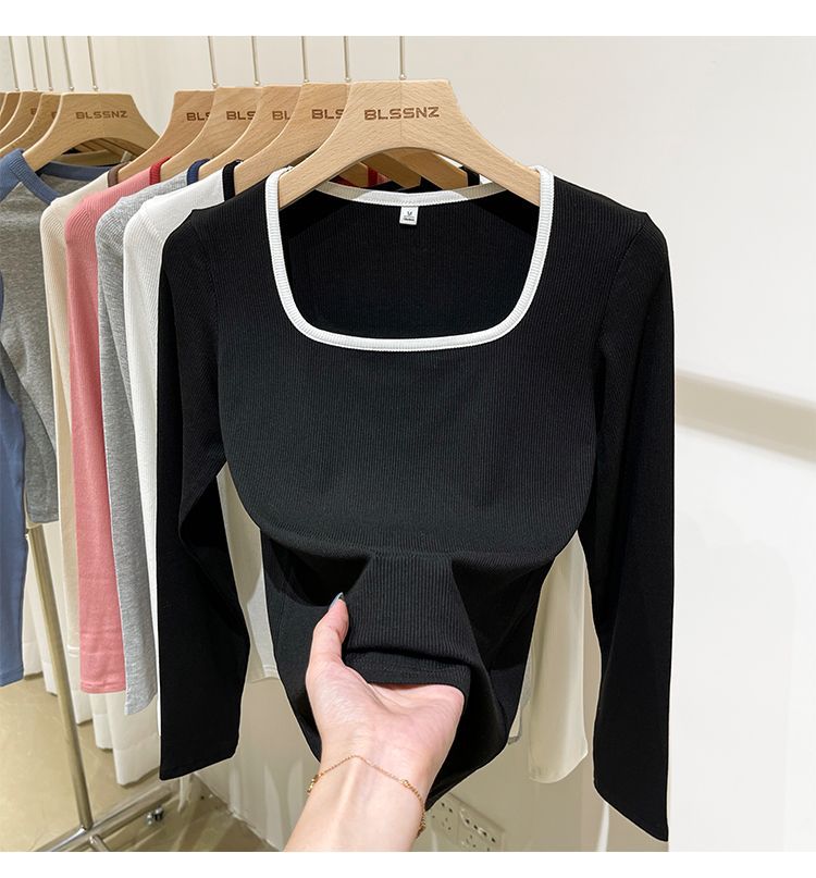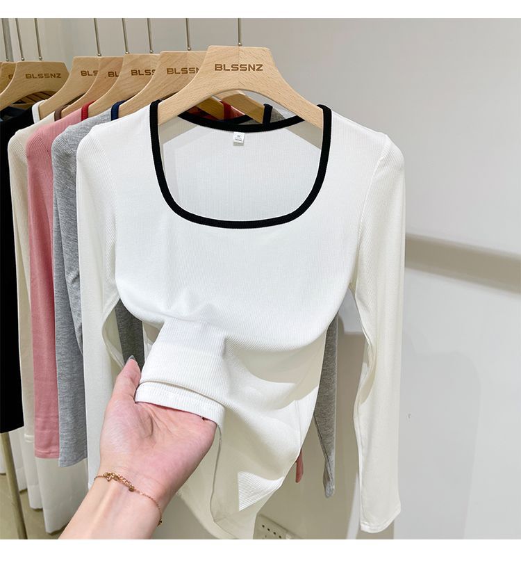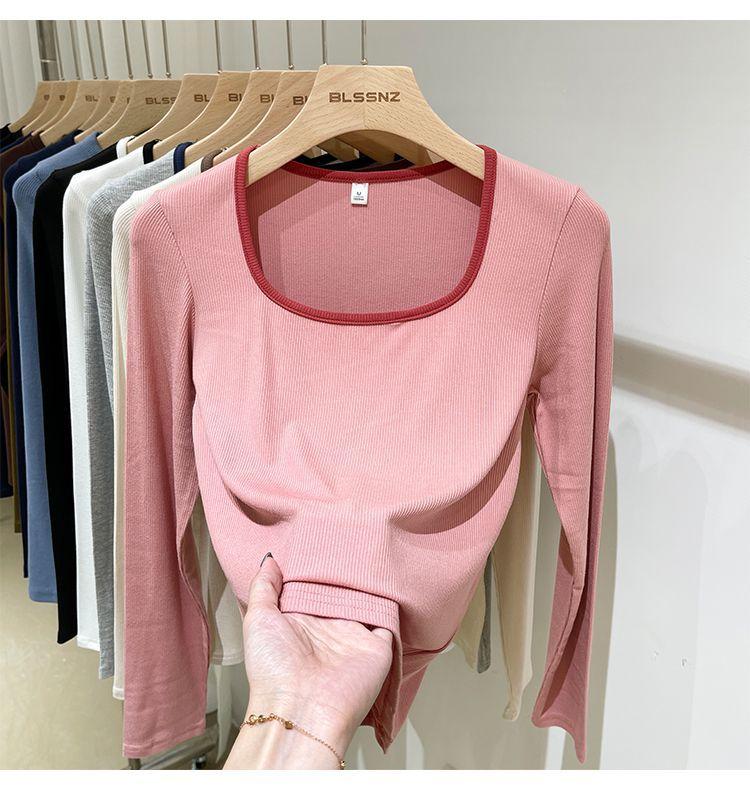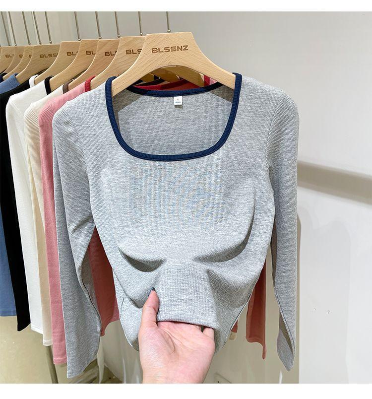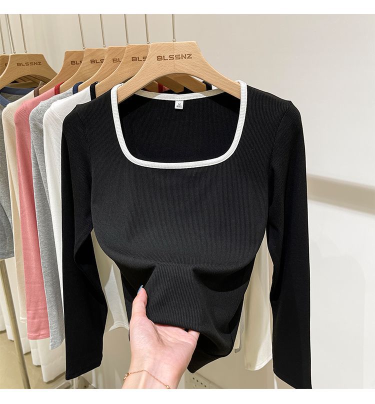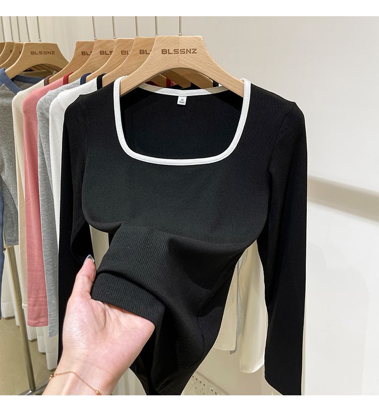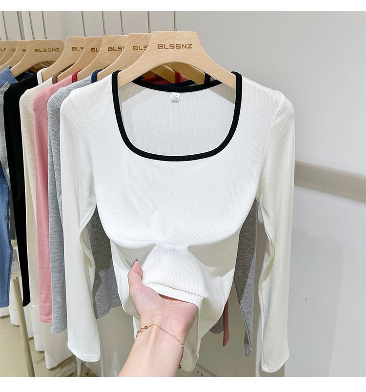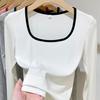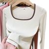 Playera de Moda de Cuello Cuadrado y Manga Larga para Mujer Principios de Otoño Nuevo Diseño Europeo Ajuste Slim Top Corto Interior Camiseta Base Trendy