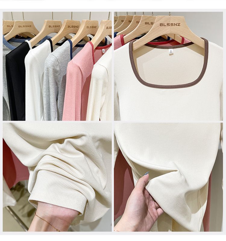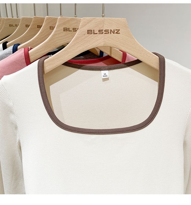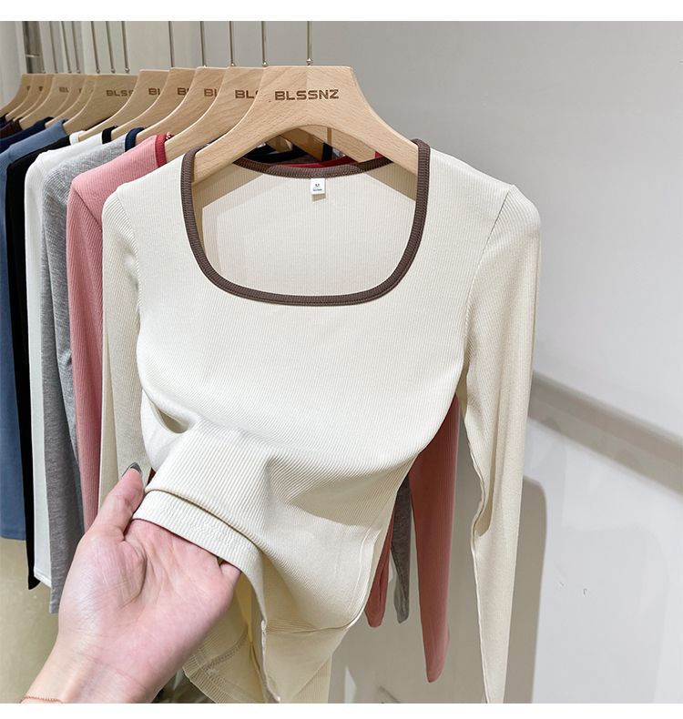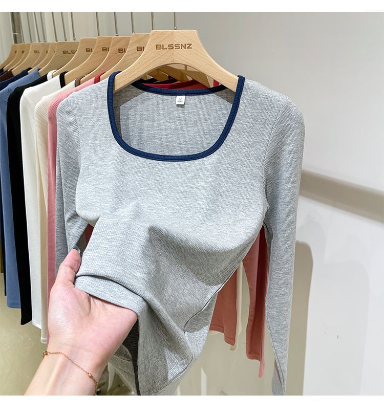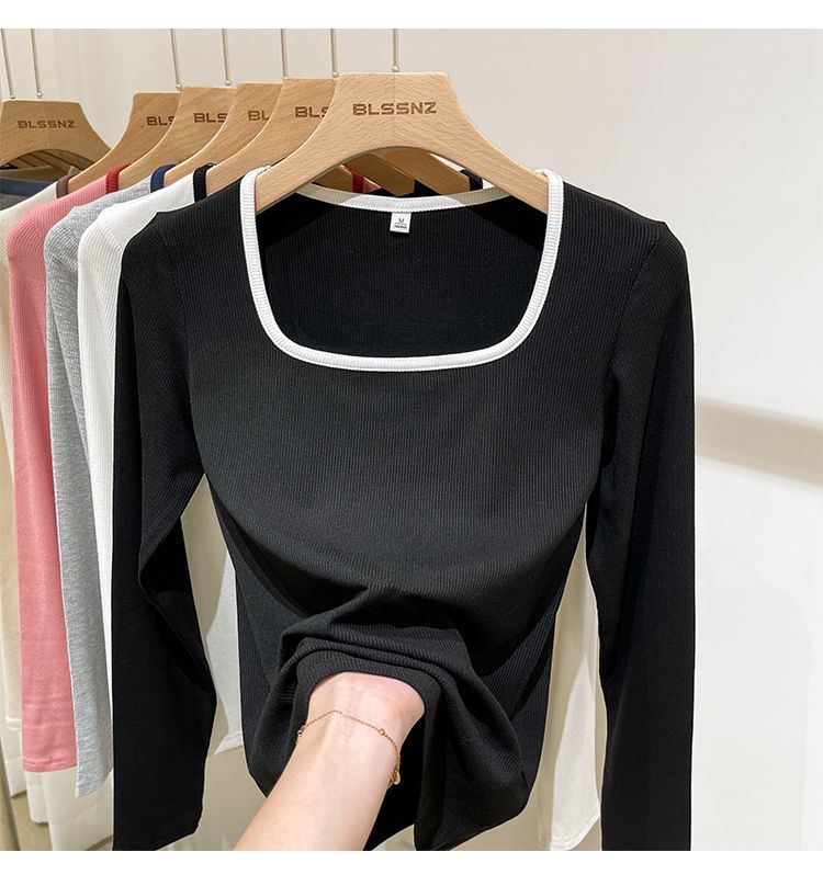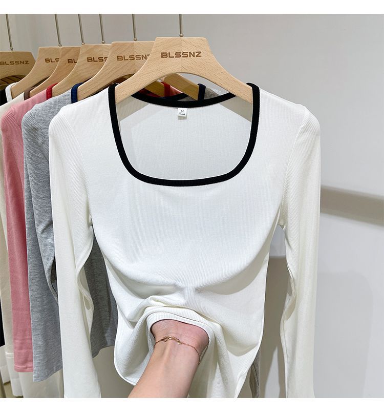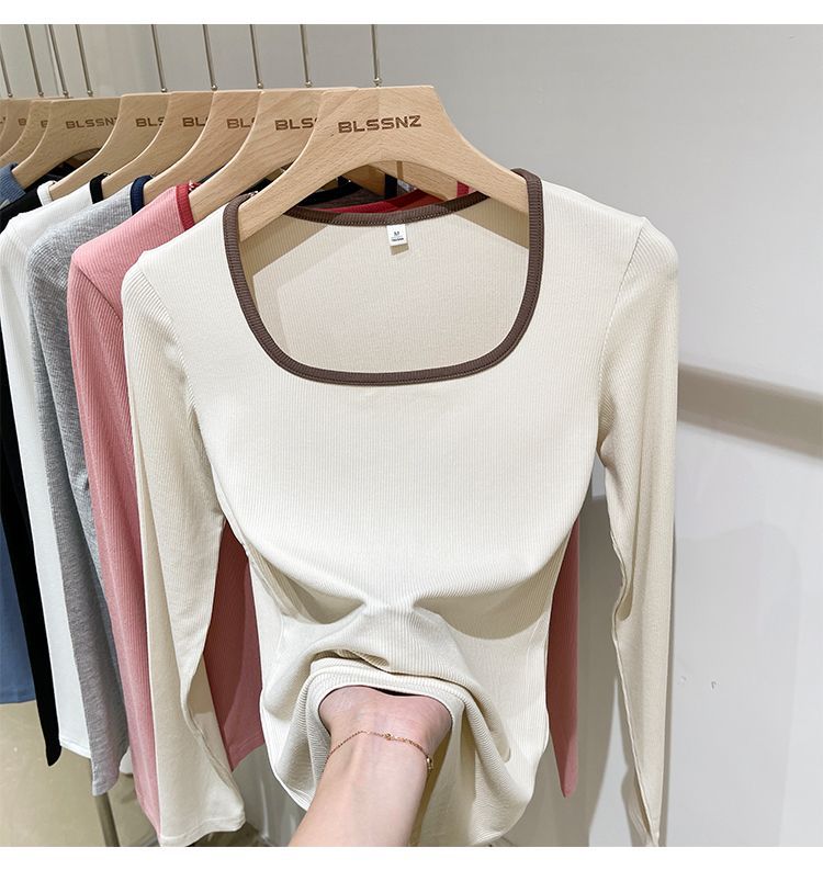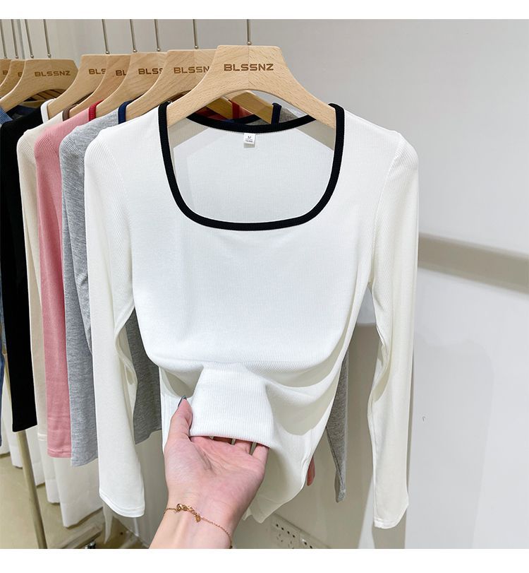 Playera de Moda de Cuello Cuadrado y Manga Larga para Mujer Principios de Otoño Nuevo Diseño Europeo Ajuste Slim Top Corto Interior Camiseta Base Trendy