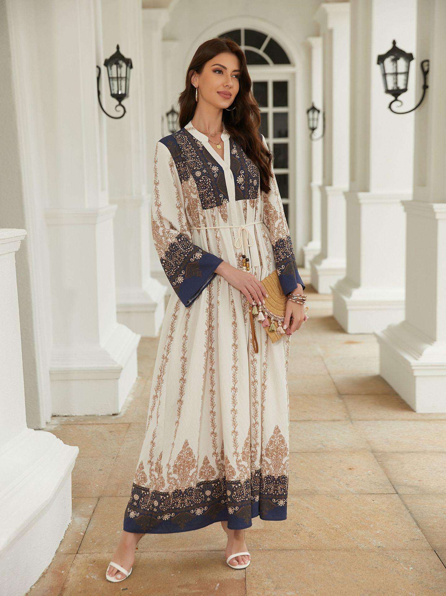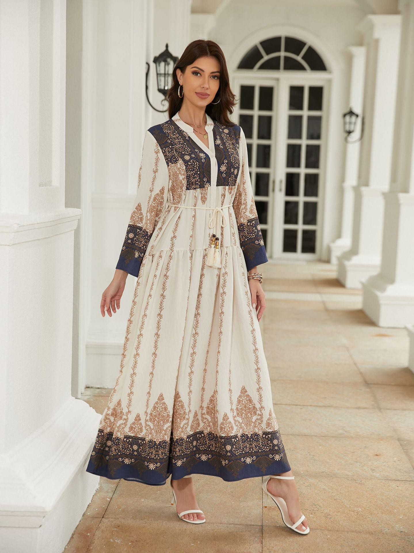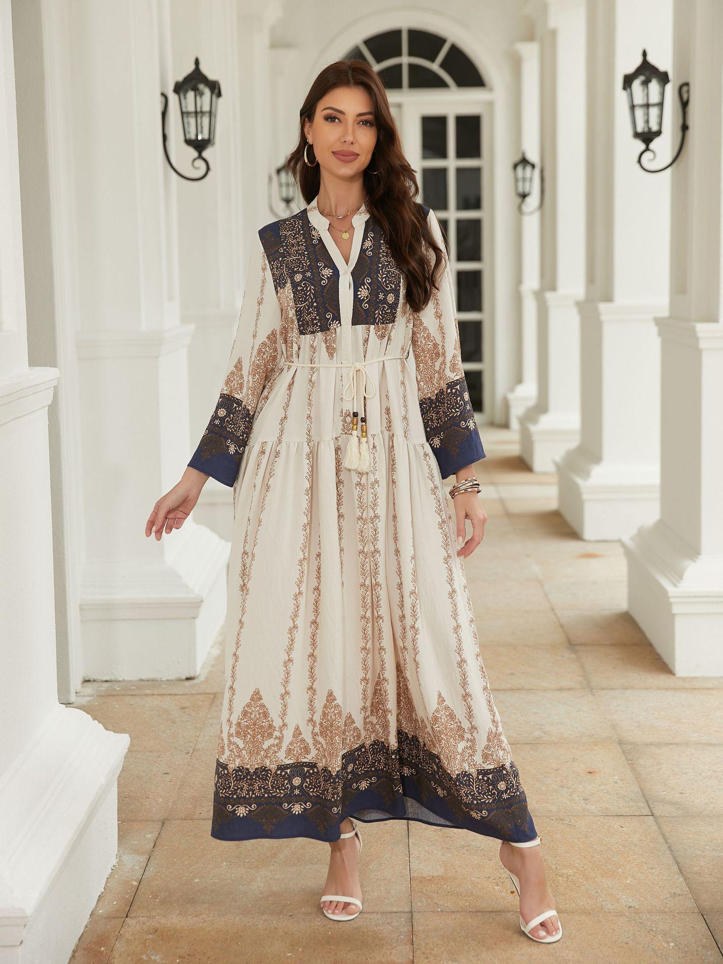 Nuevo Vestido Elegante Estampado de Algodón Seda de Manga Larga para Mujer de Amazon Cross-Border Cómodo Moda Musulmana Vestido de Verano