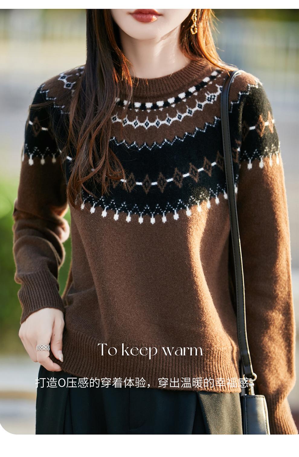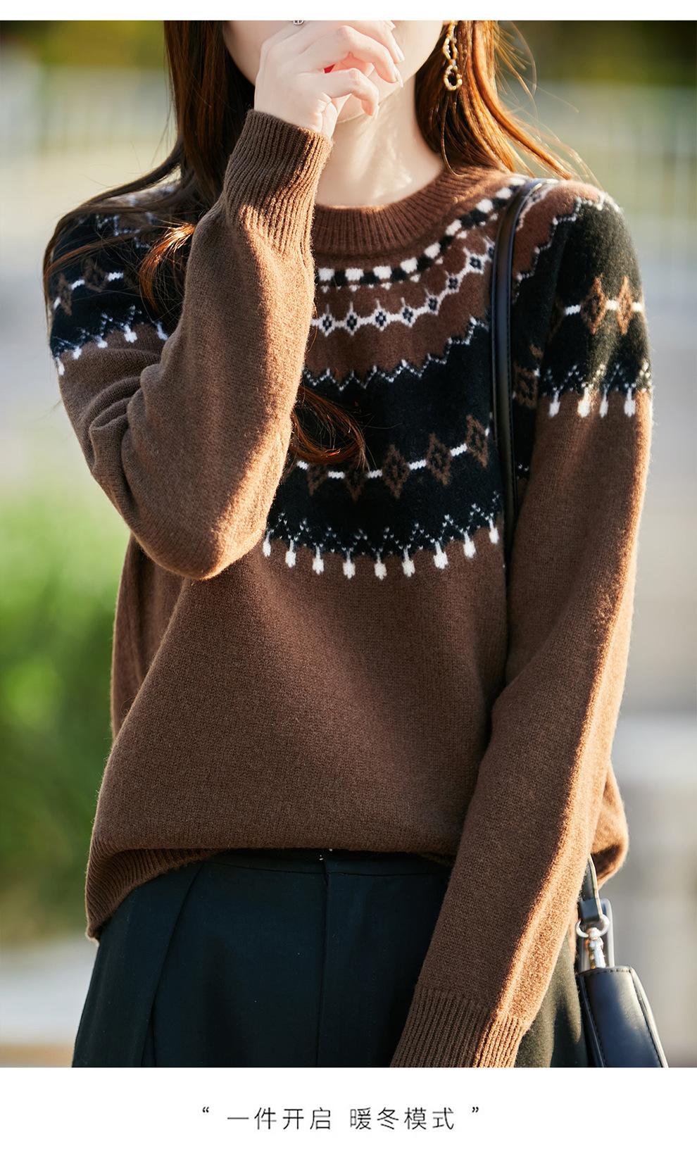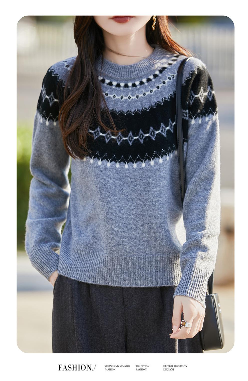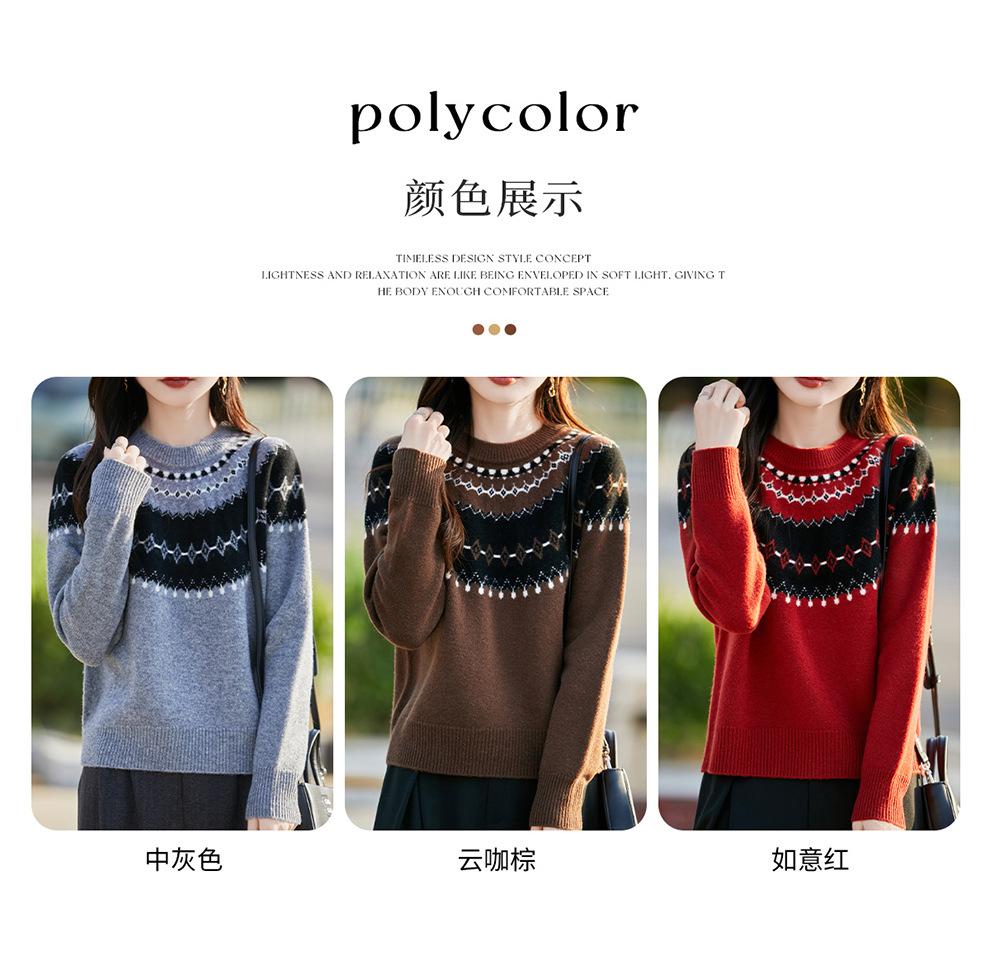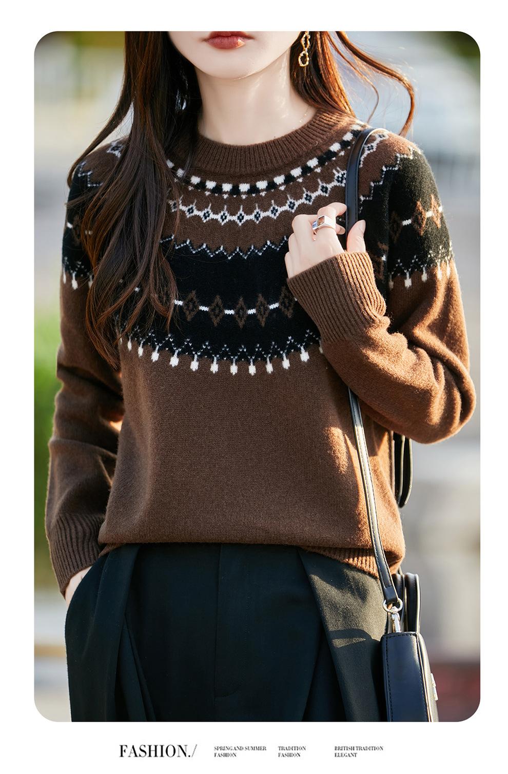 25 Otoño/Invierno Nuevo Estilo Lana Pura Cuello Redondo Suéter Tejido Manga Larga Mujer Jacquard Jersey Suave y Cálido Capa Base Top