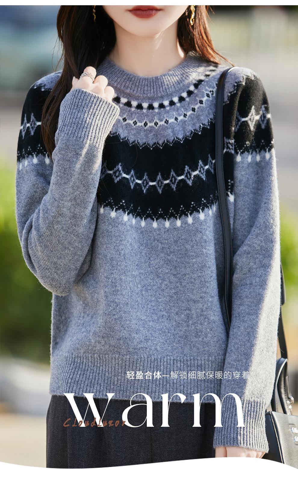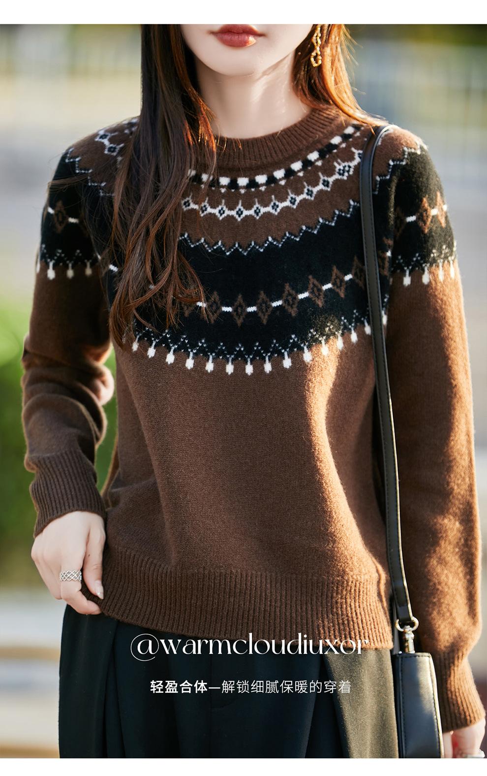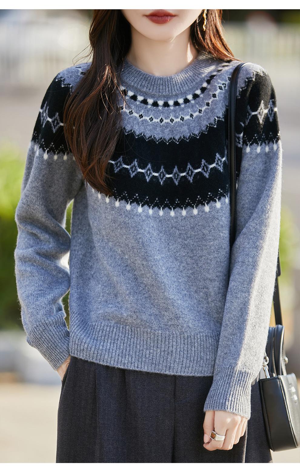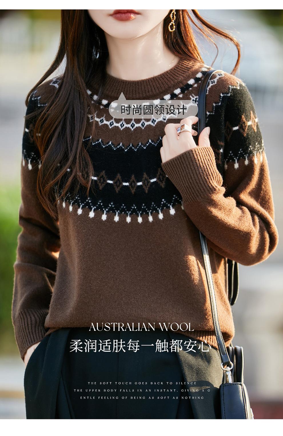 25 Otoño/Invierno Nuevo Estilo Lana Pura Cuello Redondo Suéter Tejido Manga Larga Mujer Jacquard Jersey Suave y Cálido Capa Base Top