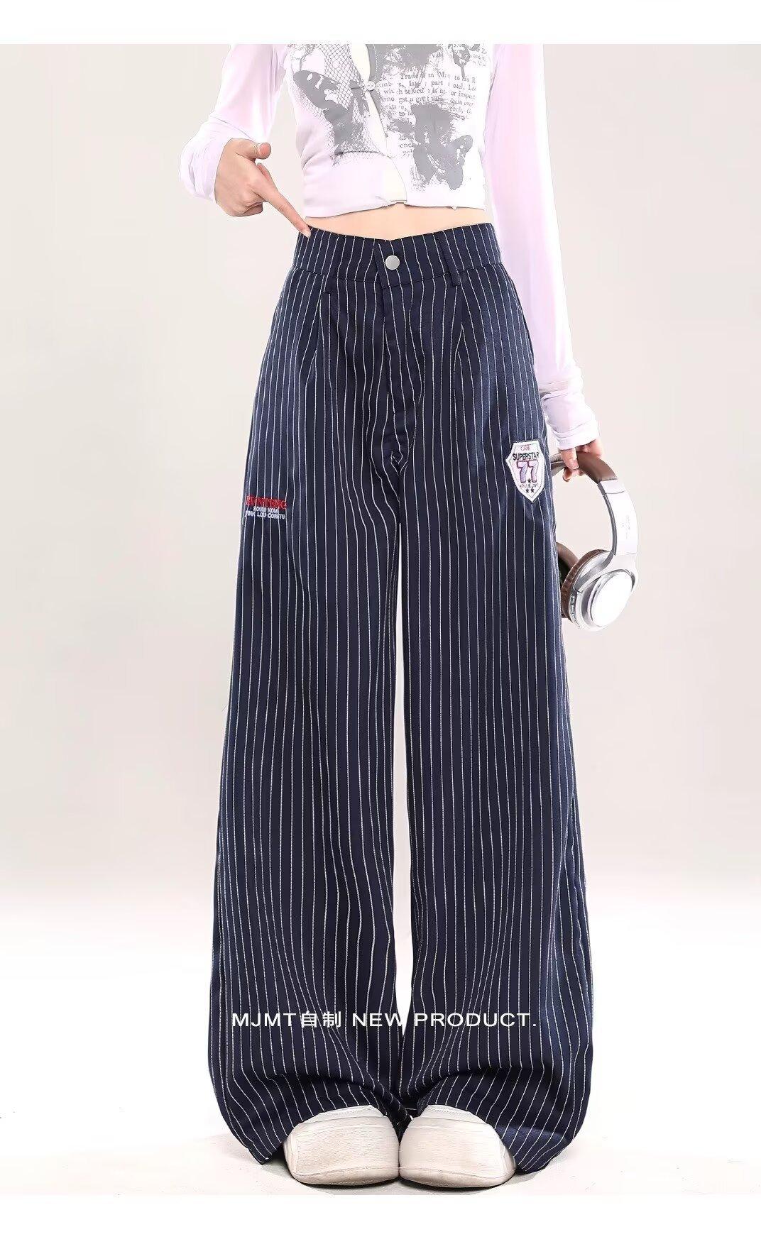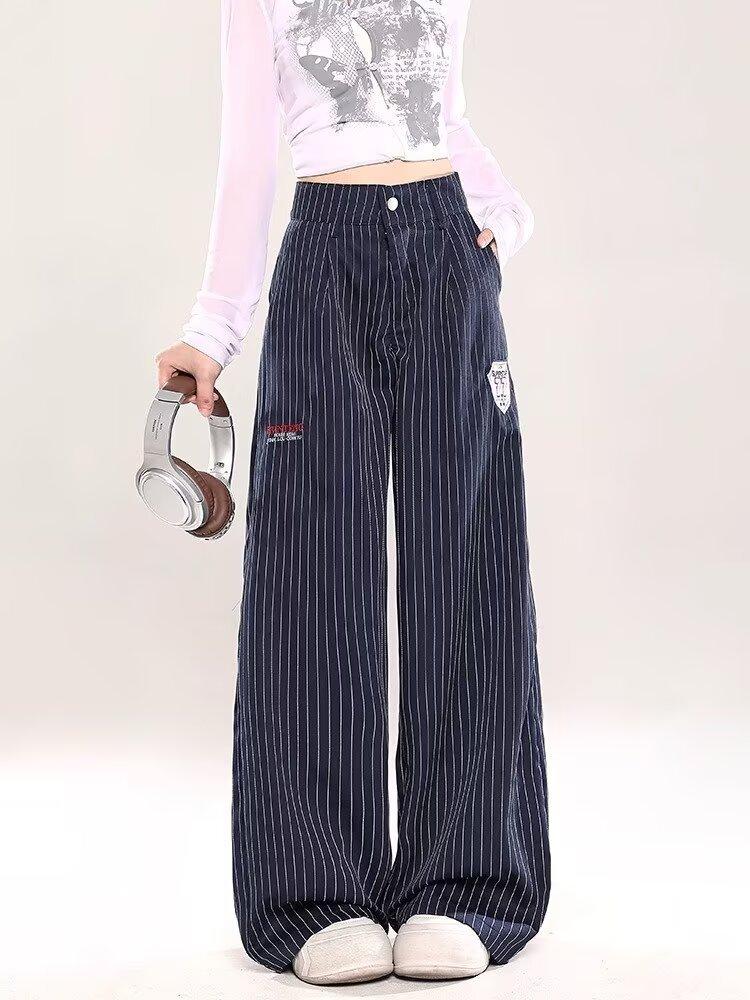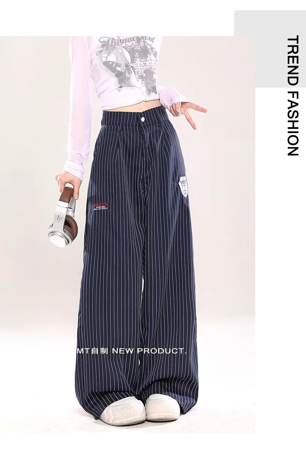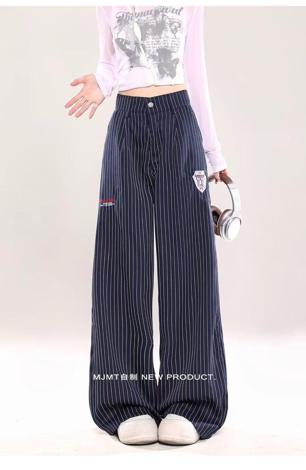 Pantalones anchos a rayas retro americanos para mujer verano nuevo cintura alta adelgazantes sueltos con caída pierna recta casuales hasta el suelo