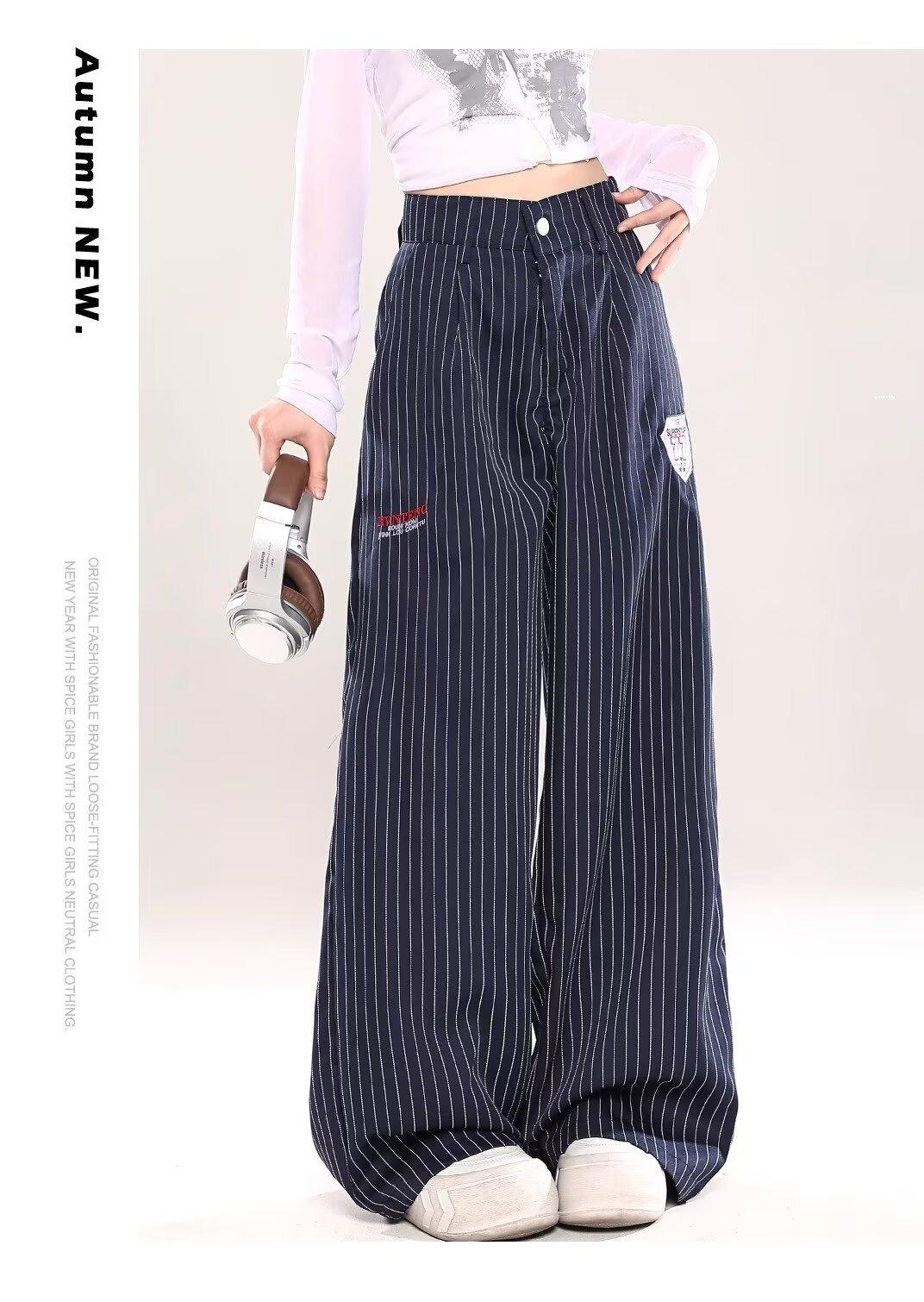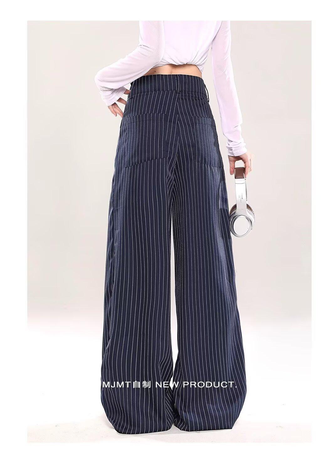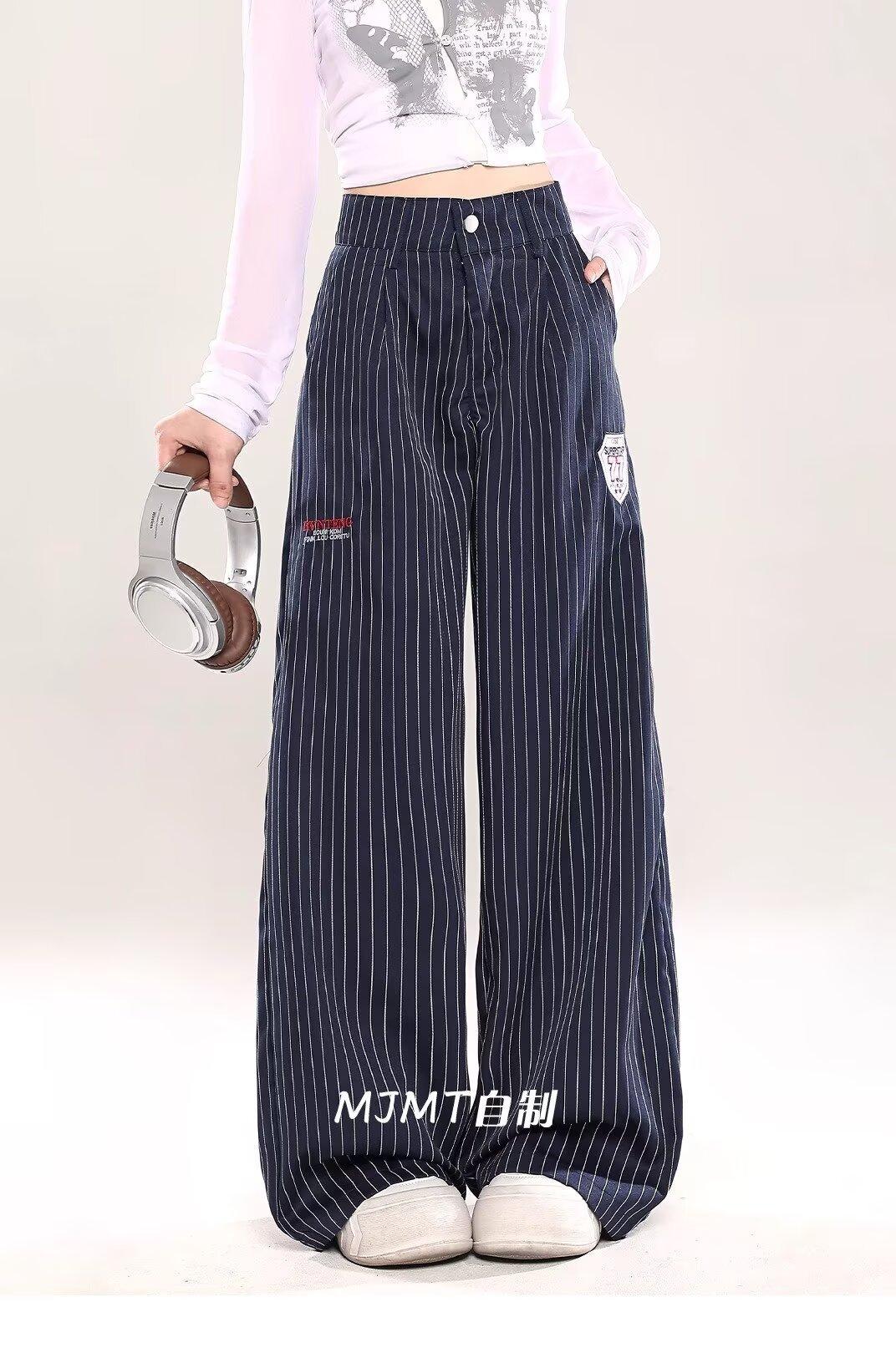 Pantalones anchos a rayas retro americanos para mujer verano nuevo cintura alta adelgazantes sueltos con caída pierna recta casuales hasta el suelo