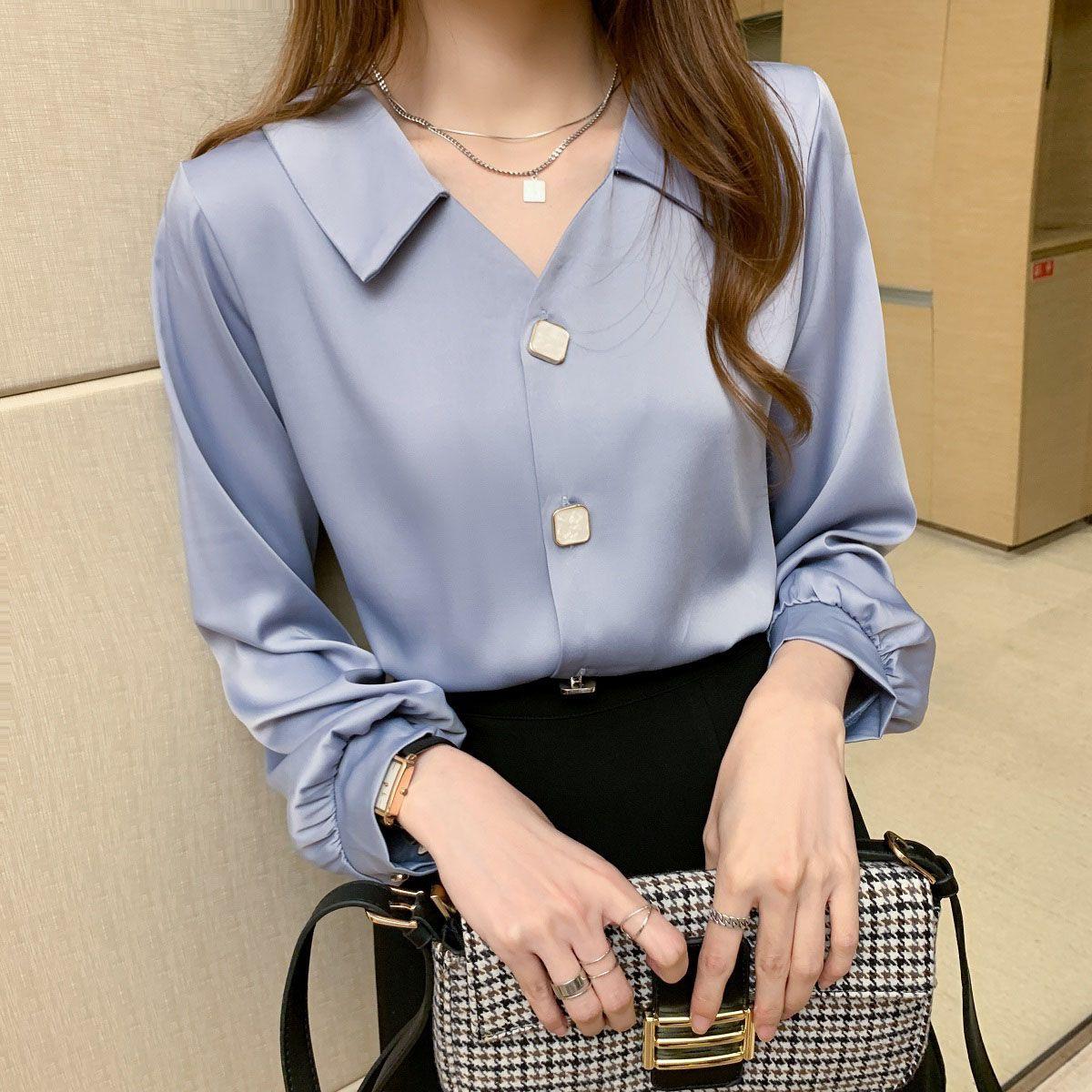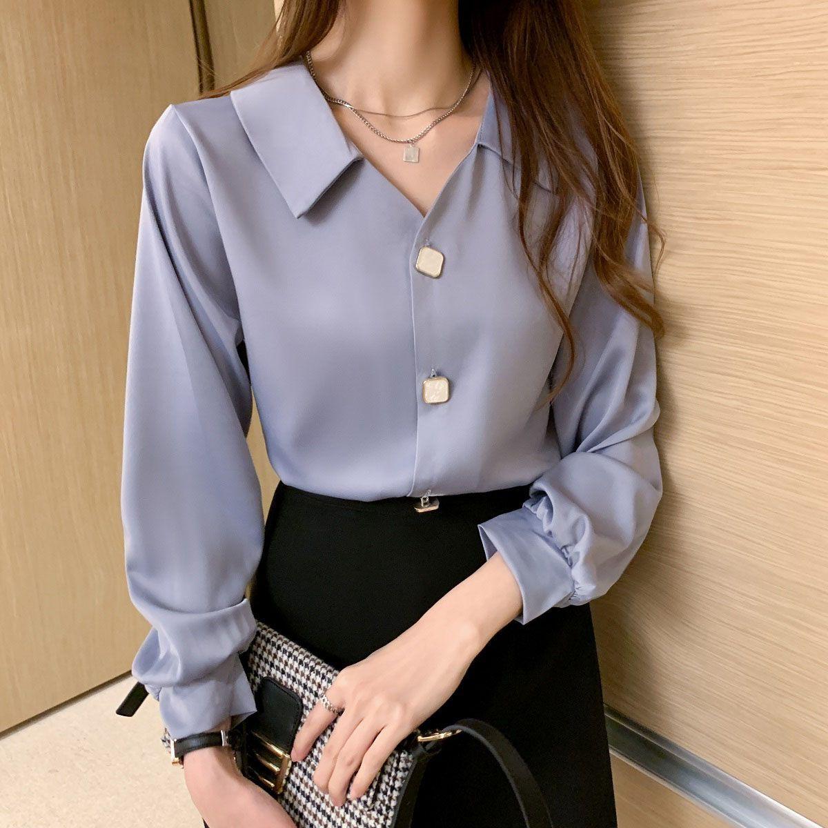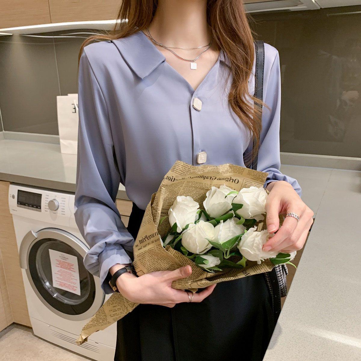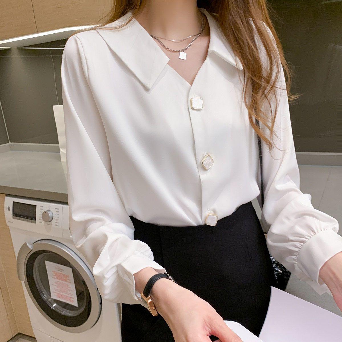 Camisa Delgada de Primavera y Otoño Cuello en V Chifón Camisa Blanca para Mujer Manga Larga Holgada Combinable Color Sólido Top