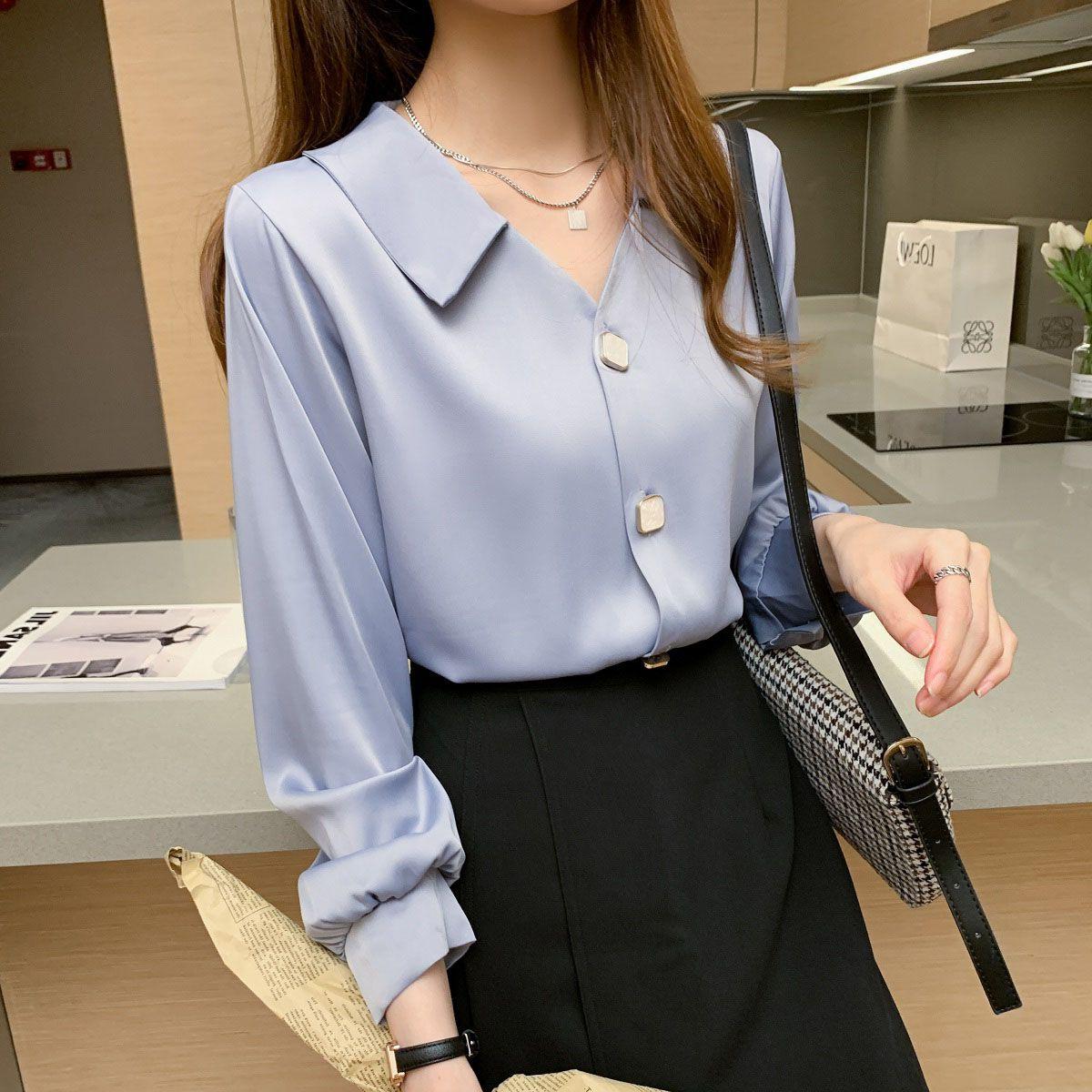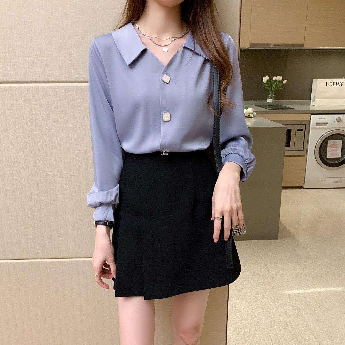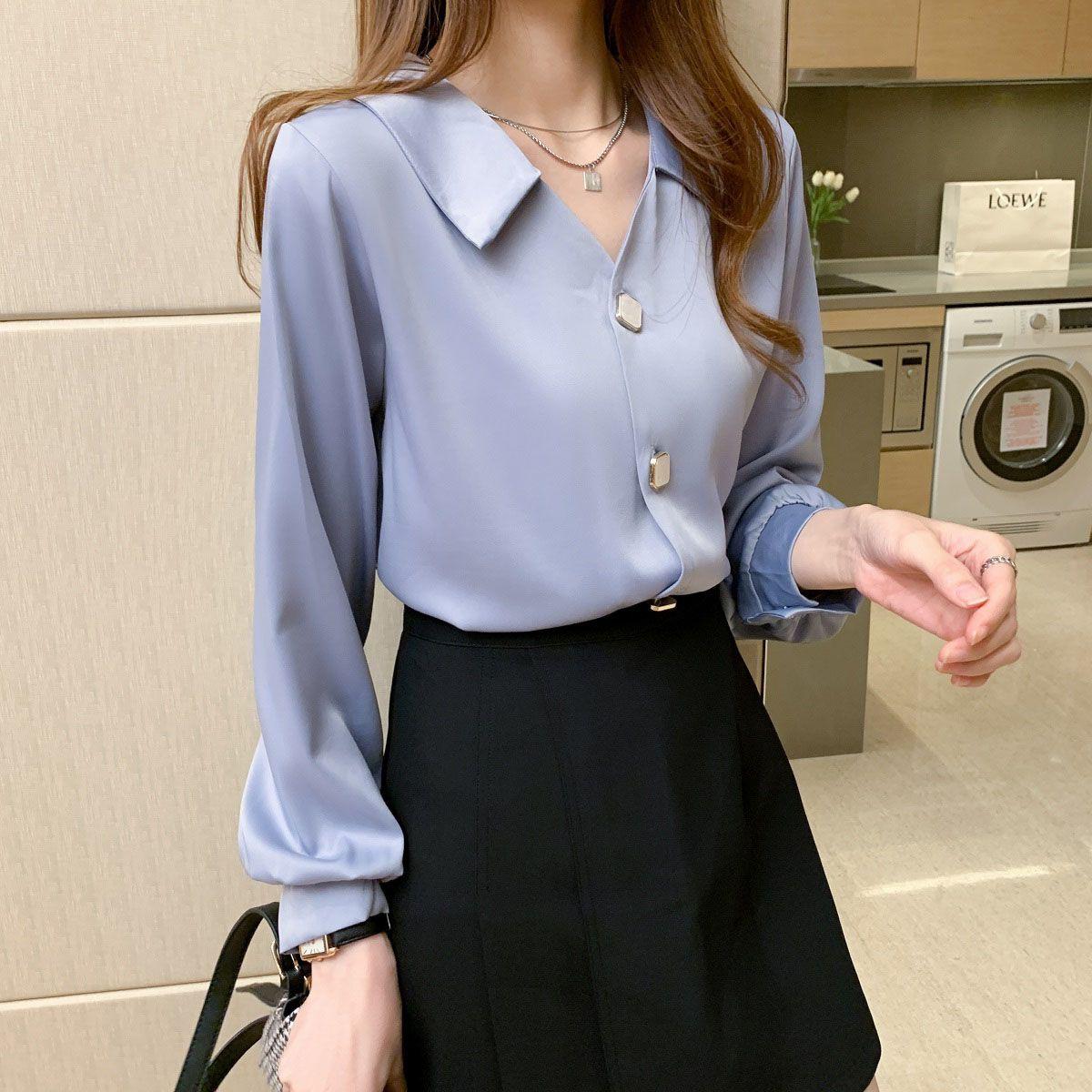 Camisa Delgada de Primavera y Otoño Cuello en V Chifón Camisa Blanca para Mujer Manga Larga Holgada Combinable Color Sólido Top