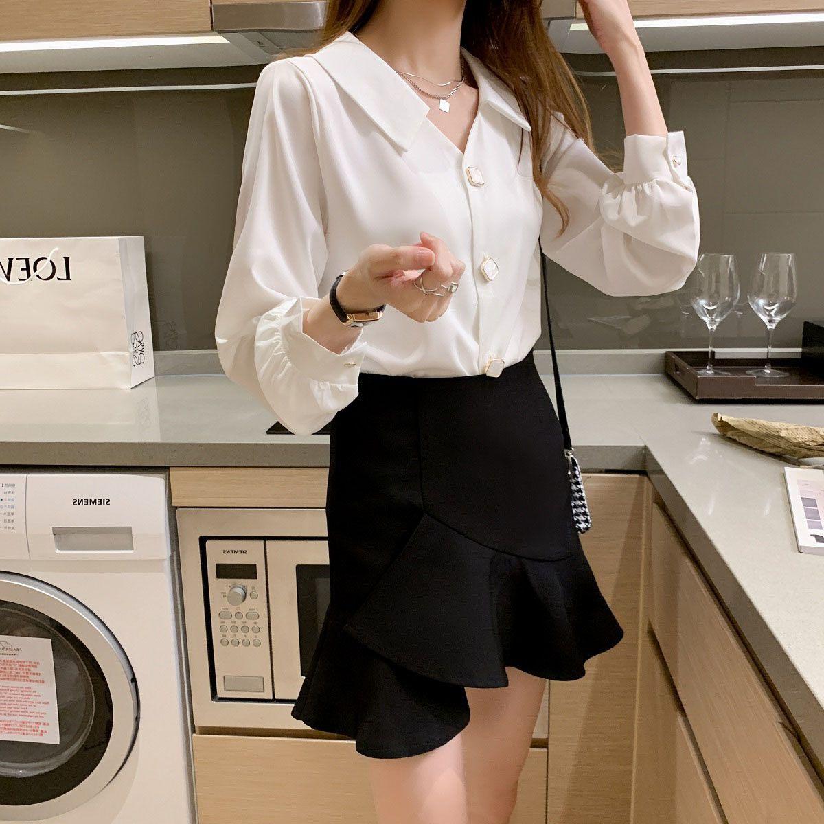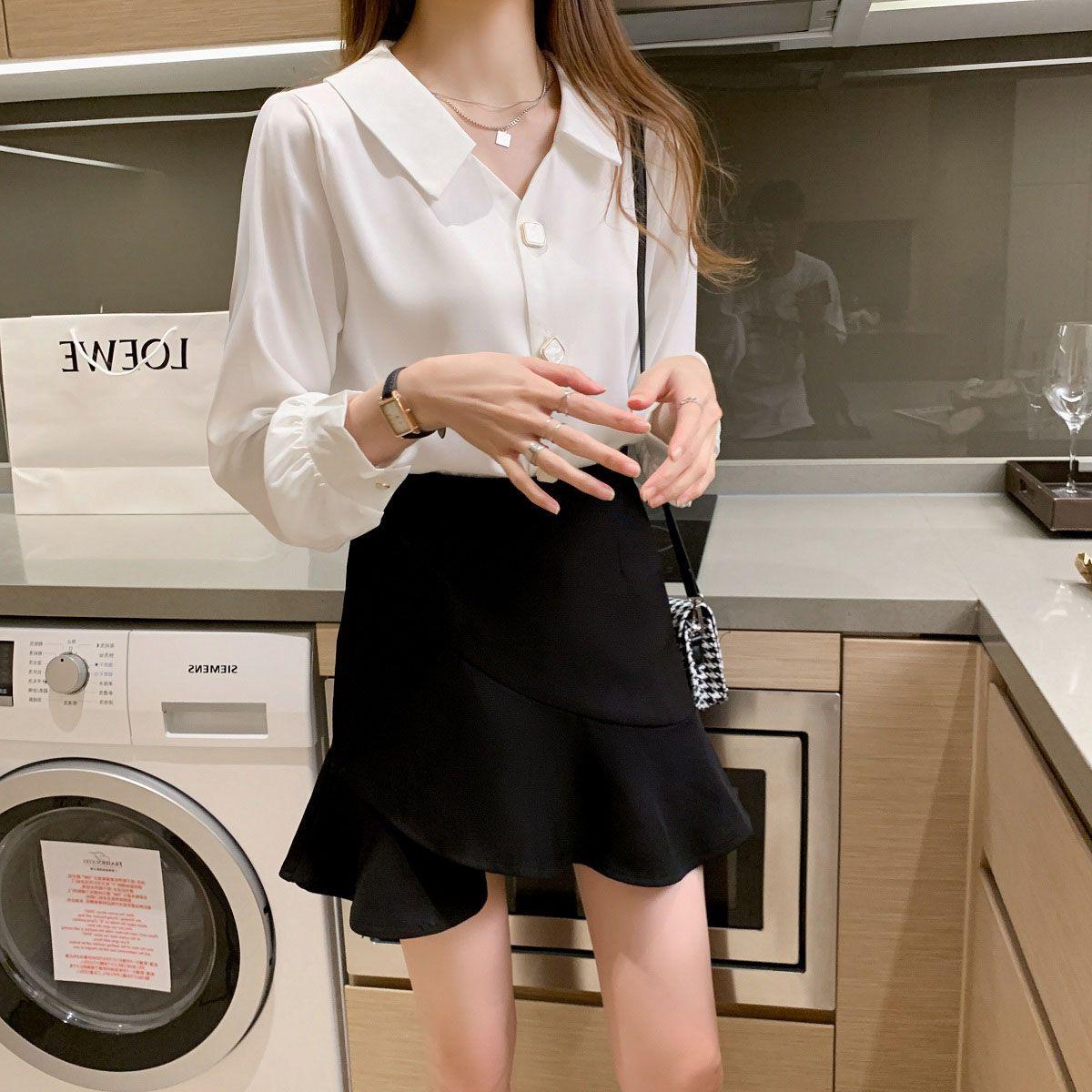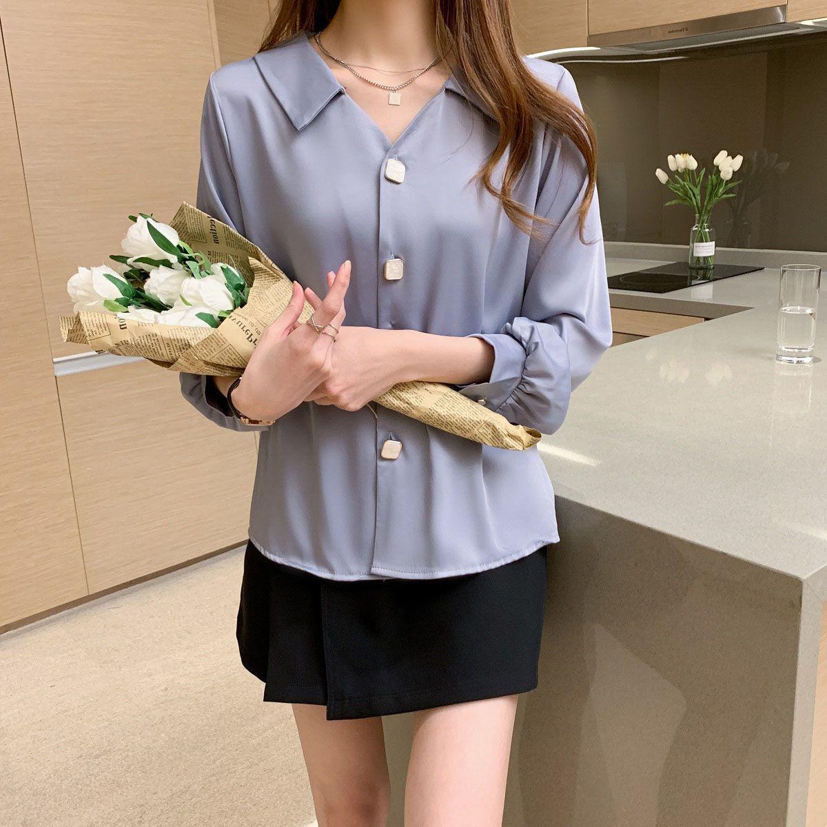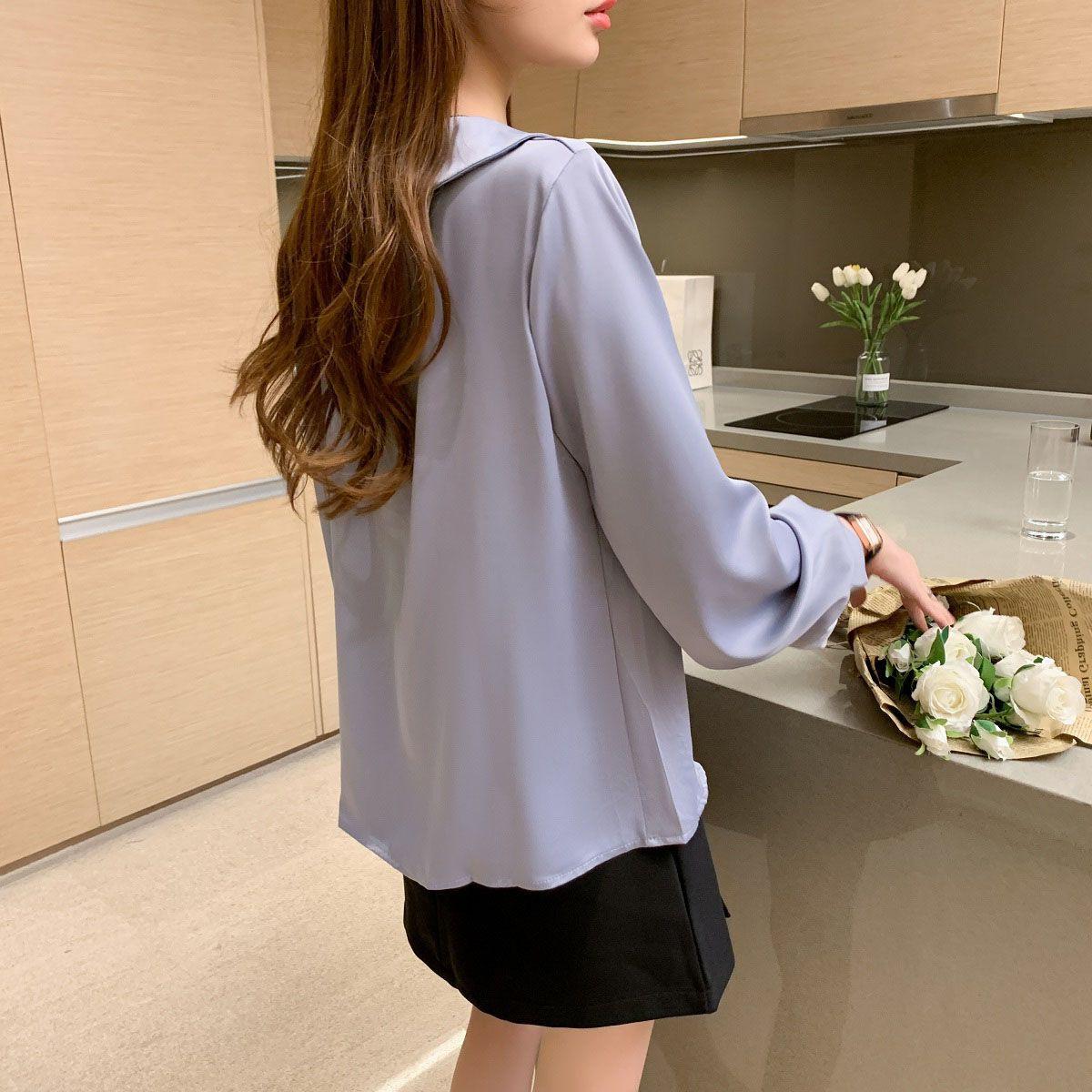 Camisa Delgada de Primavera y Otoño Cuello en V Chifón Camisa Blanca para Mujer Manga Larga Holgada Combinable Color Sólido Top