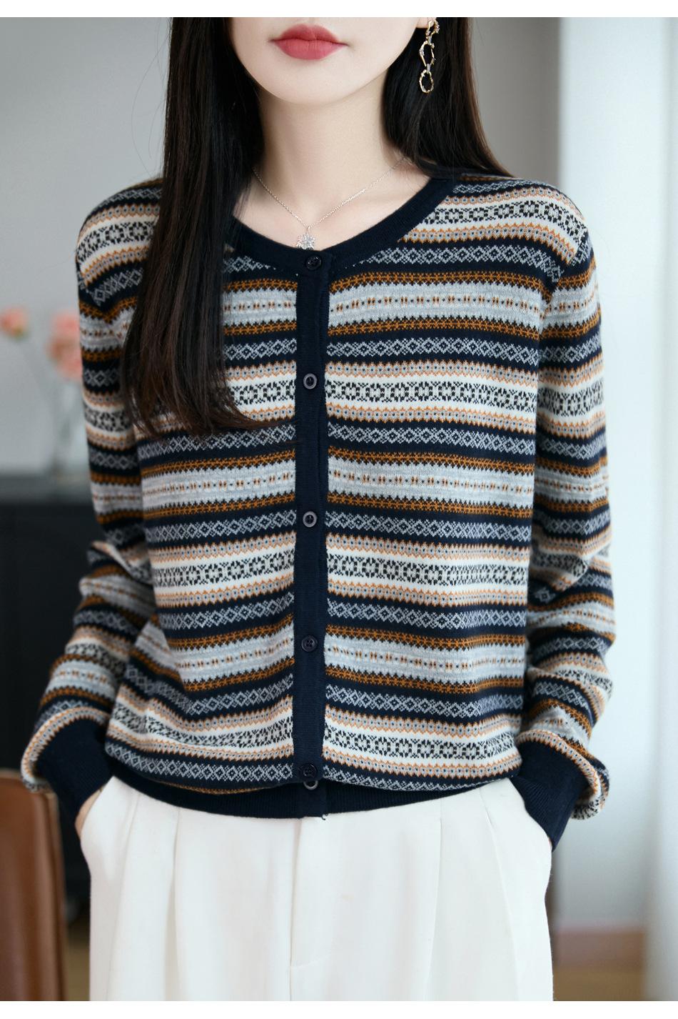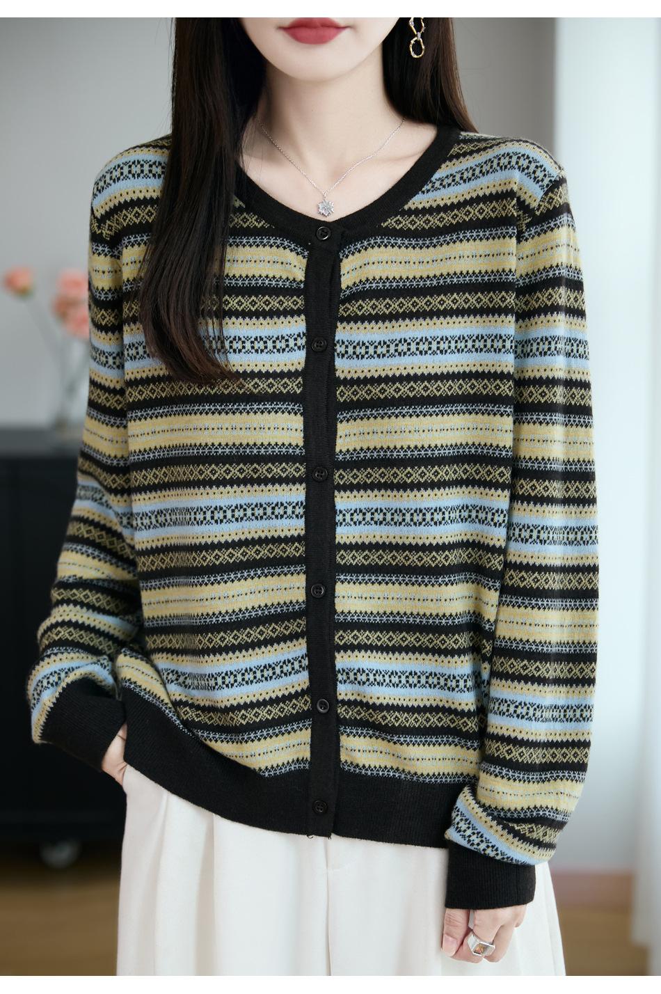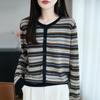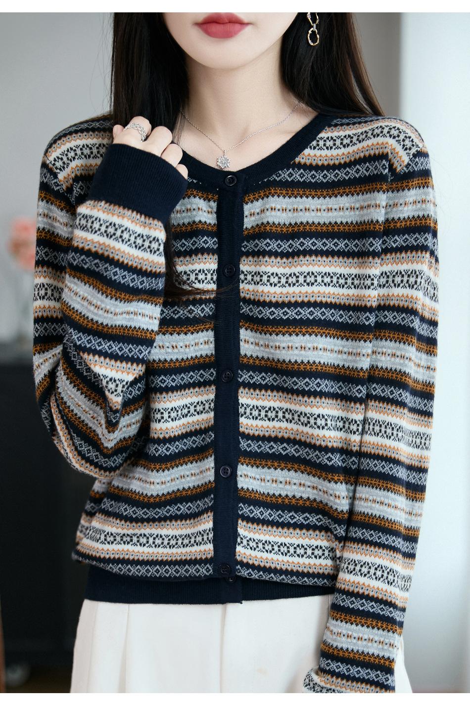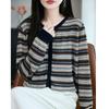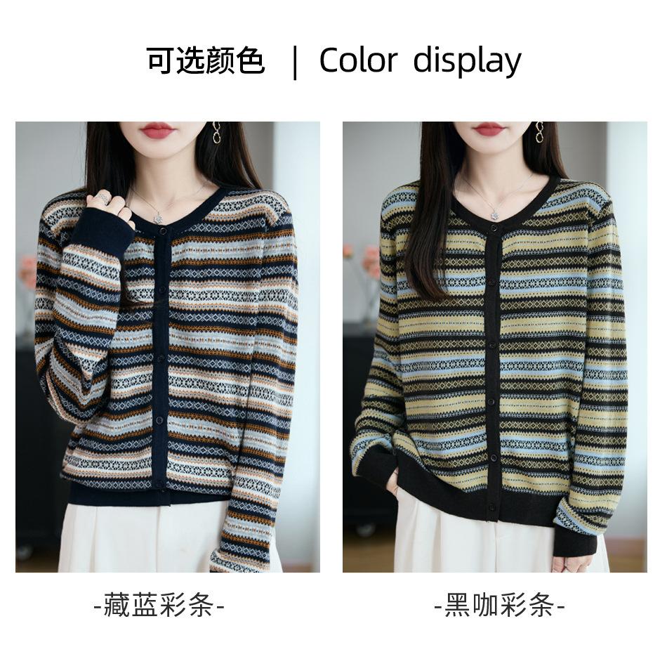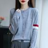 Cárdigan de punto de lana fina retro de otoño temprano 2025 con cuello redondo y manga larga para mujer, top holgado versátil con bloques de color