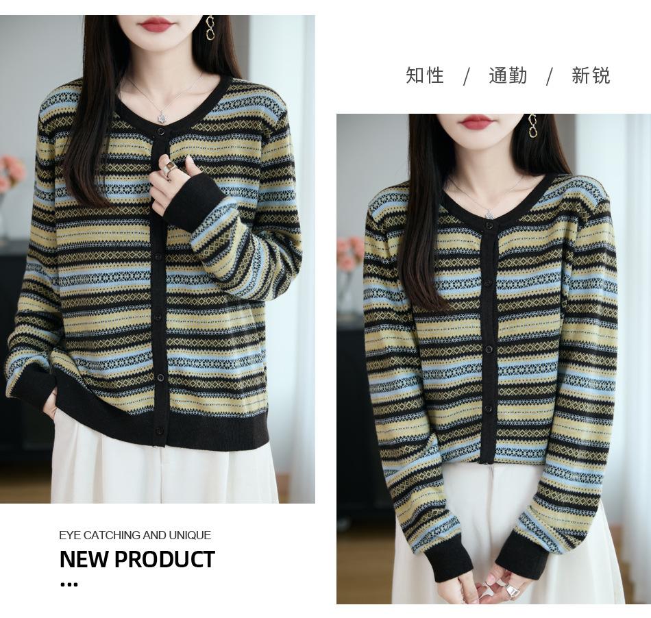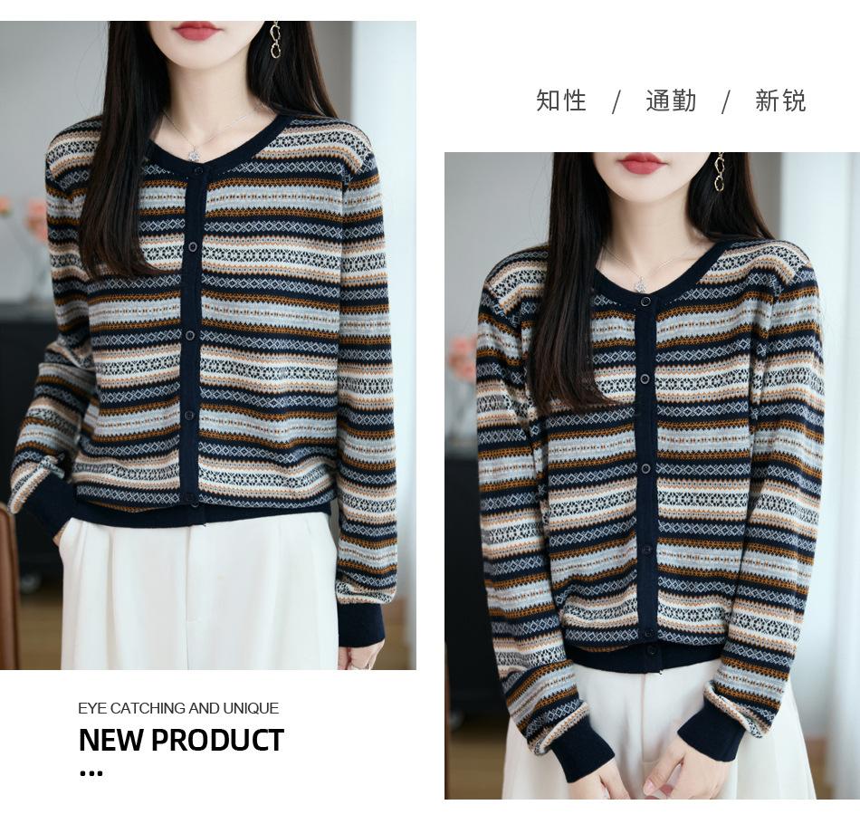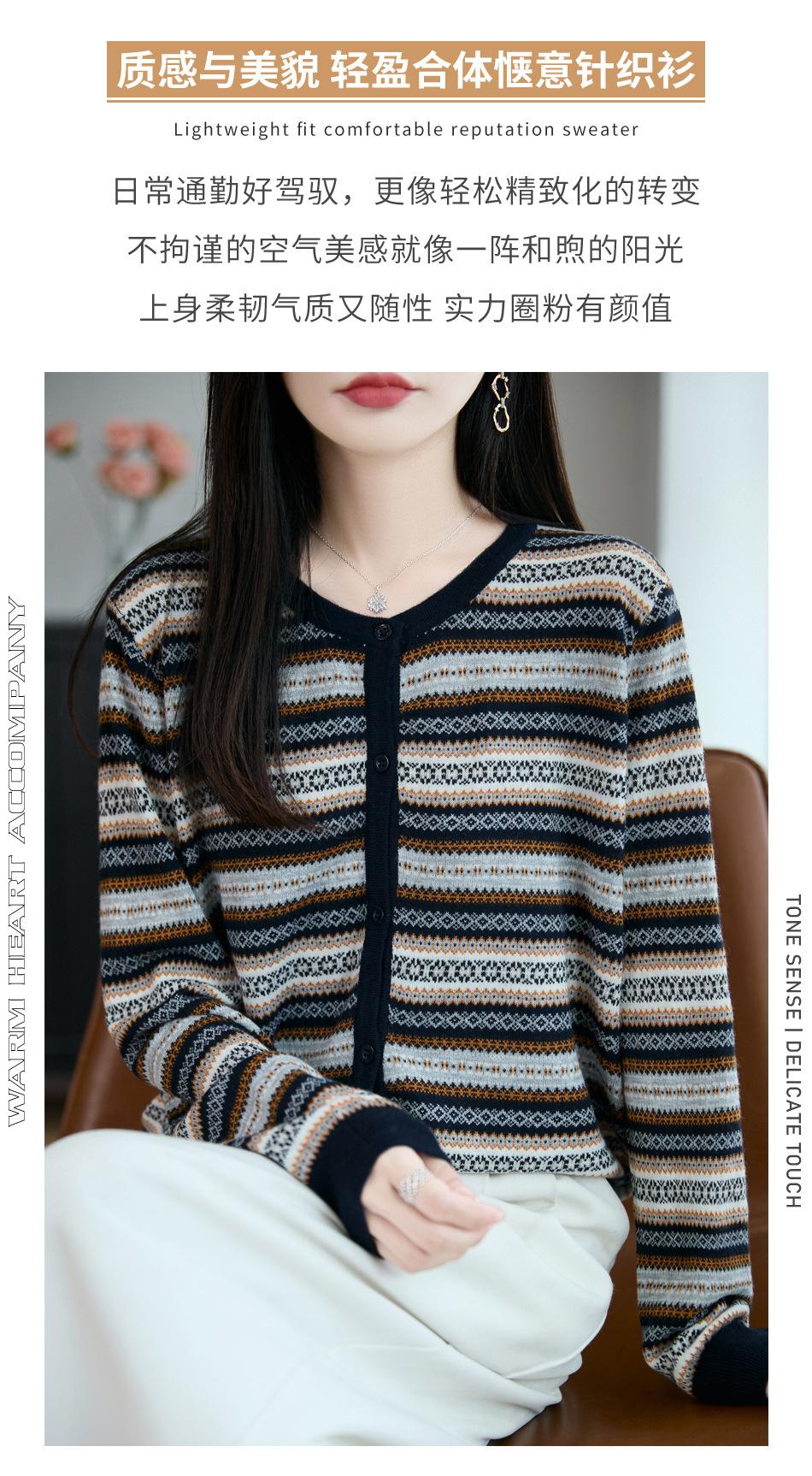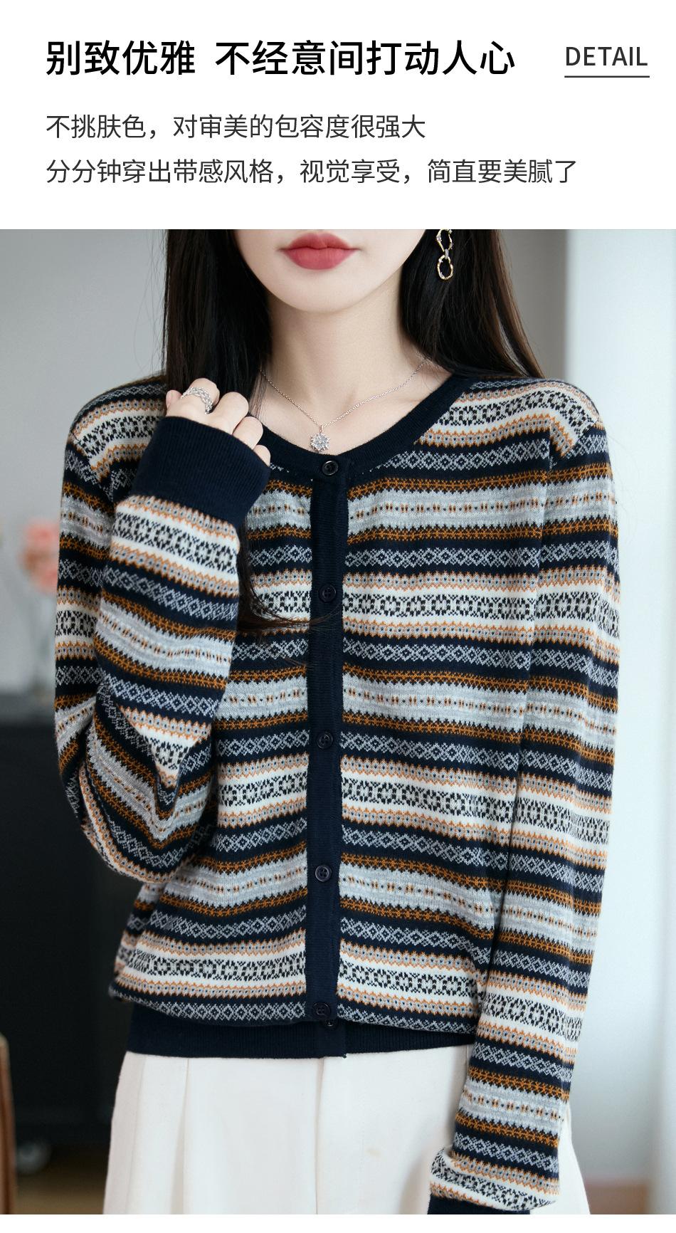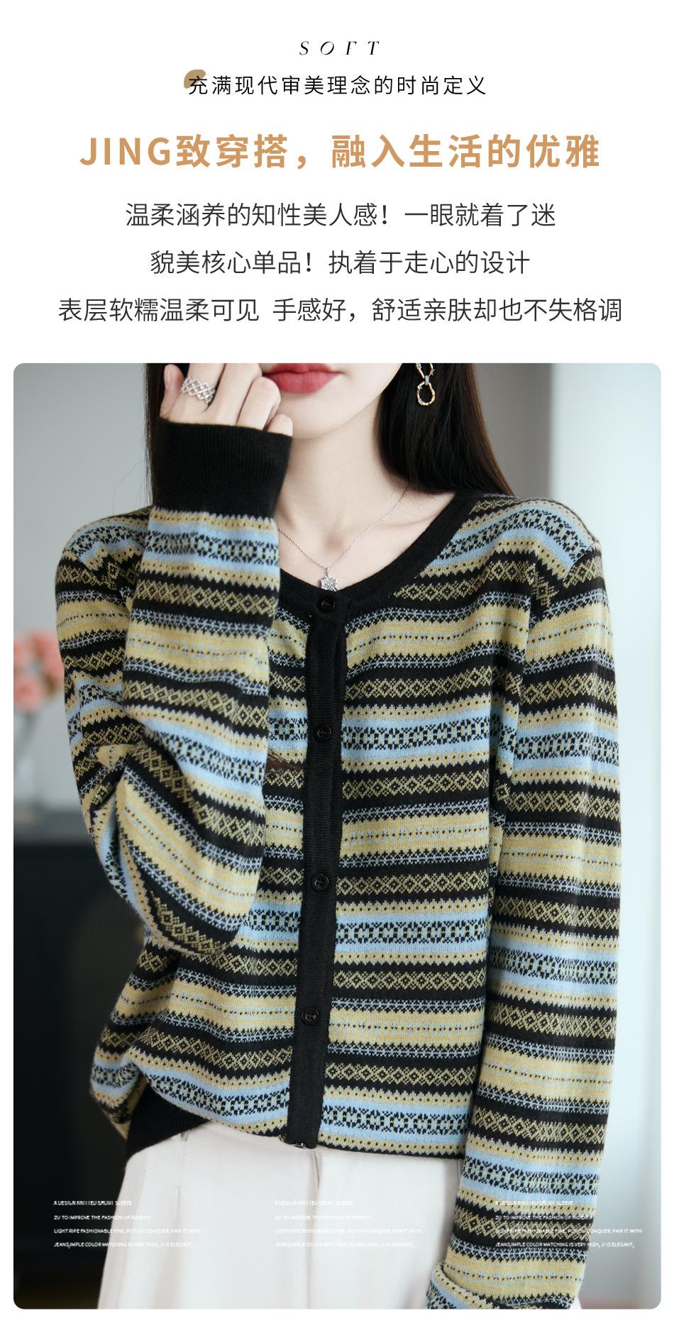 Cárdigan de punto de lana fina retro de otoño temprano 2025 con cuello redondo y manga larga para mujer, top holgado versátil con bloques de color