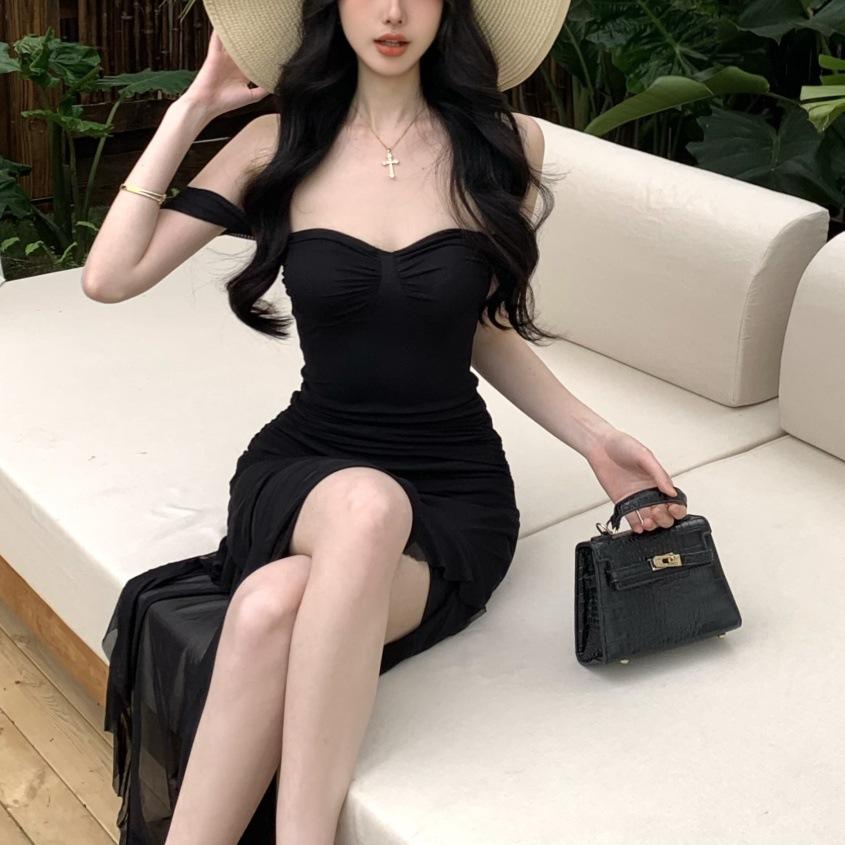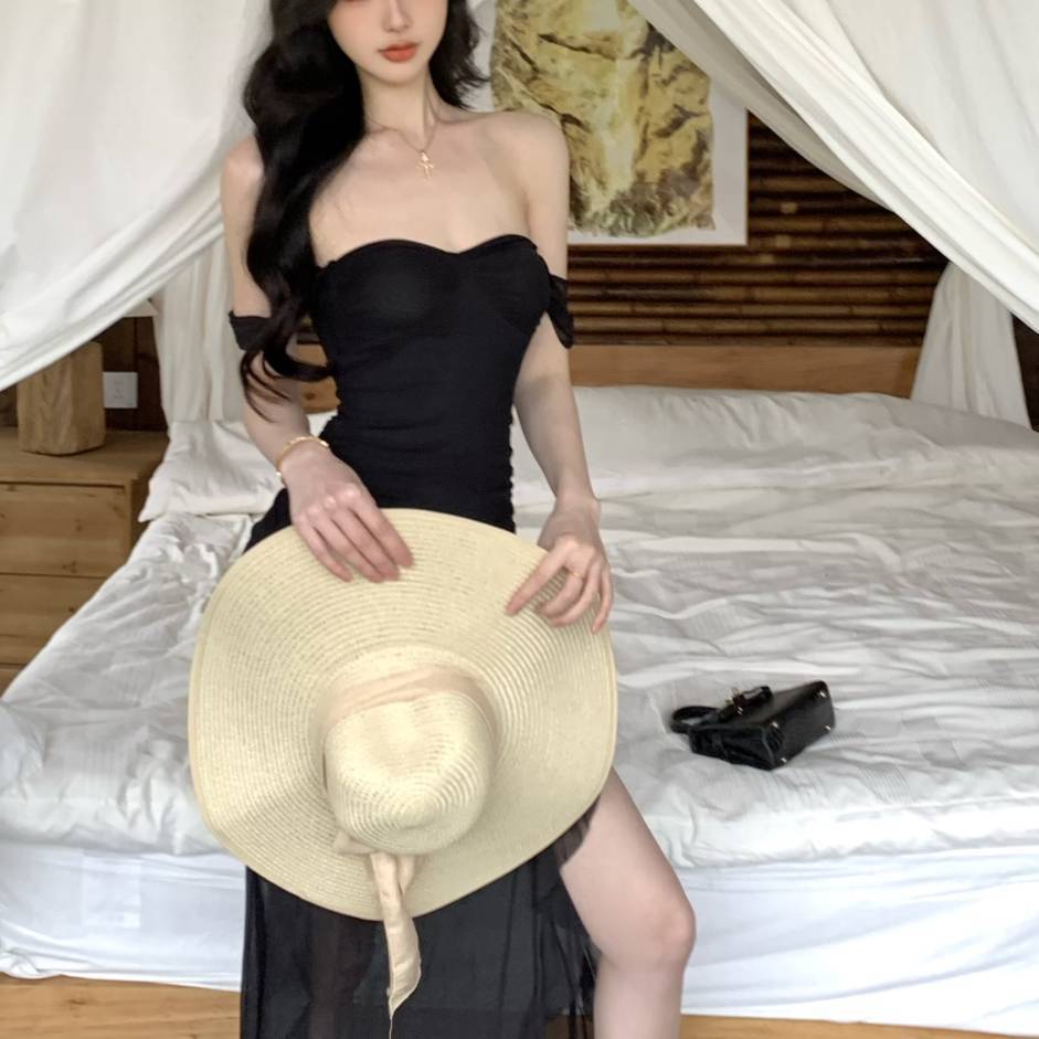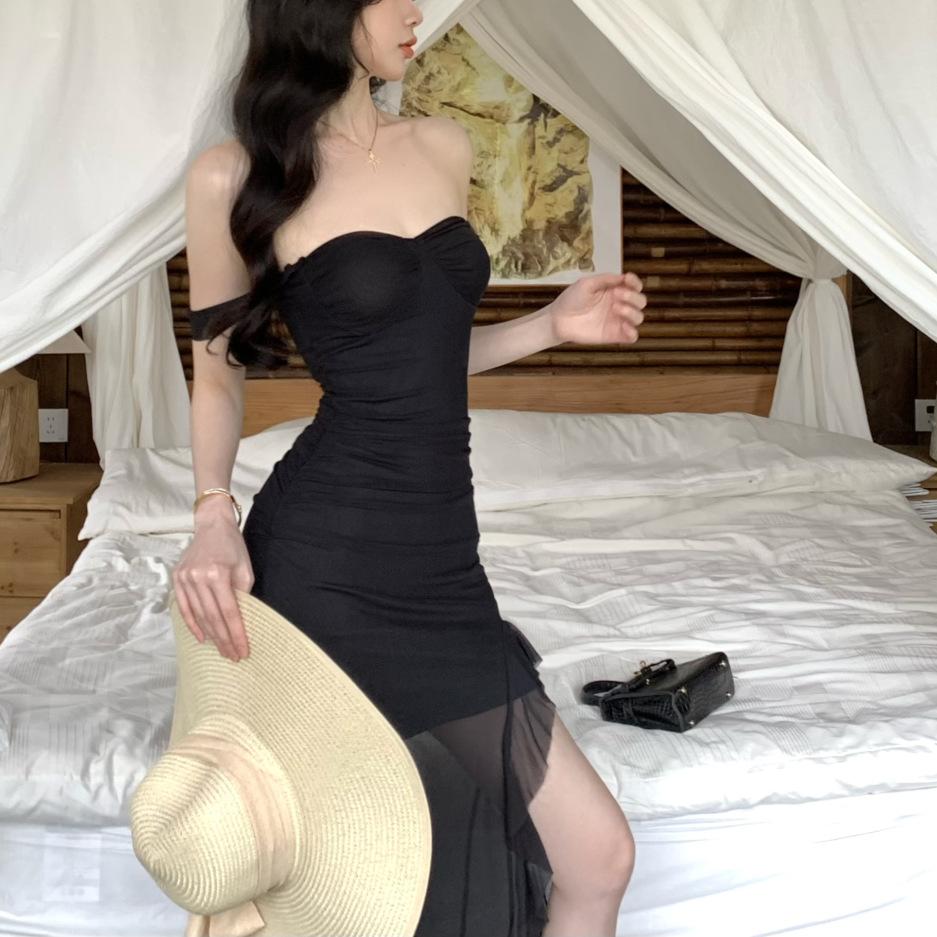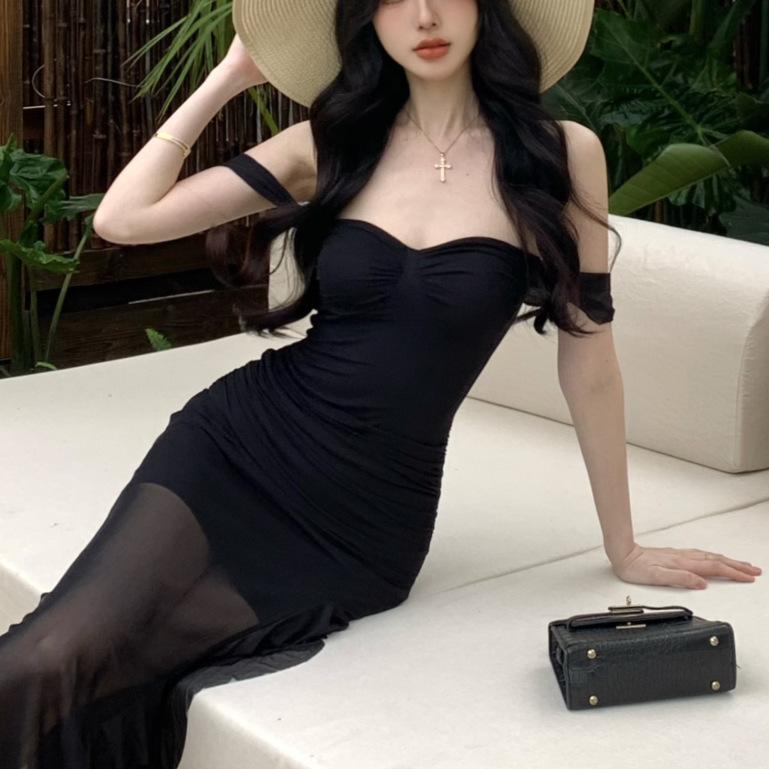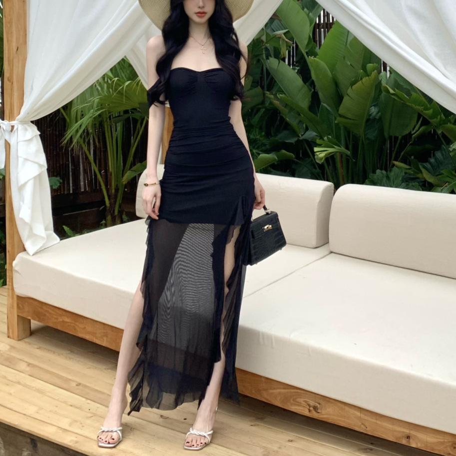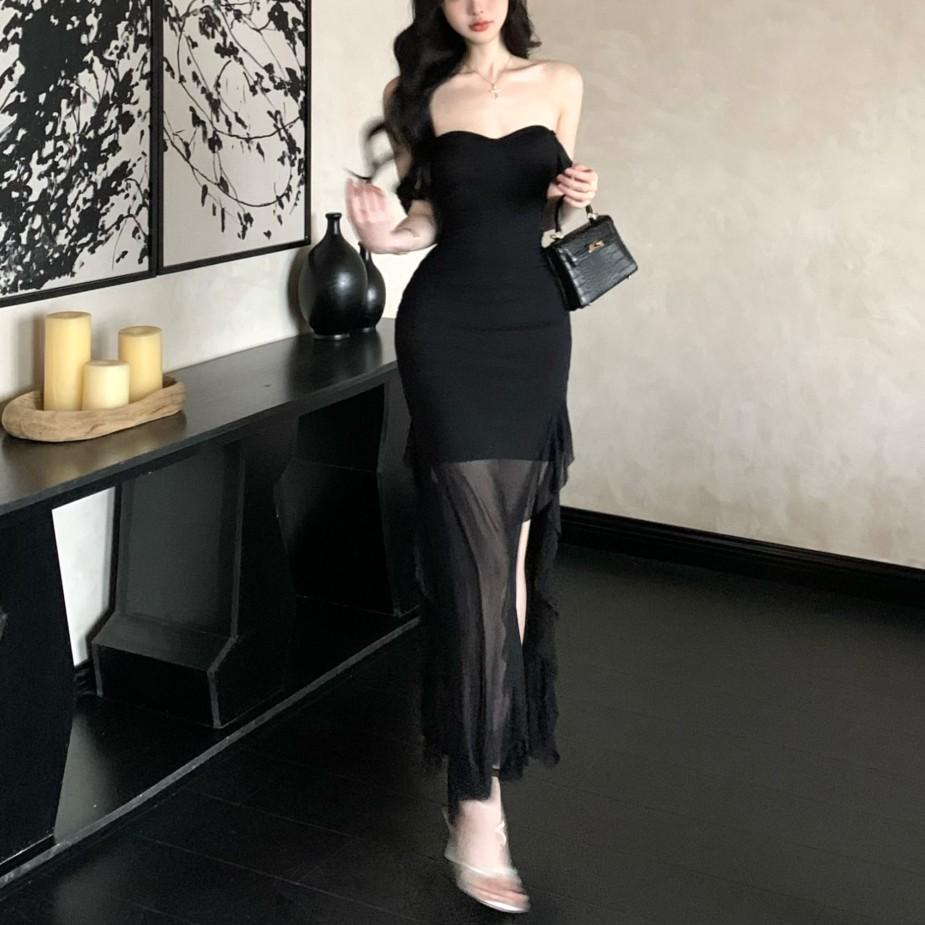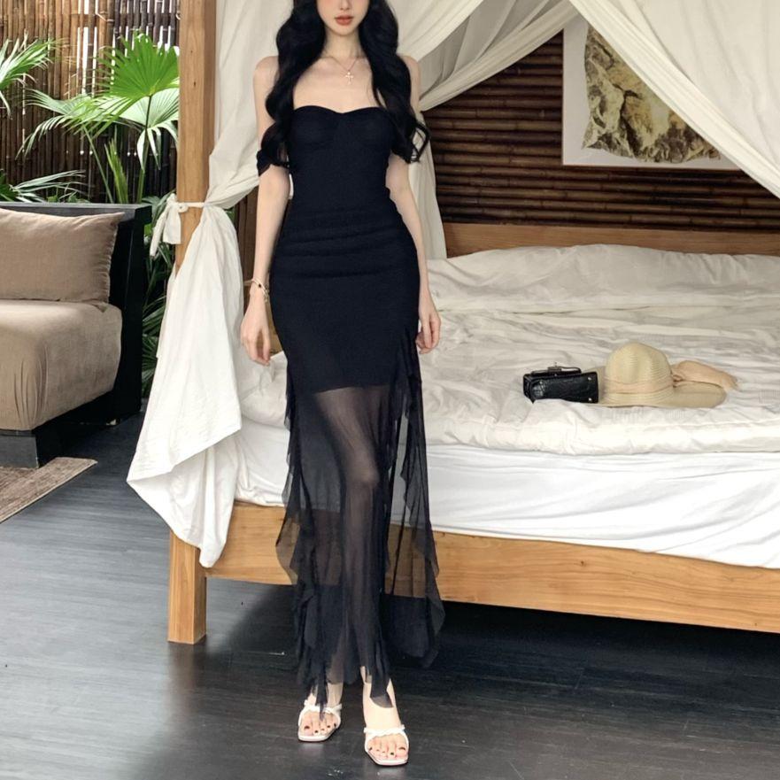 Vestido negro sin mangas strapless con hombros descubiertos para mujer verano patchwork de malla falda cola de pez vestido ajustado bodycon vestido largo