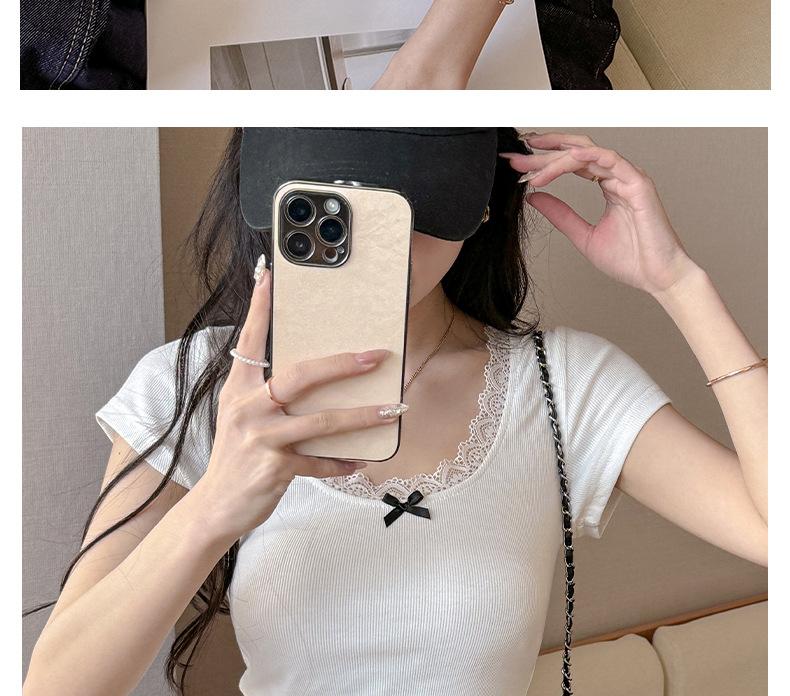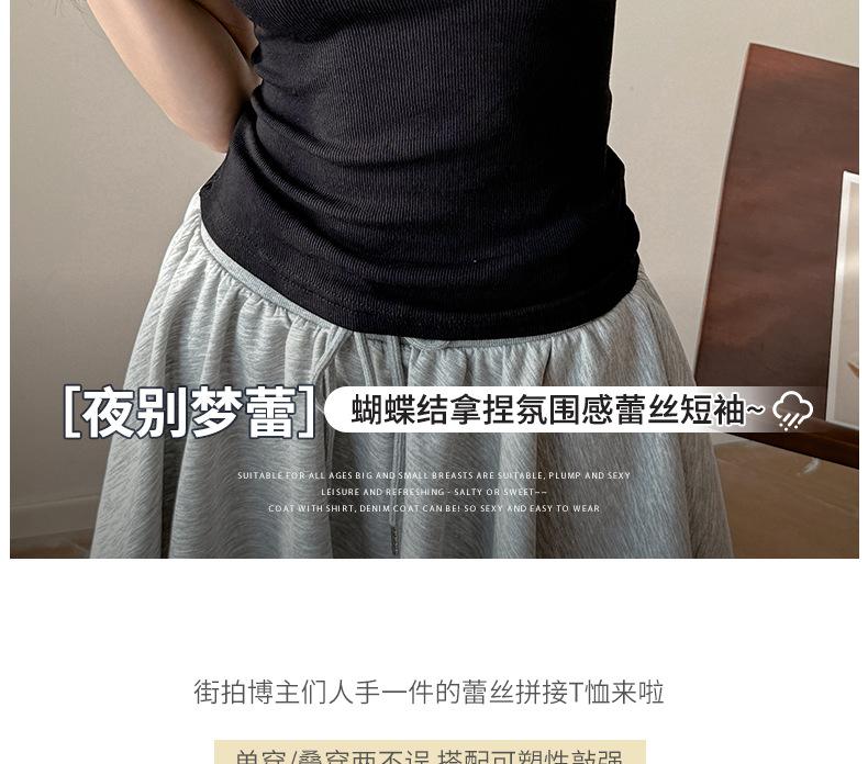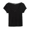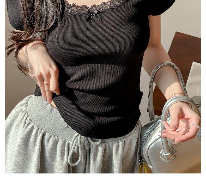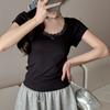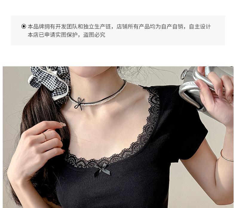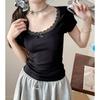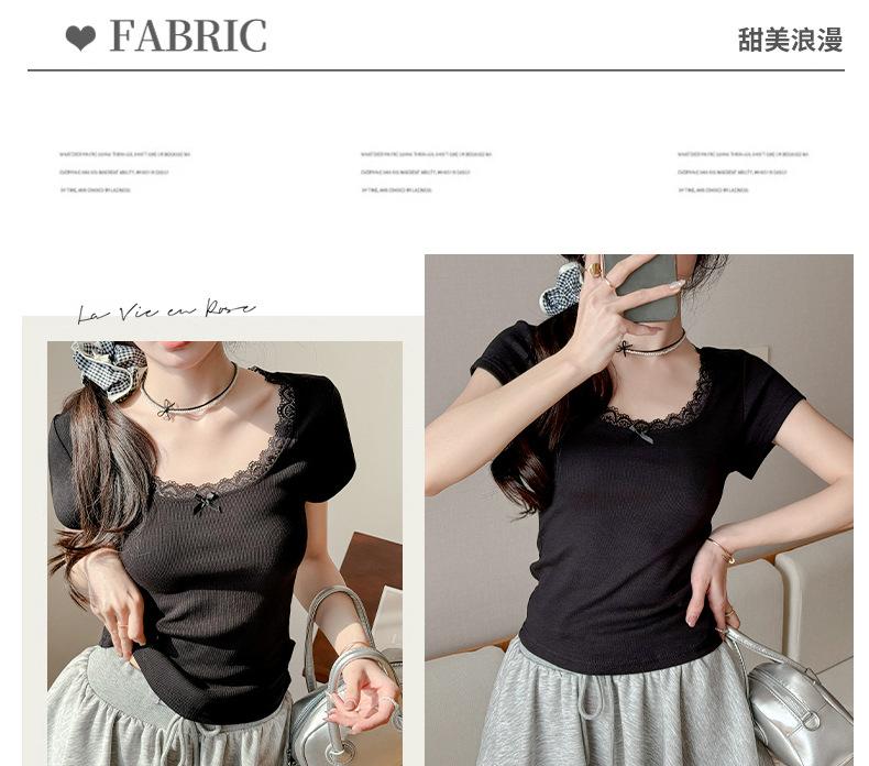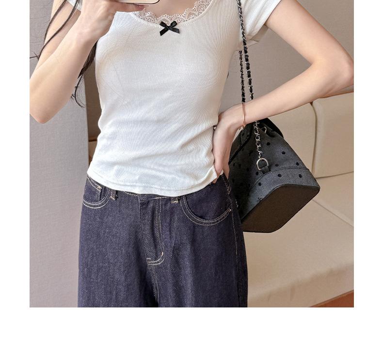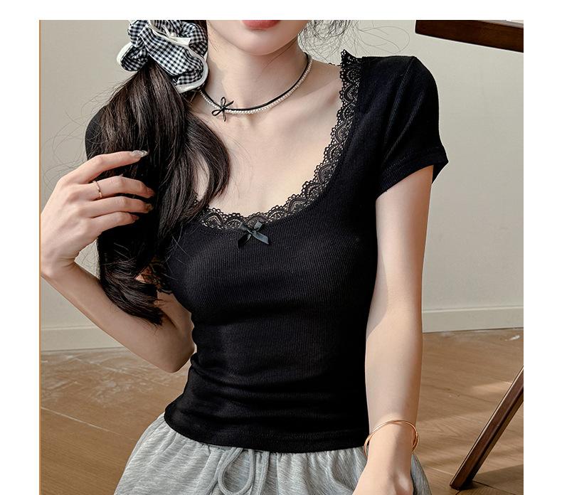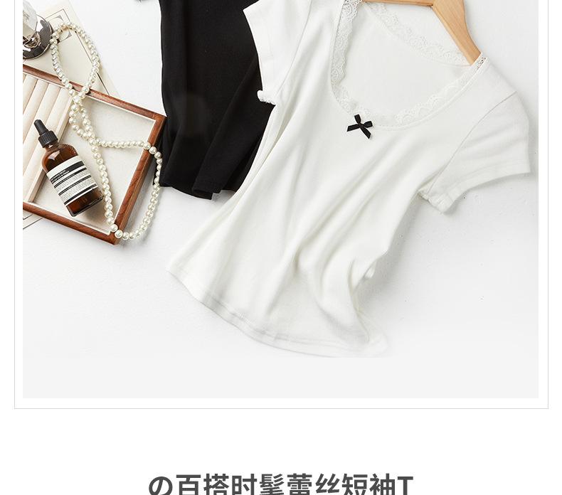 Blanco de Fábrica Sexy Estilo Deseo Puro Encaje Lazo Cuello Redondo Hombro Manga Corta Verano de Mujer Combinable Camiseta Casual
