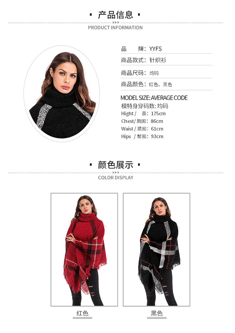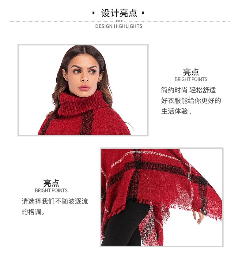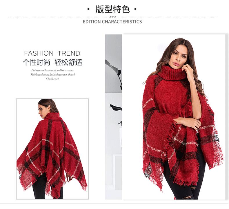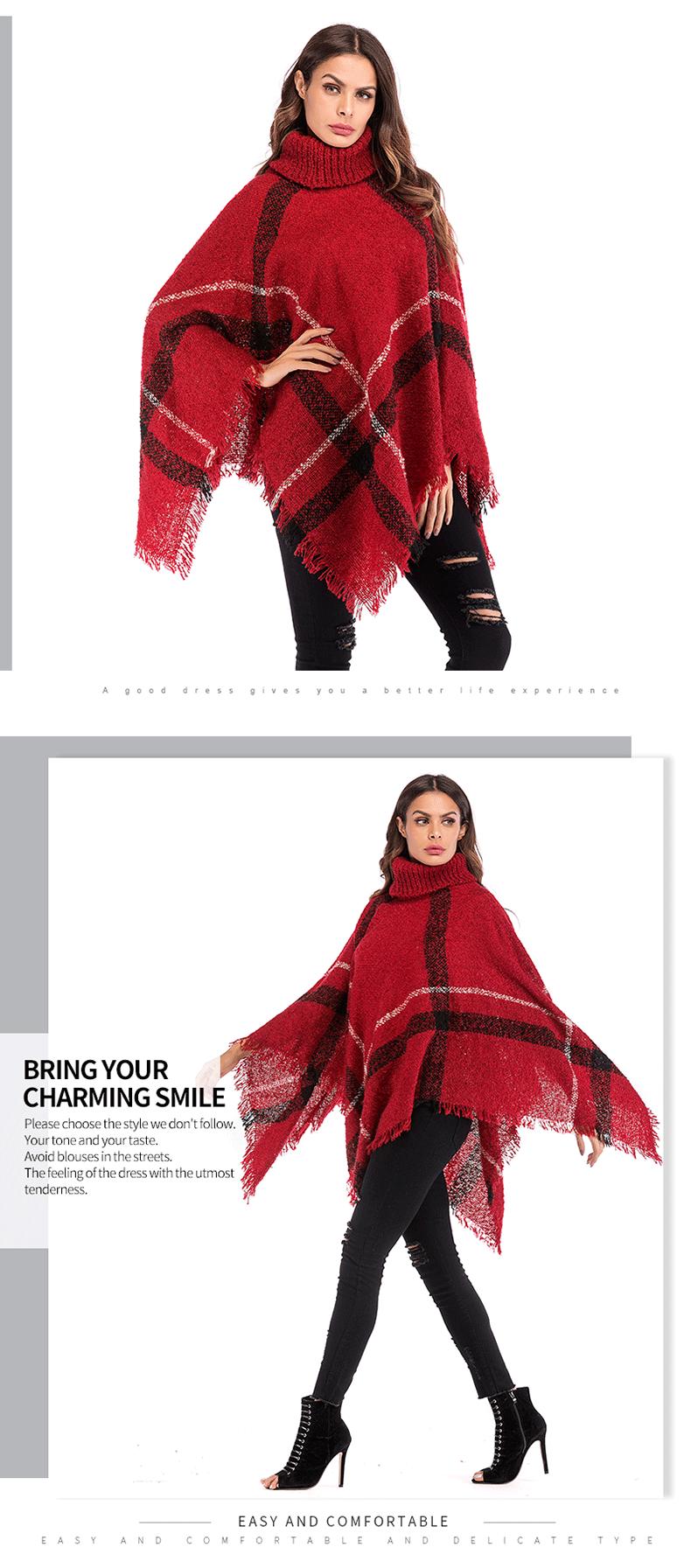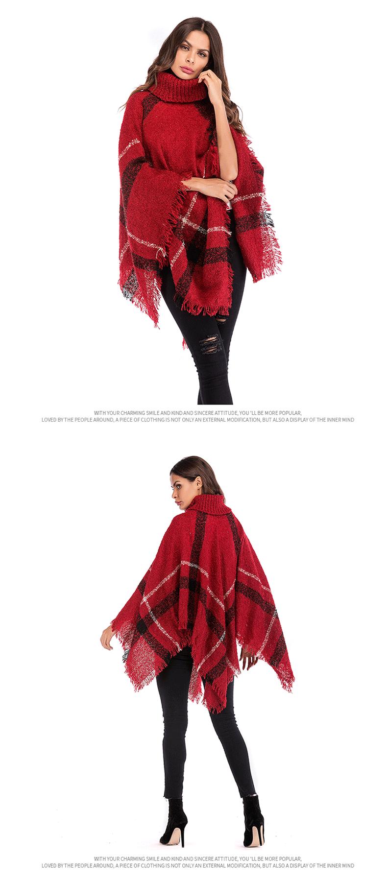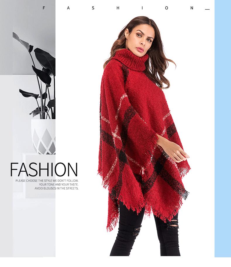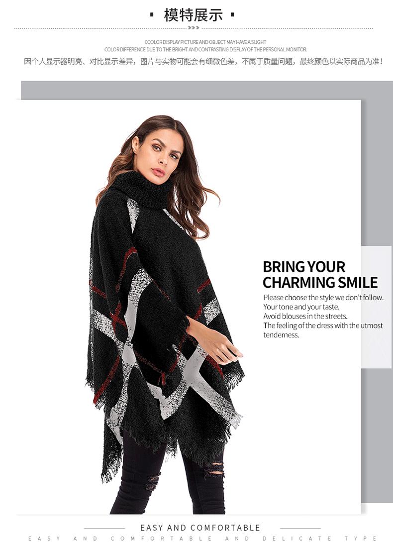 Otoño e invierno capa chal irregular para mujer comercio exterior europeo y americano nuevo a cuadros borla cuello alto jersey suéter de punto